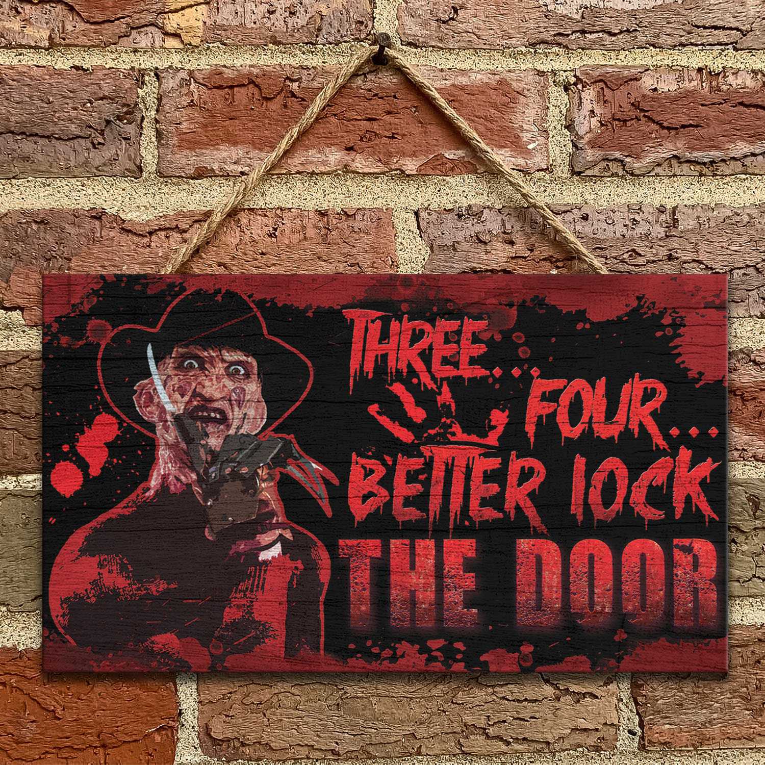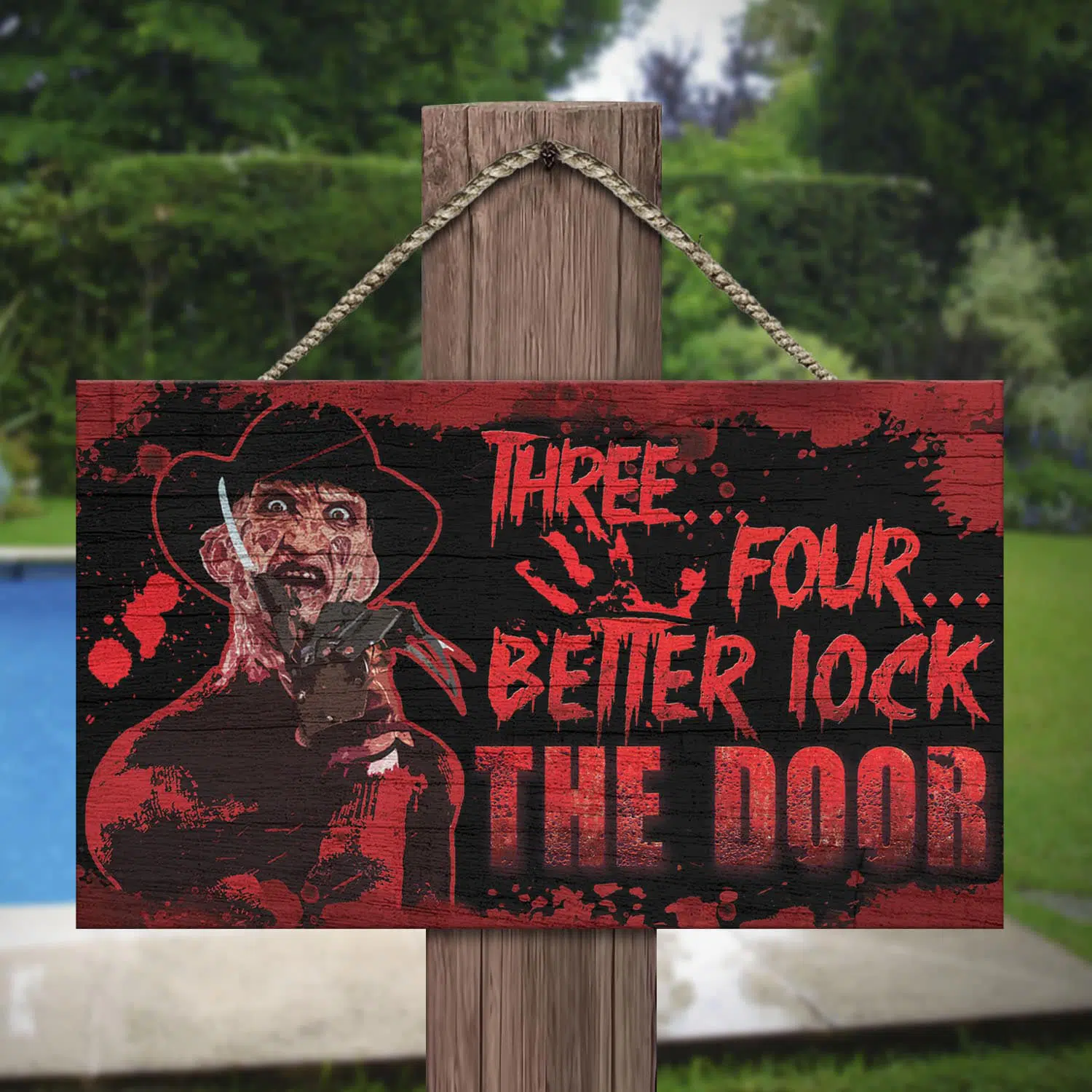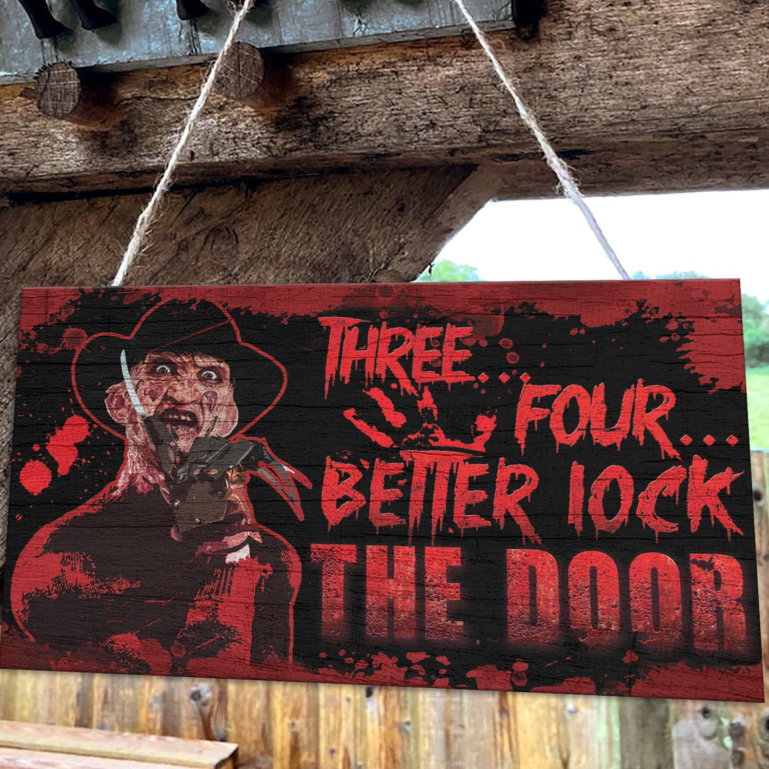 Let’s Shop Three Four Better Lock The Door Halloween Freddy Krueger Wooden Door Sign – Indoor Outdoor Front Porch Sign!