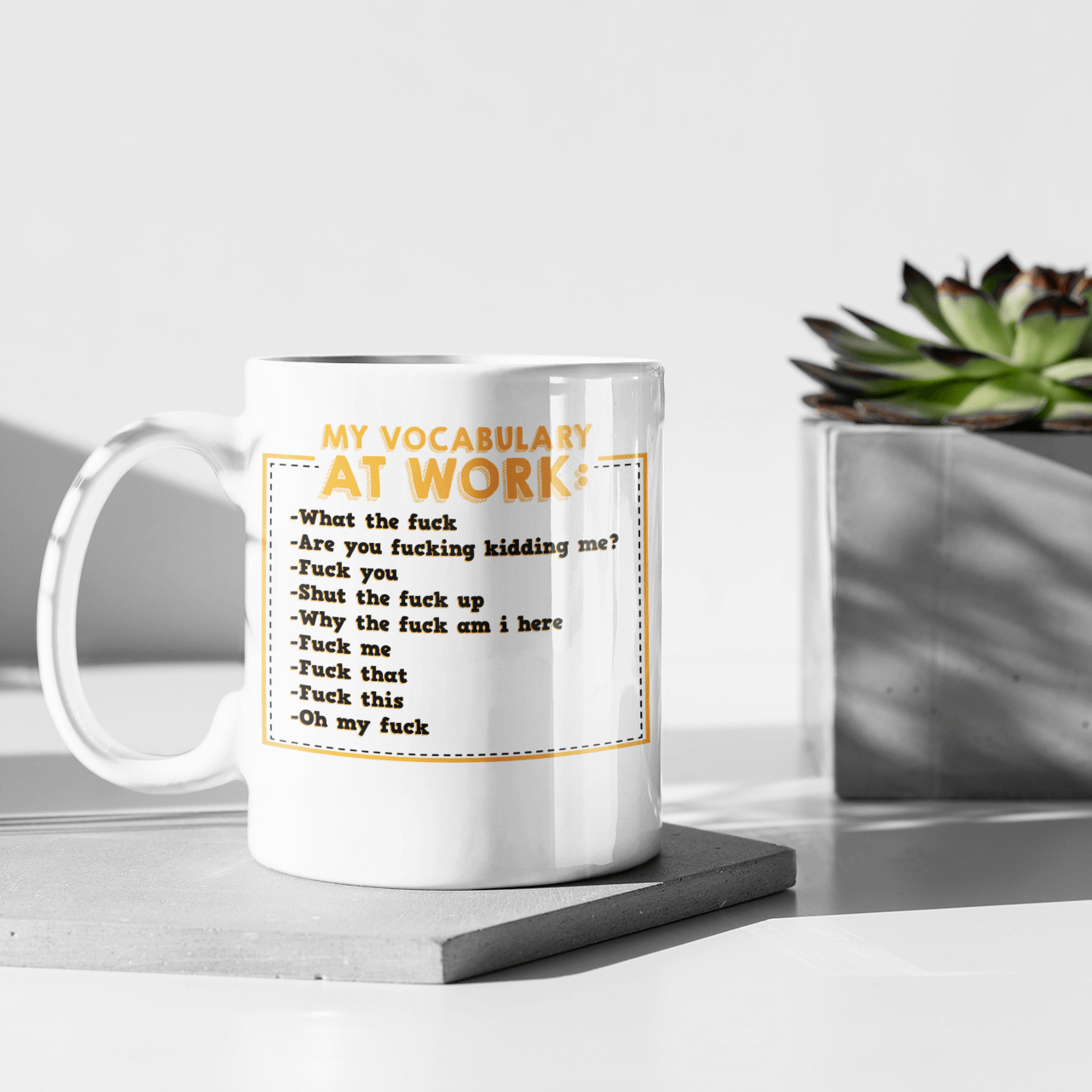 Are you spending too much time to find creative merchandise for you or suitable & special gifts for your mommy, your daddy, your son, your daughter, your children, your friends or someone you love? The struggle is over because we have various My Vocabulary at Work Mug, Work Mug, Funny Social Work Memes, Work Mugs, Funny Mug at Work, Funny Mug for Colleague, Funny Mugs for Work Colleagues, Mugs for Coworkers Leaving, Colleague Mug which will make perfect presents for your beloveds. In order to make your present stand out, we have created lots of unique and awesome customized photo gifts & personalized designs.