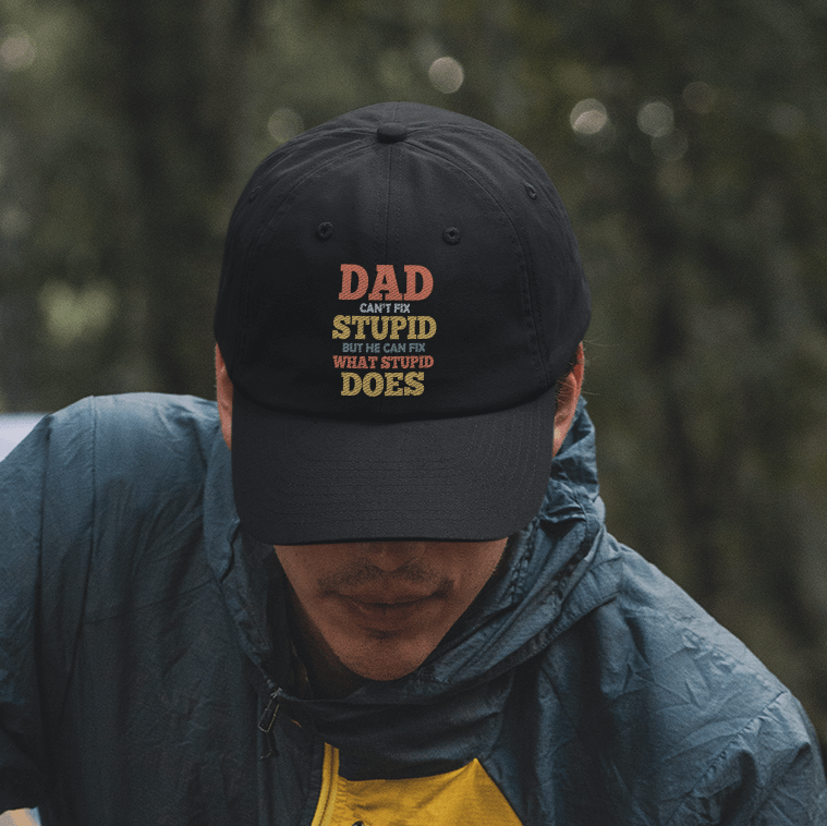Let’s Shop Dad Can’t Fix Stupid but He Can Fix What Stupid Does Funny Twill Cap – High-Profile Snapback Hat – Trucker Hat!