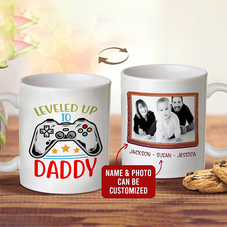 Let’s Shop Personalized Photo Leveled up To Daddy Video Game Controller Fathers Day Two Sided Ceramic Coffee Mug!