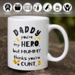 At CubeBik, besides mugs, we also offer tees, hoodies, sweaters, raglans, tanks, wall arts, canvases, posters, blankets, engraved jewelry, personalized necklaces, printed face masks, throw pillows, tote bags, hats, accessories and more on our website, so do not miss our other Daddy You’re My Hero But Mummy Thinks You’re a Cunt, Father’s Day Gifts from Daughter, Father to Be Gifts, Fathers Day Gifts, Father’s Day Gift for Uncle, 1st Father’s Day Gift, Father Christmas Gifts, Father S Day Gifts from Wife, Father of The Bride Gifts, Father Birthday Gift, Father Daughter Shirts, Father of The Groom Gifts from Son, Like Father Like Daughter Shirt, Gifts for Dad from Daughter, Gifts for Dad Who Wants Nothing, Best Dad Ever Gifts, First Time Dad Gifts, Gifts for The New Dad related merchandise. Moreover, all the products are made-to-order and one of a kind custom designs you can’t get elsewhere in normal stores. Let’s discover CubeBik.com now and find your favorite personalized items. We can’t wait to surprise and build beautiful memories with you and your loved ones.