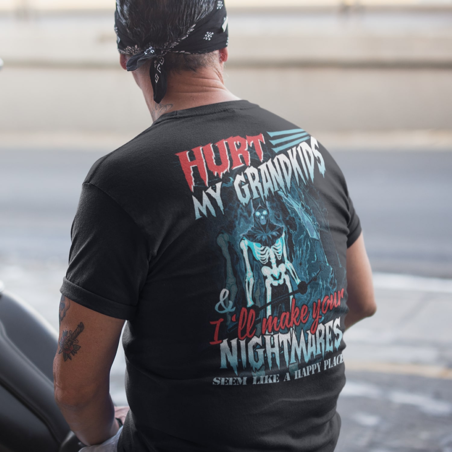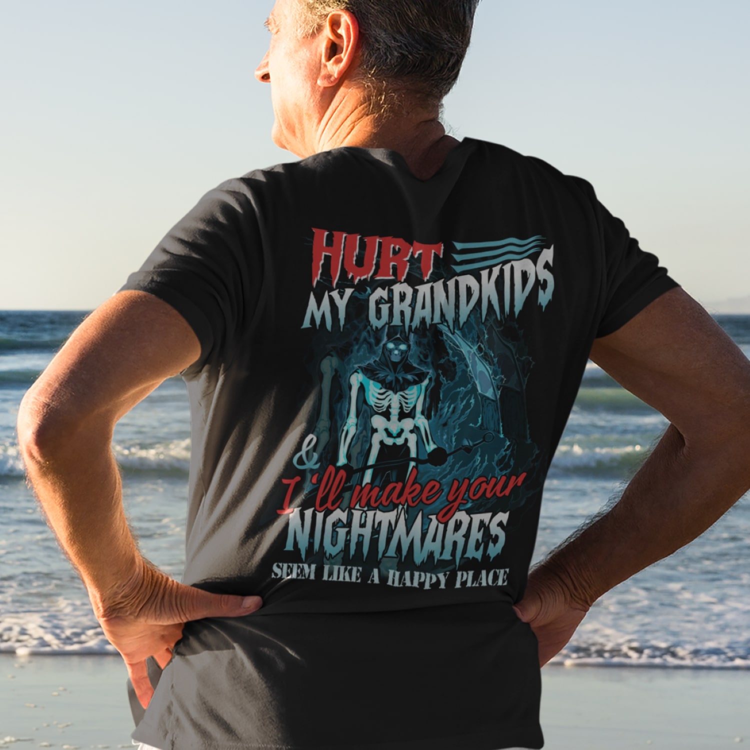 Hurt My Grandkids And I’ll Make Your Nightmares Seem Like A Happy Place Funny Grandpa Print On Back T-Shirt Only