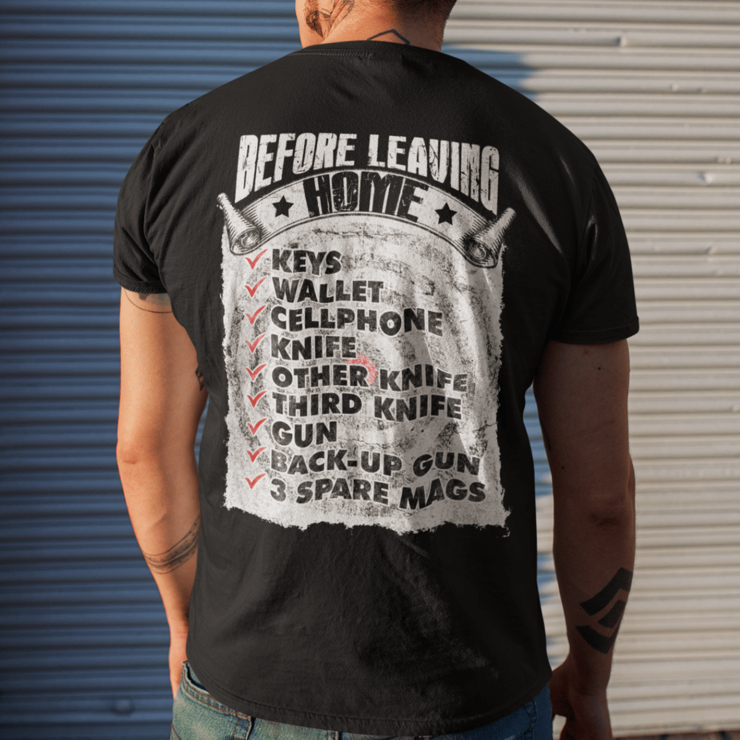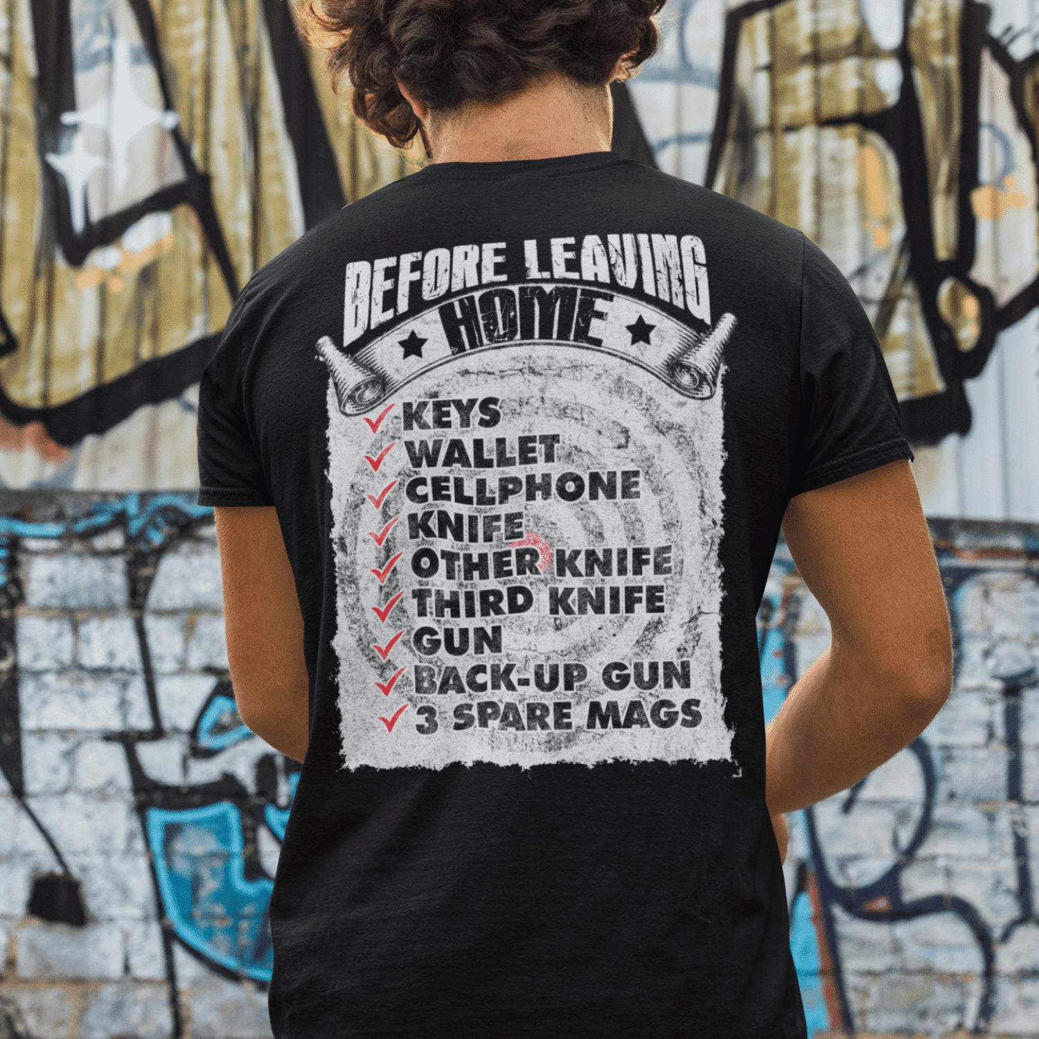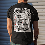 Before Leaving Home Keys Wallet Cellphone Gun Back-up Gun 3 Spare Mags Funny Gun Print On Back T-Shirt Only
