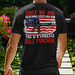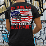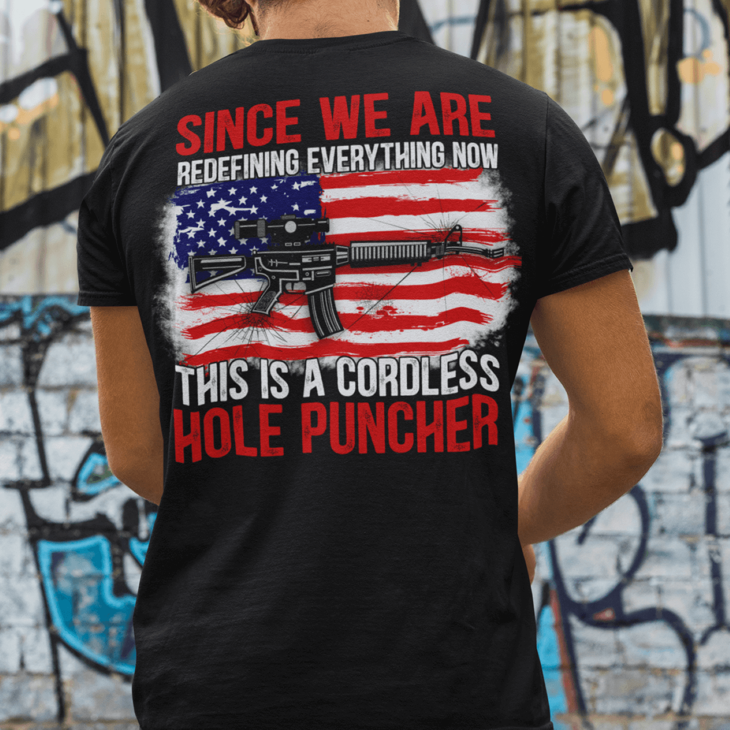 Since We Are Redefining Everything Now This Is A Cordless Hole Puncher Funny Gun American Flag Print On Back T-Shirt
