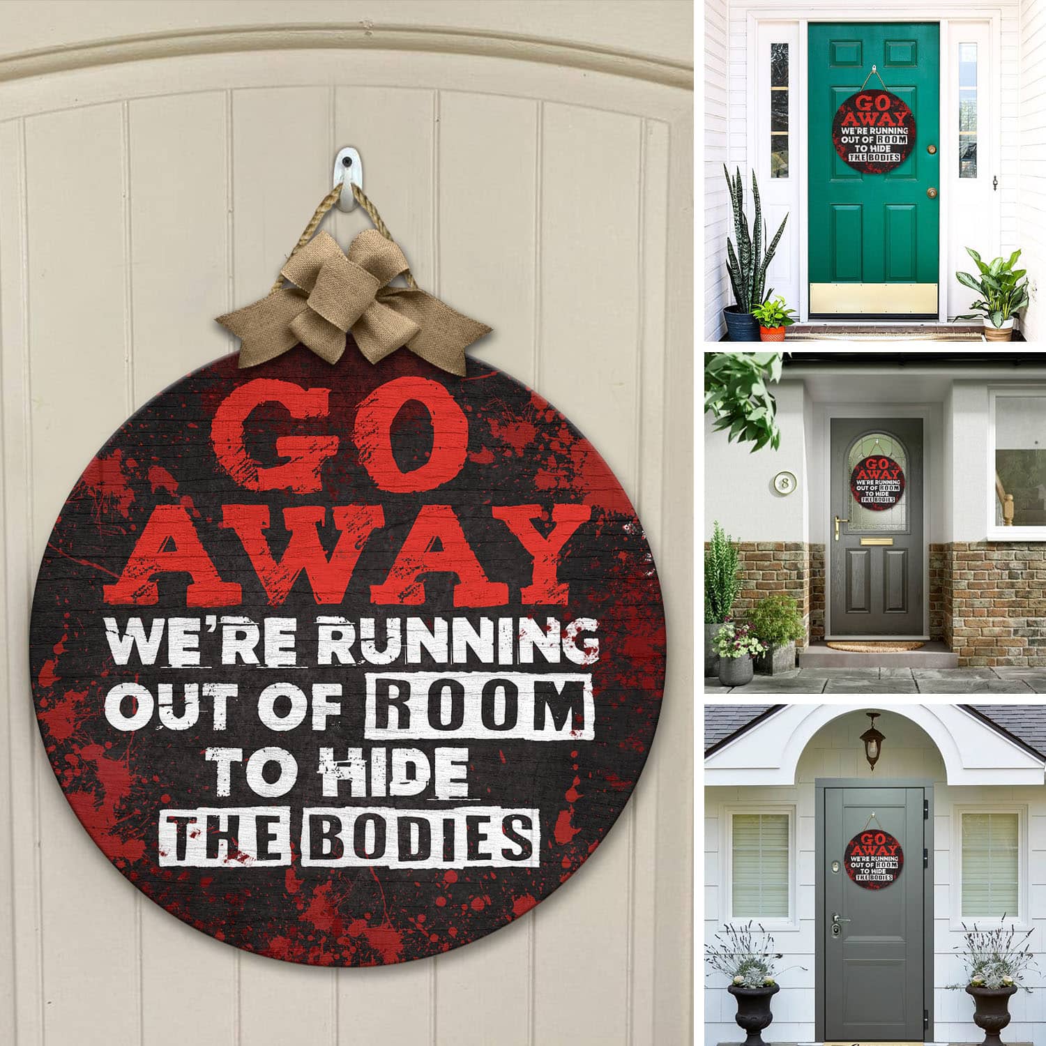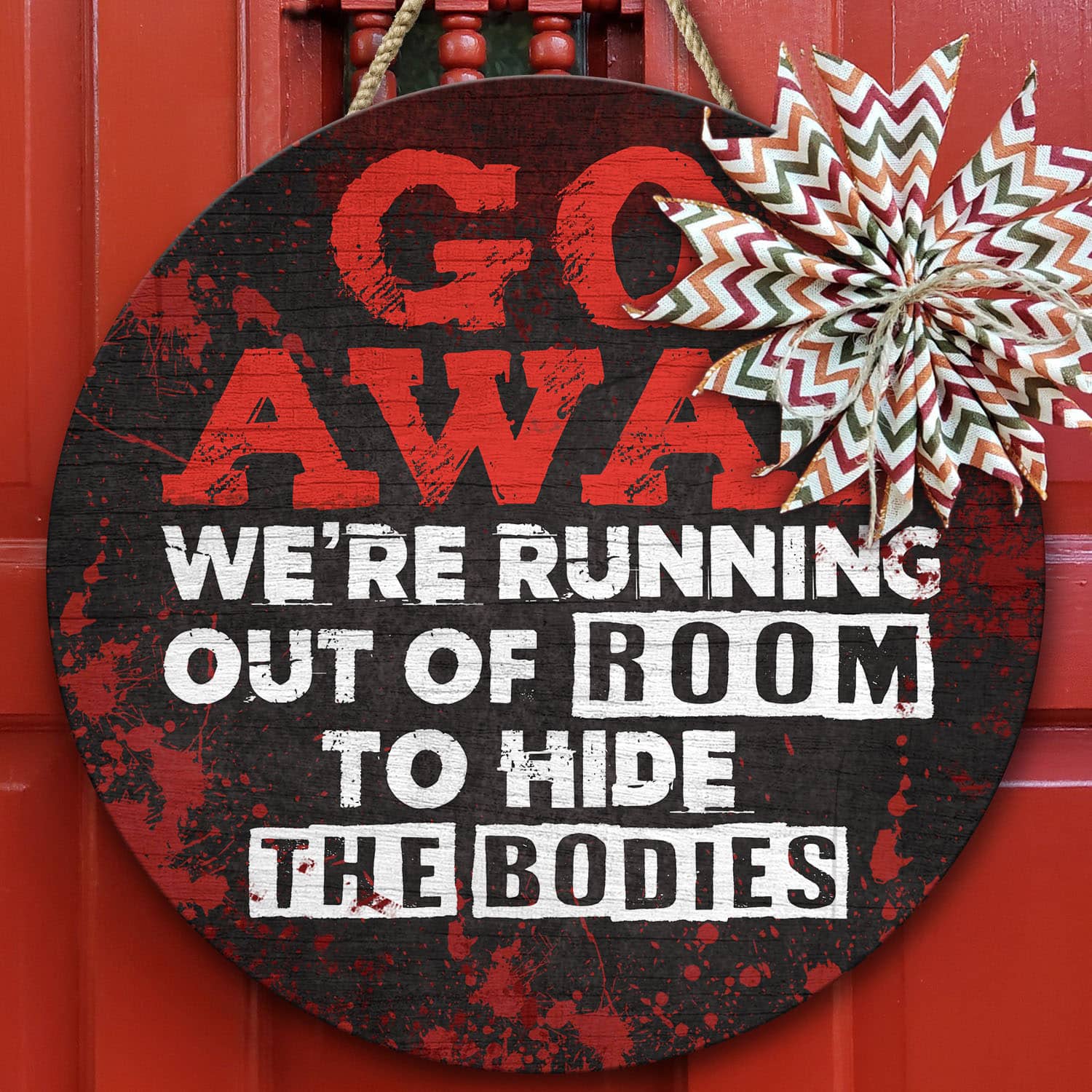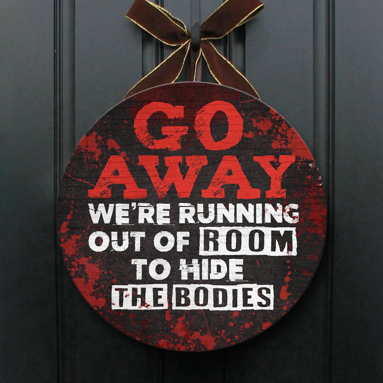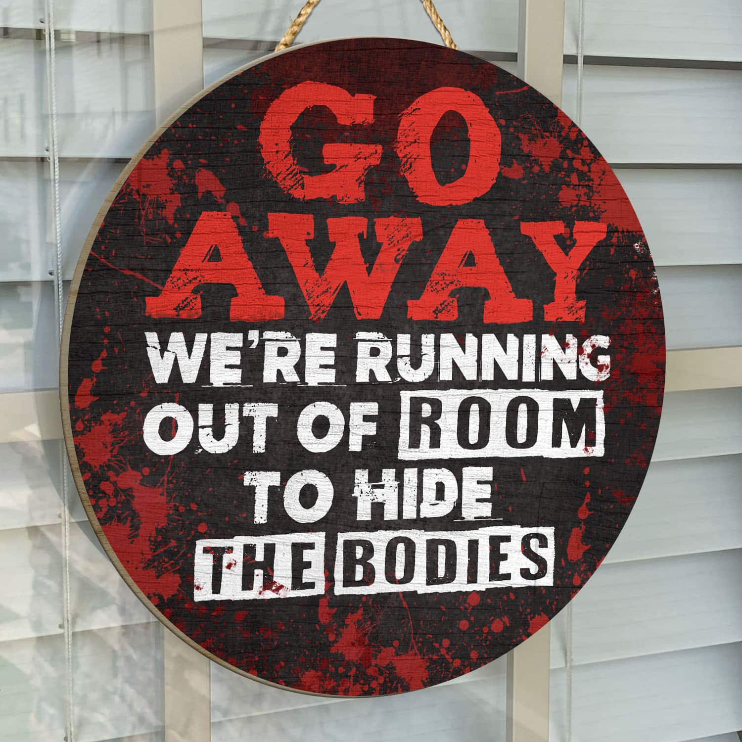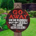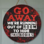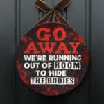 Let’s Shop Go Away We’re Running Out Of Room To Hide The Bodies Funny Halloween Circle Wooden Door Sign – Front Porch Sign!