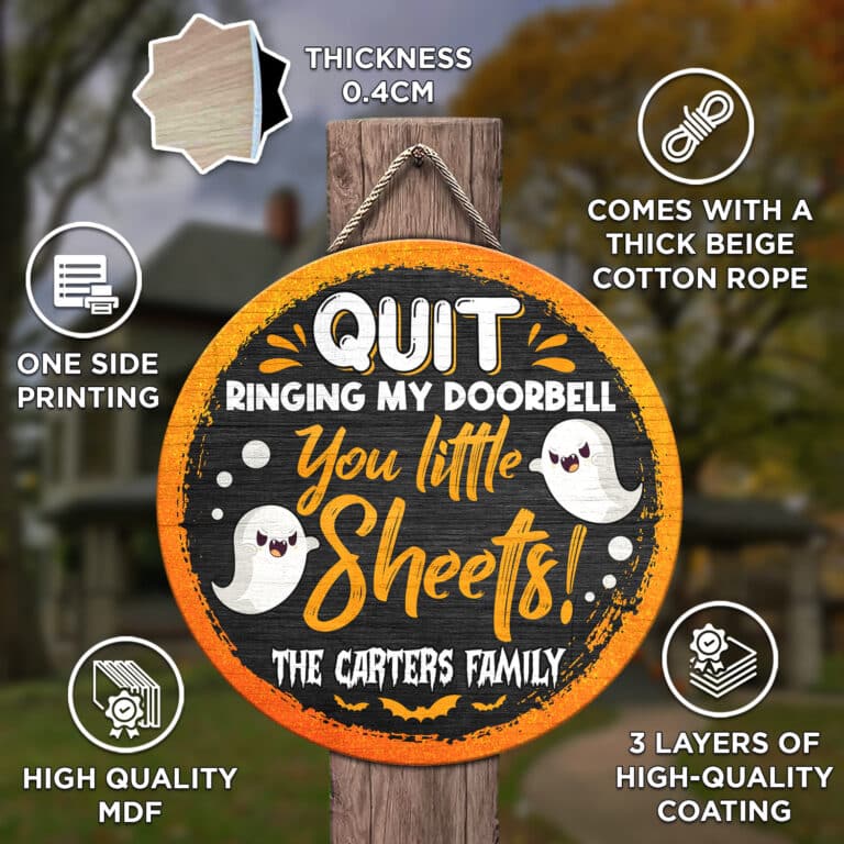 Let’s Shop Personalized Quit Ringing My Doorbell You Little Sheets Funny Halloween Circle Wooden Door Sign – Front Porch Sign!