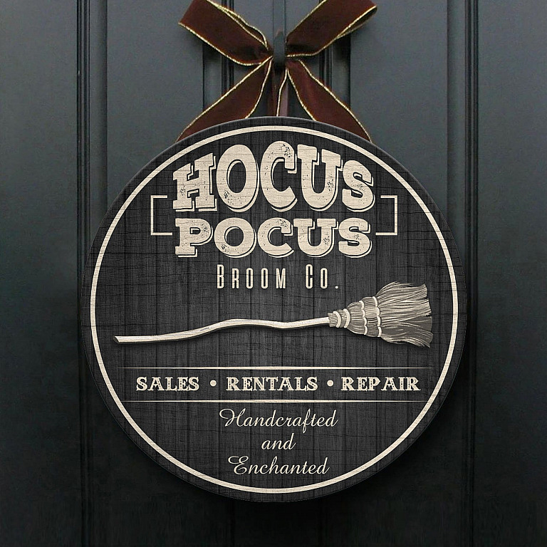 Let’s Shop Hocus Pocus Broom Co Handcrafted and Enchanted Decorative Circle Wooden Door Sign-Front Porch Sign Indoor Outdoor Decor!