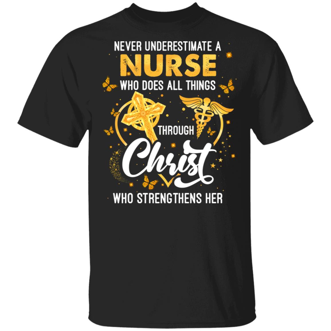 Never Underestimate A Nurse Who Does All Things Through Christ Who Strengthens Her T-Shirt – Nurse Gifts