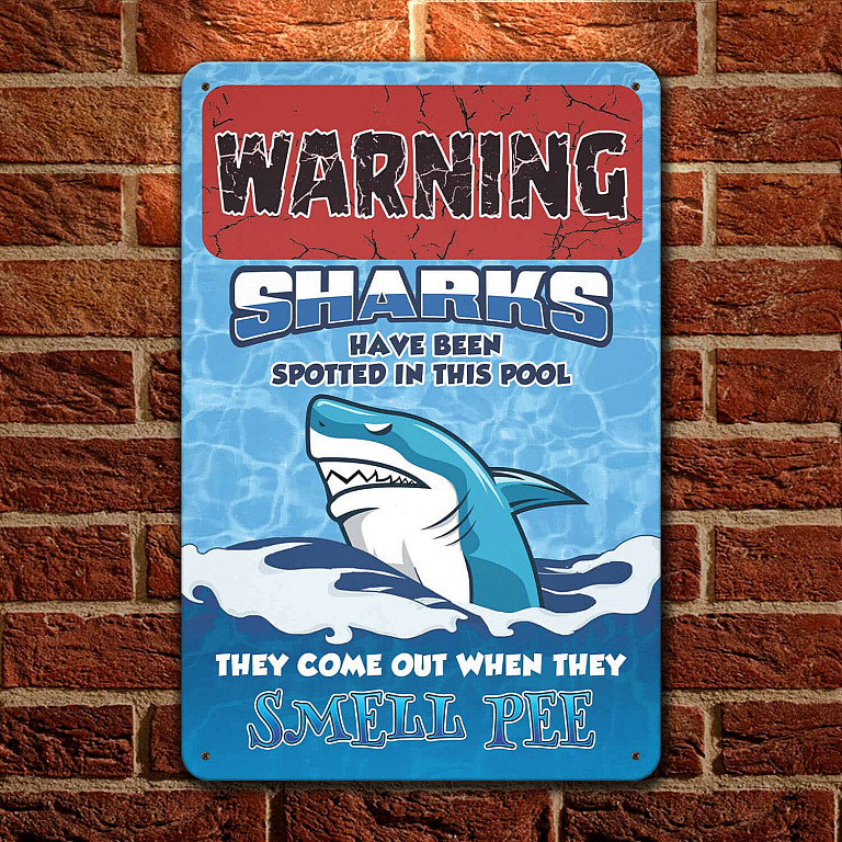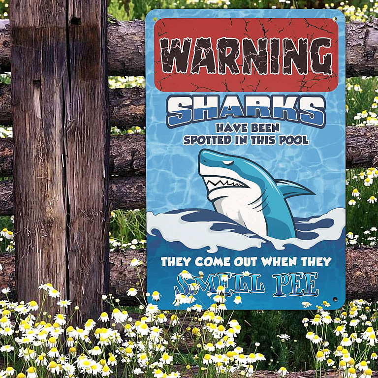 Let’s Shop Warning Sharks Have Been Spotted They Smell Pee Decorative Metal Sign – Funny Swimming Pool Rules Sign!
