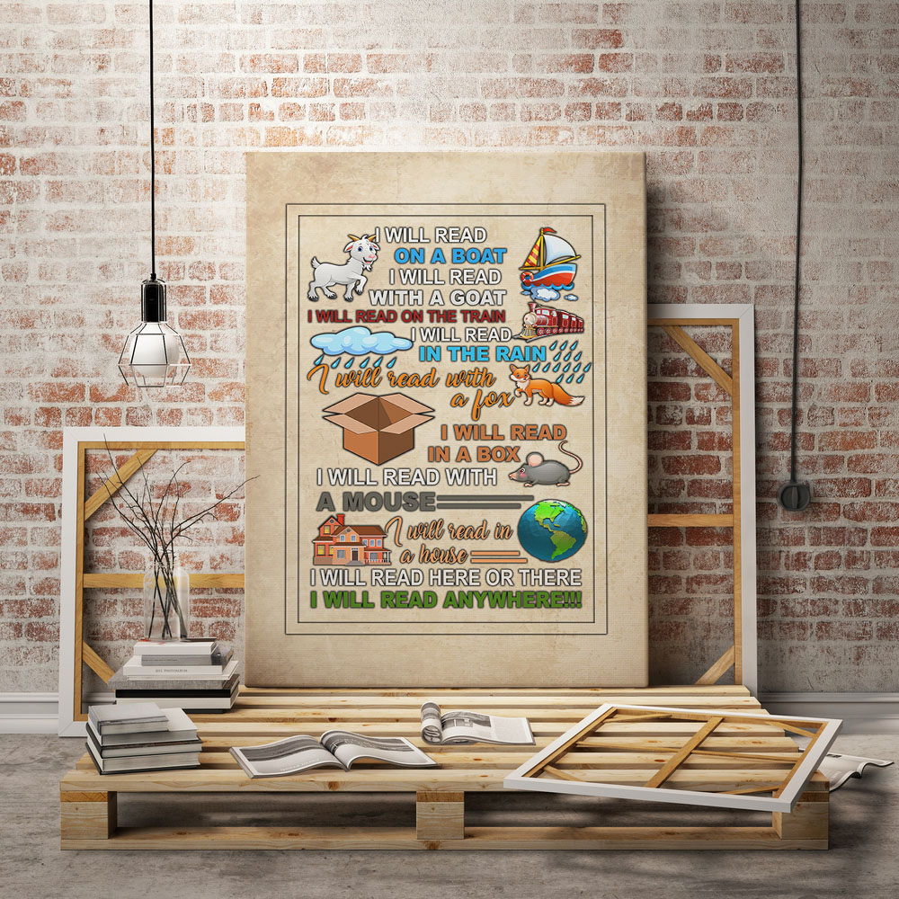 Let’s Shop I Will Read On A Boat With A Goat At Here There Anywhere Canvas Poster – Fun Reading Bookworm Meme Wall Art!