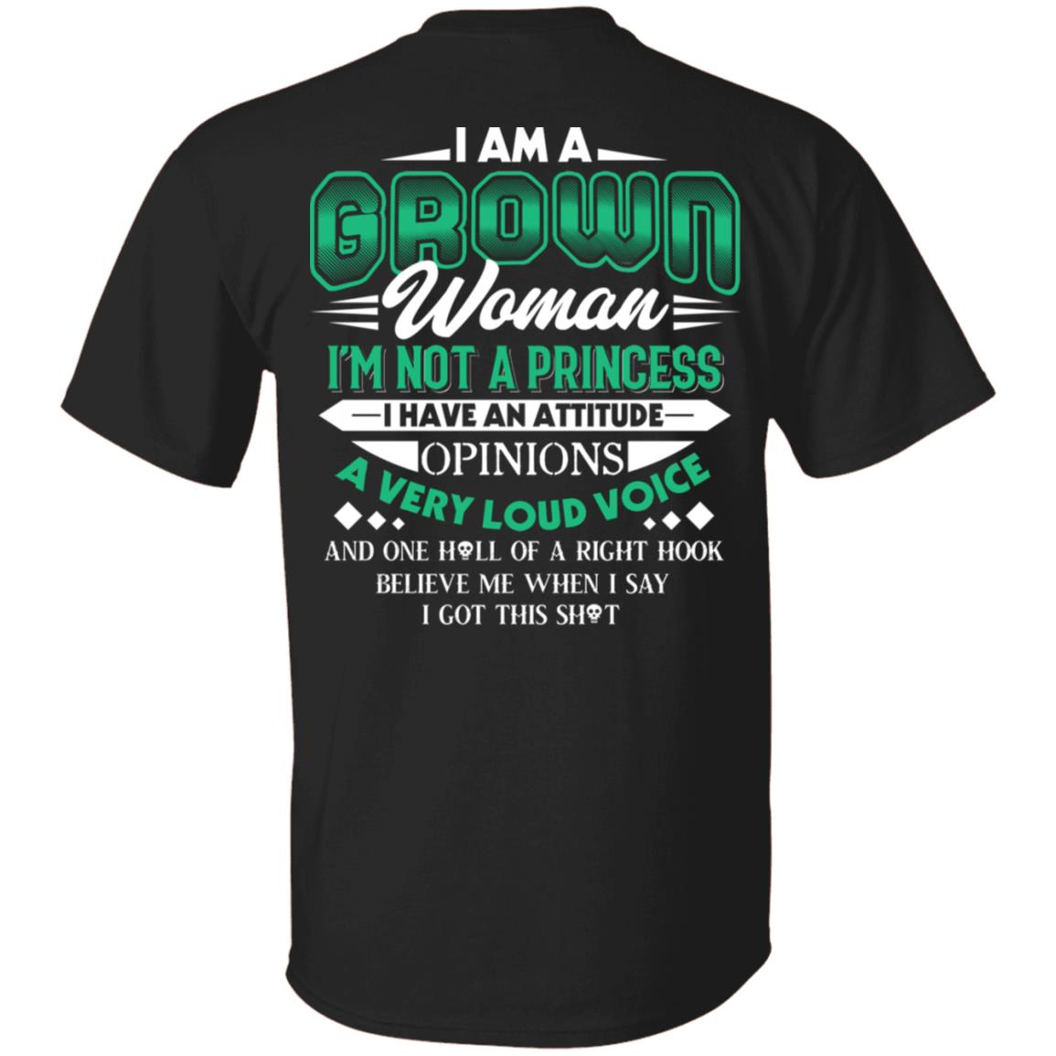 I Am A Grown Woman I’m Not A Princess I Have An Attitude Opinions Print On Back Only – Plain Front T-Shirt