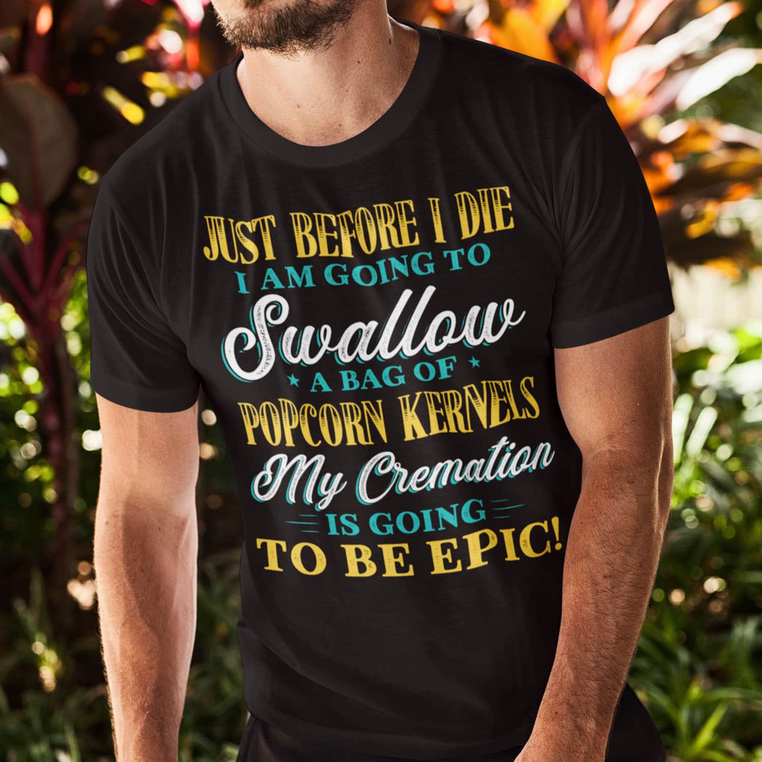 Just Before I Die I Am Going To Swallow A Bag Of Popcorn My Cremation Is Going To Be Epic Funny T-Shirt