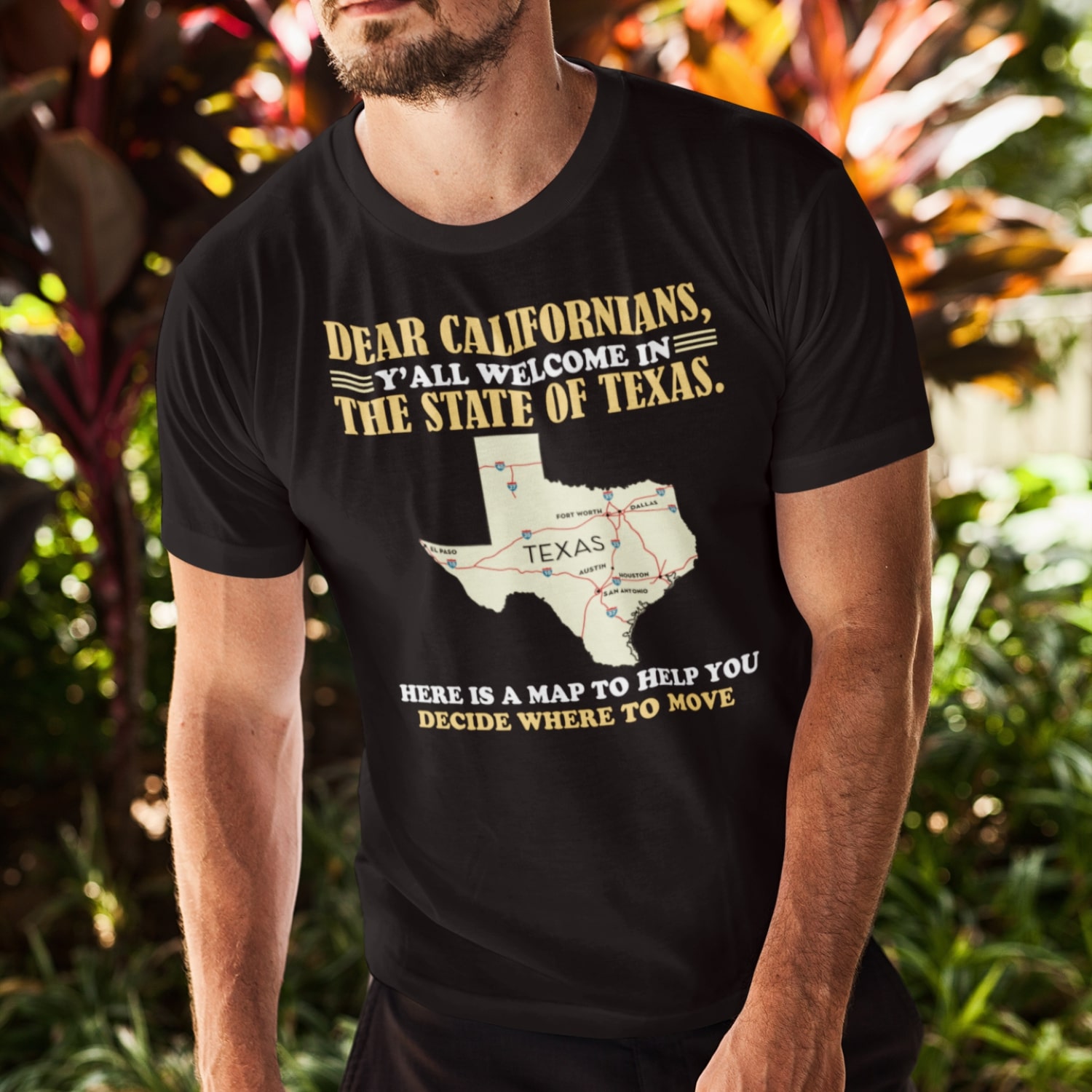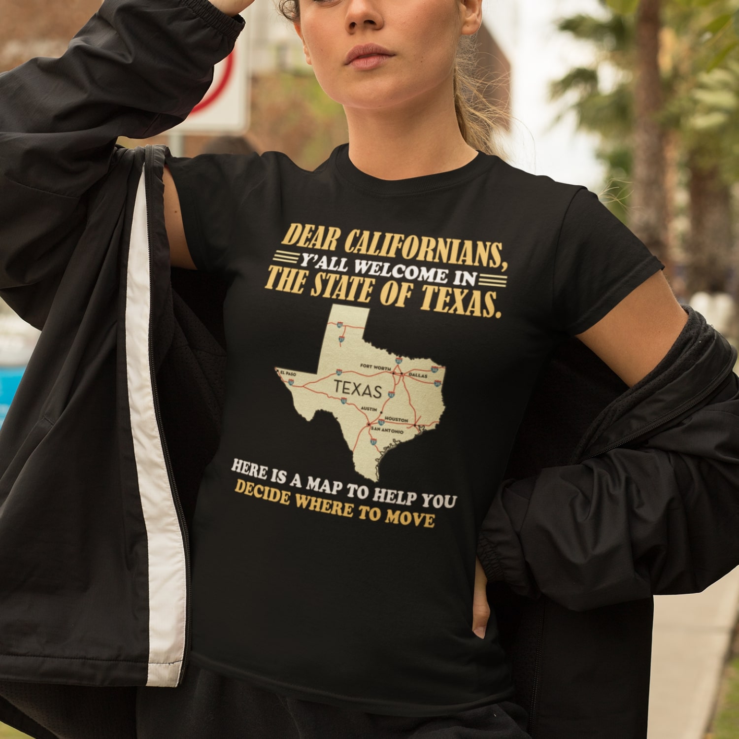 Dear Californians Y’all Are Welcome In The State Of Texas Here Is A Map To Hep You Decide Where To Move T-Shirt