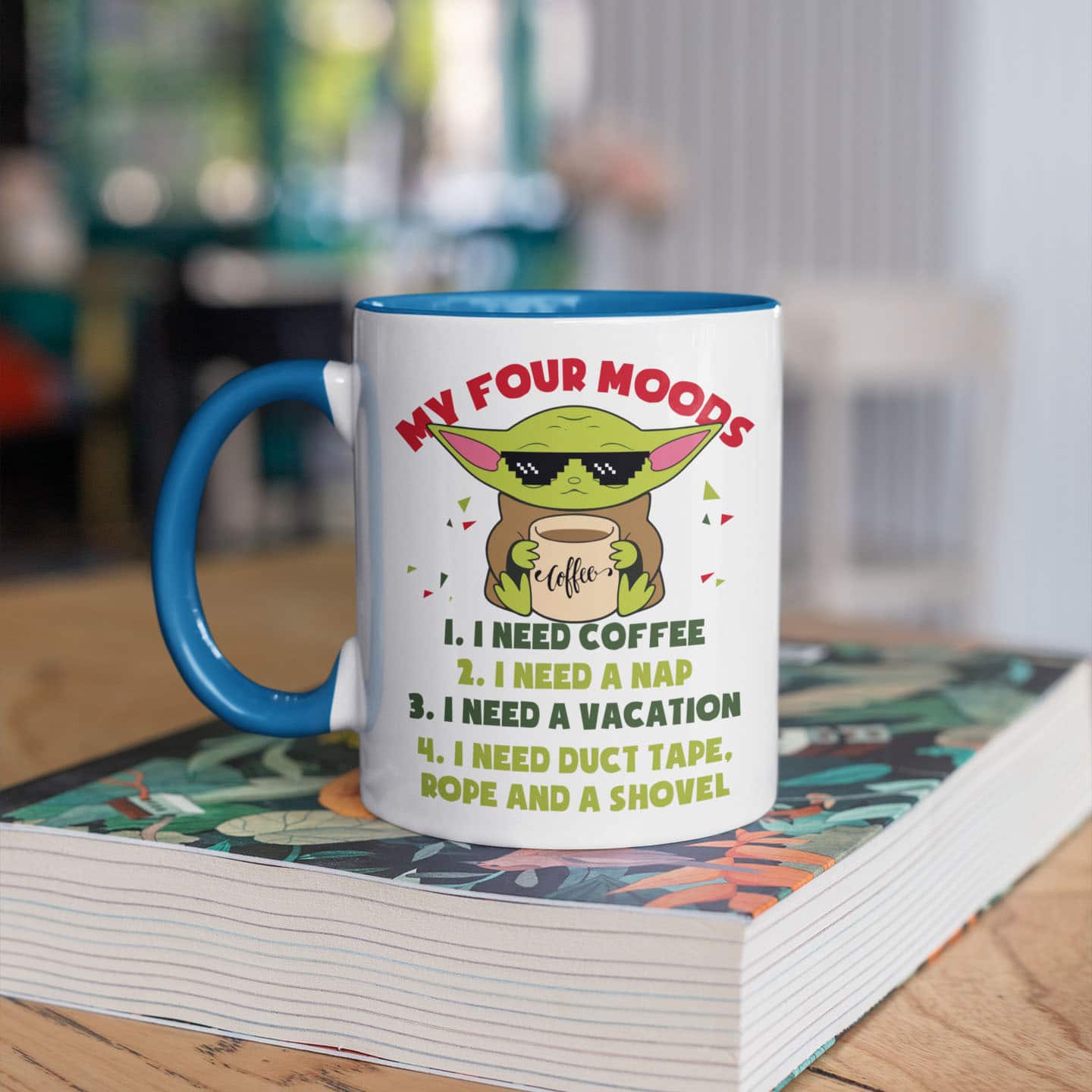 Let’s Shop My Four Moods I Need Coffee I Need Nap I Need A Vacation I Need A Duct Tape Funny Baby Yoda Accent Coffee Mug!