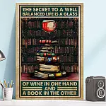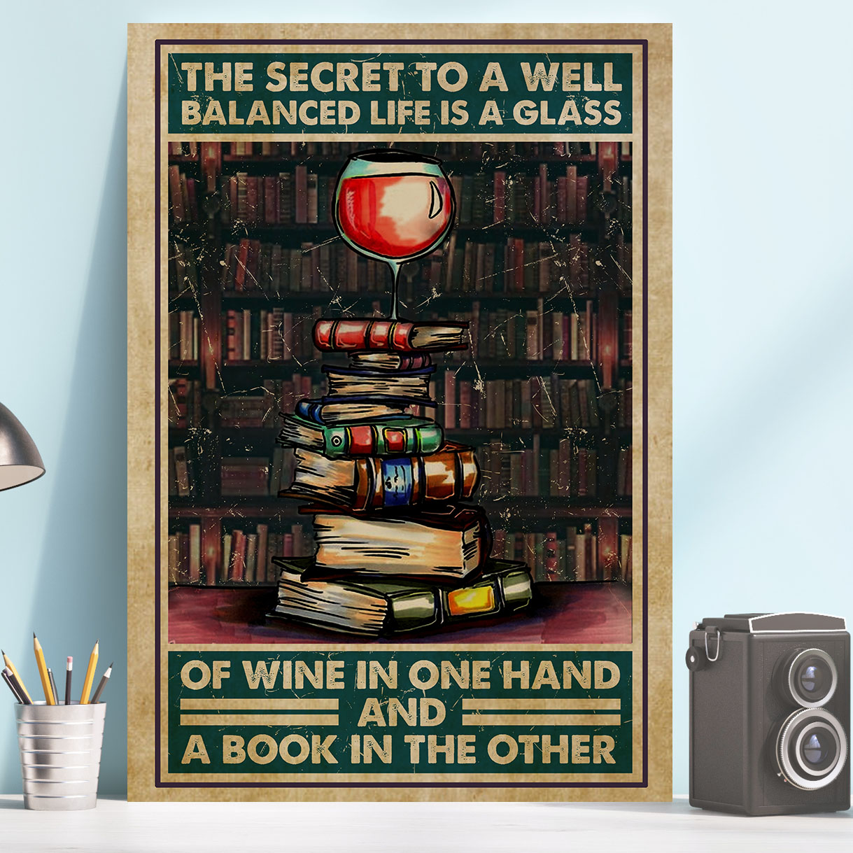 Let’s Shop The Secret to A Well Balanced Life Is a Glass of Wine in One Hand and A Book Framed Canvas – Unframed Poster!