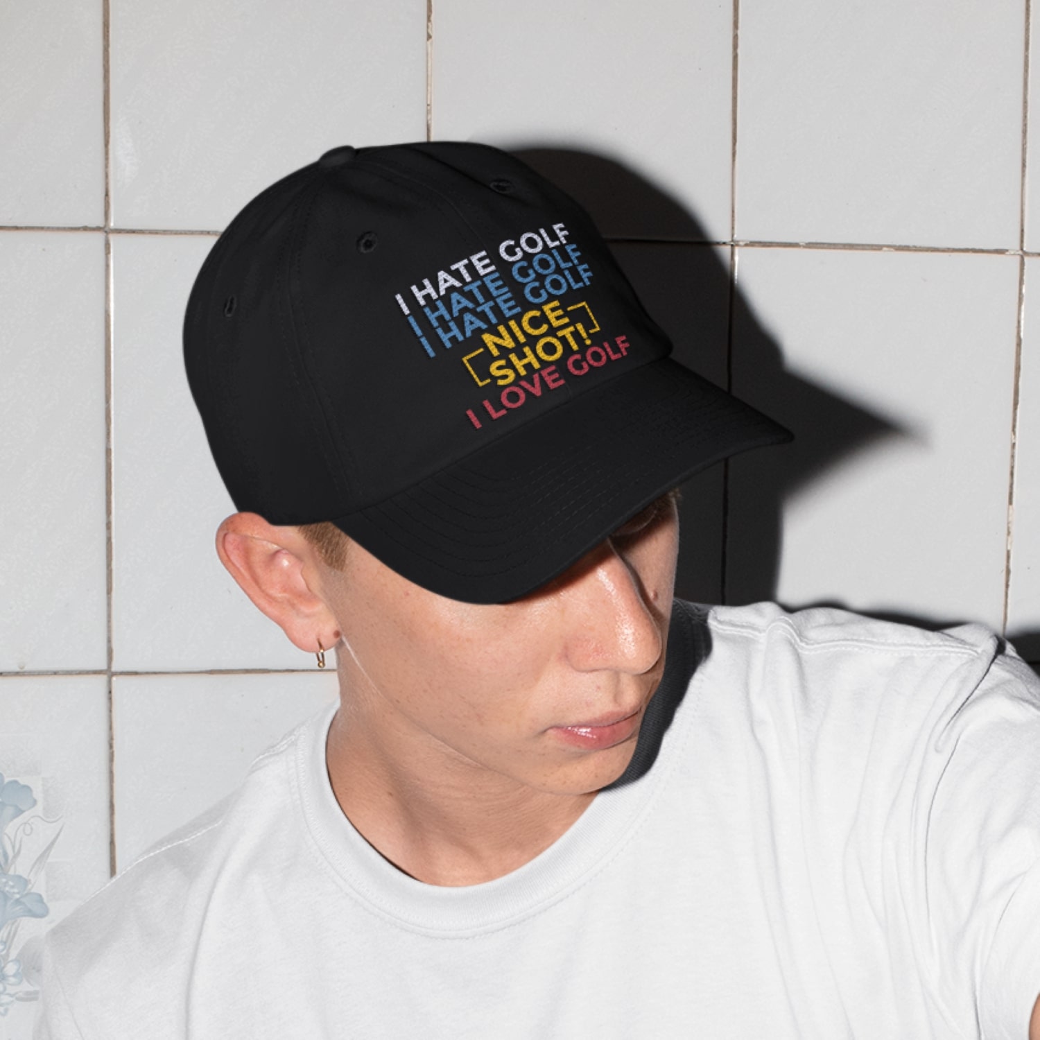 Let’s Shop I Hate Golf Nice Shot I Love Golf Twill Cap – High-Profile Snapback Hat – Trucker Hat – Funny Golf Cap!