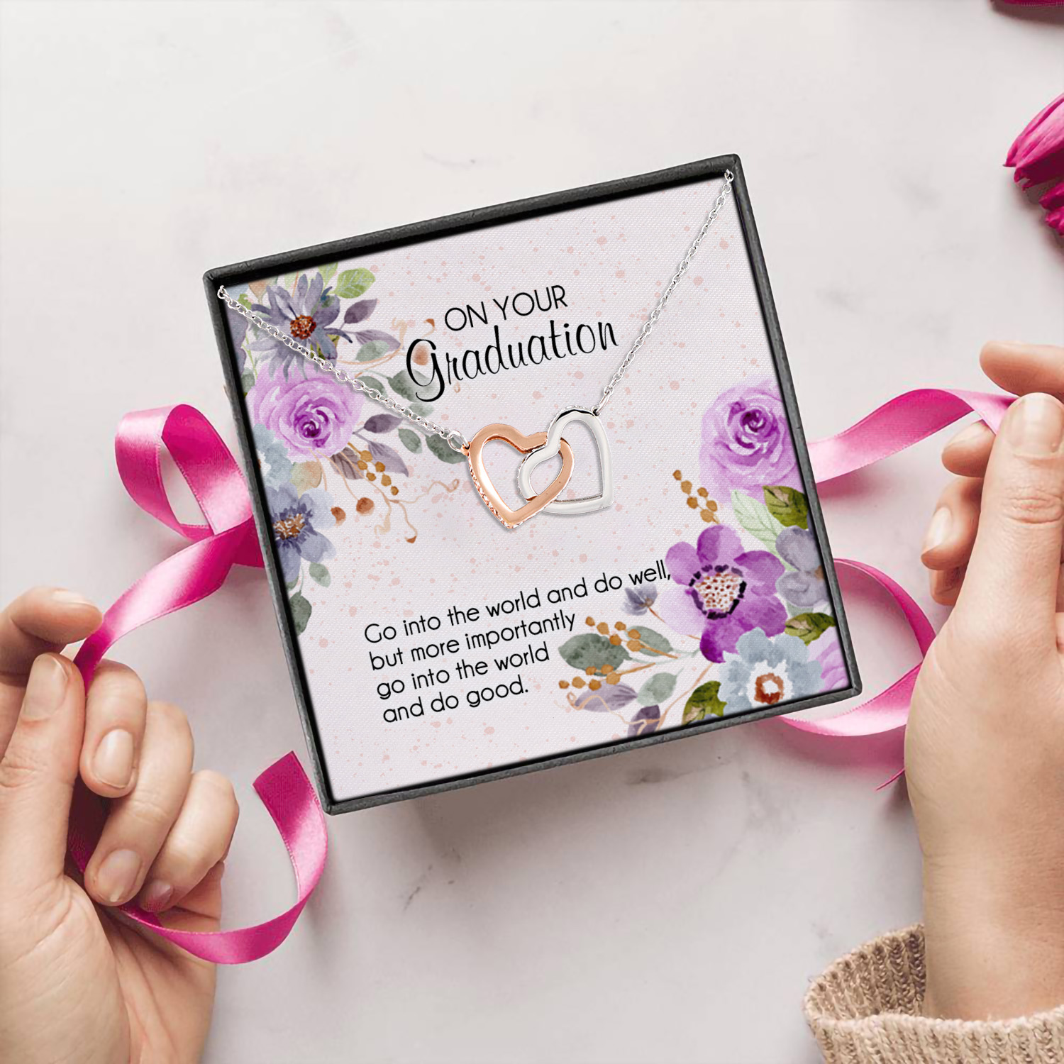 Let’s Shop On Your Graduation Go Into the World and Do Well Heartfelt Card And Joined Interlocking Hearts Pendant Necklace!