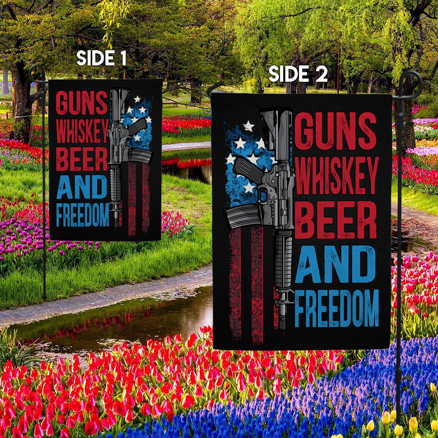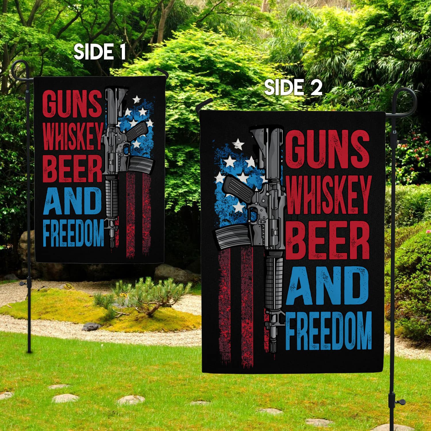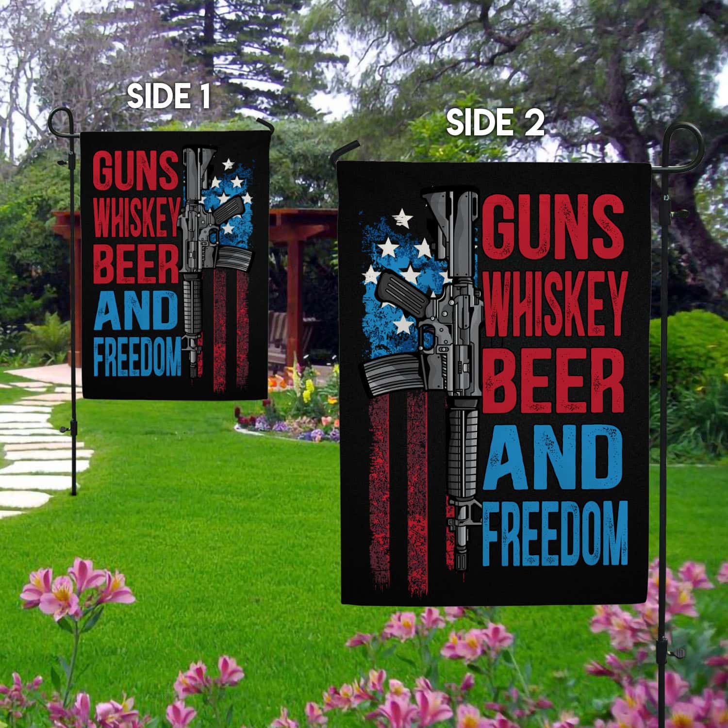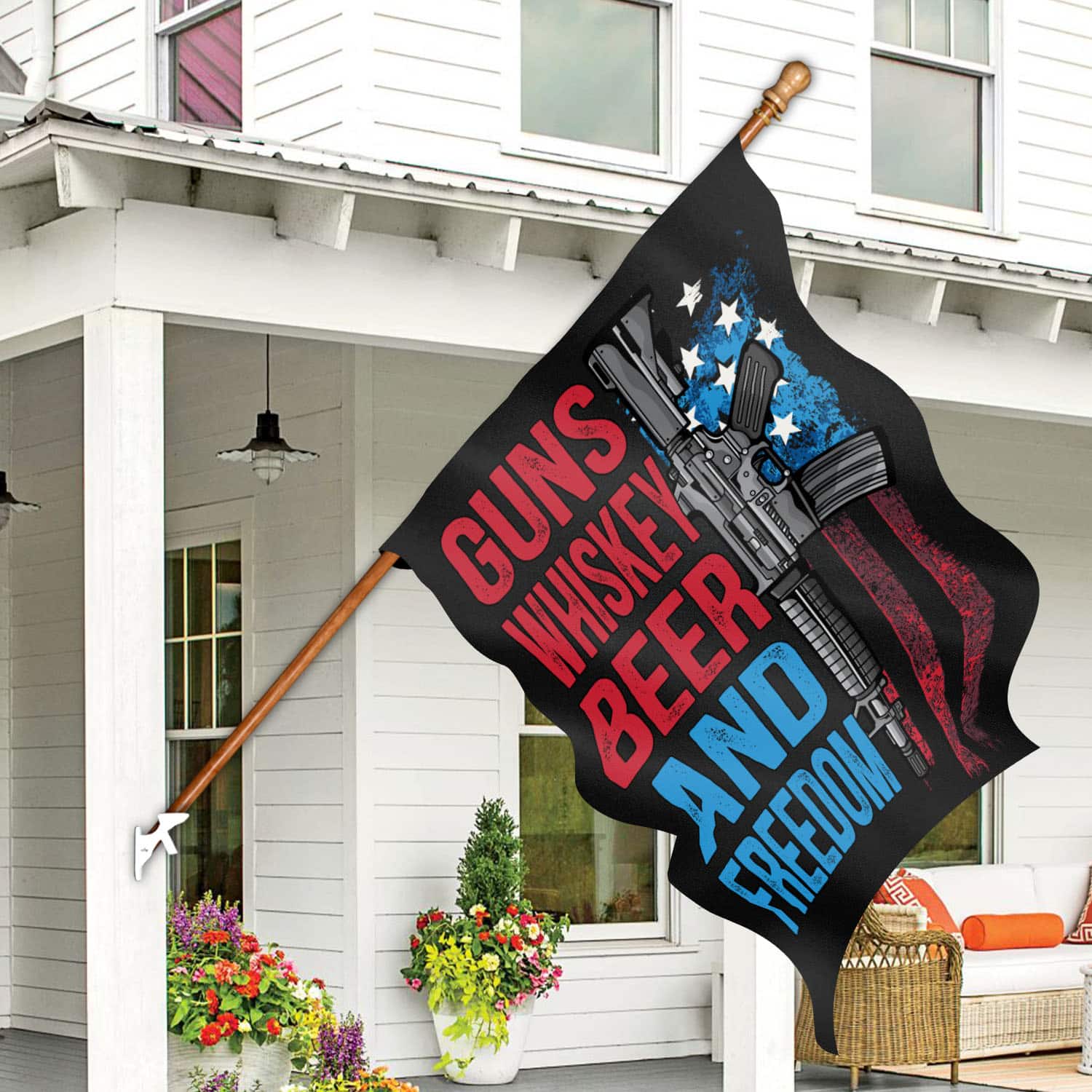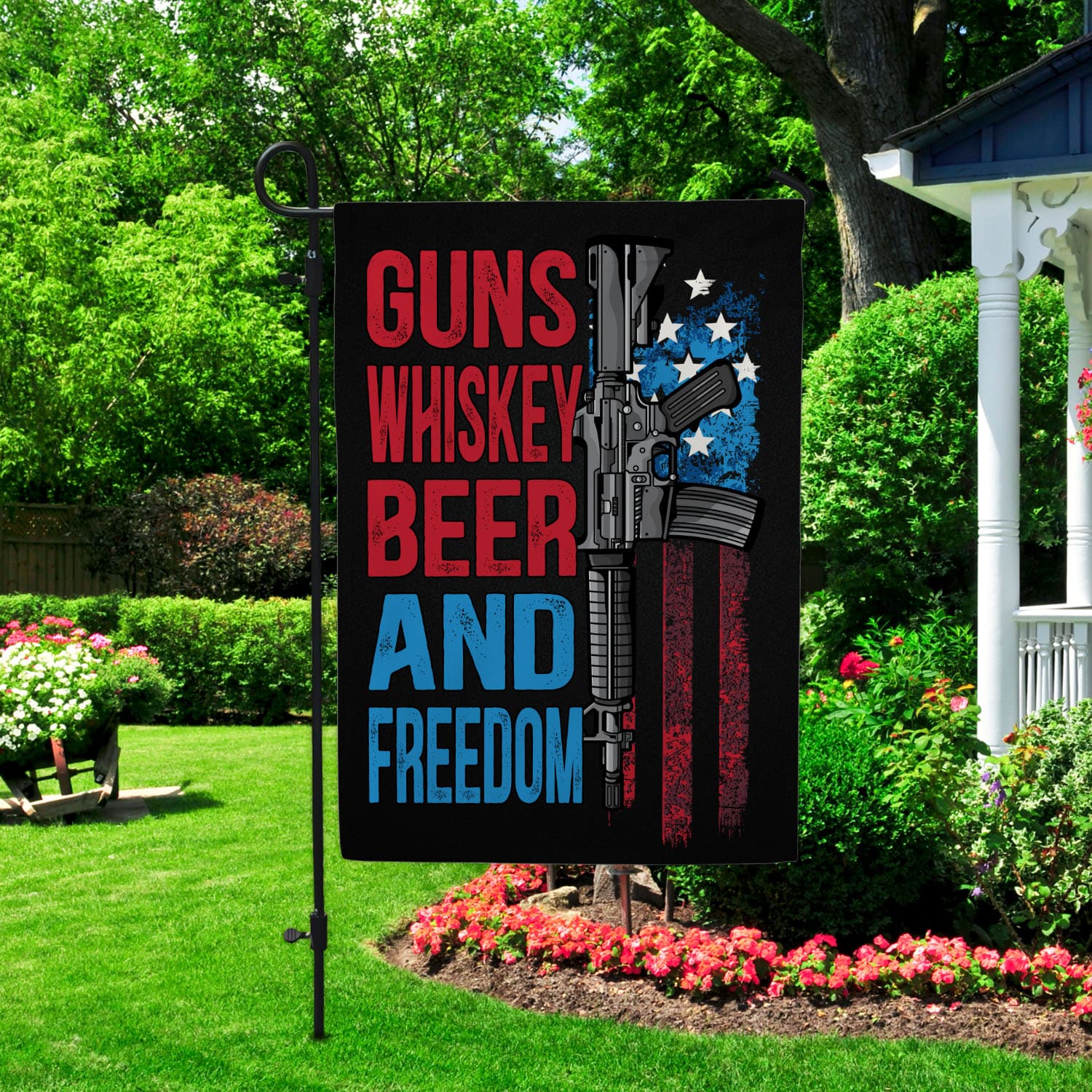 Let’s Shop Gun Whisky Beer and Freedom American House Flag – Pro-Gun Patriot Garden Flag!
