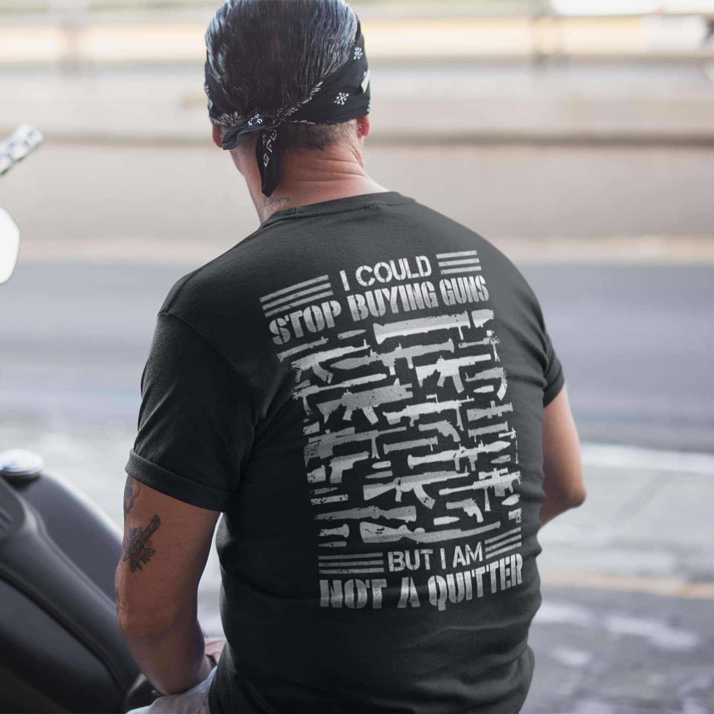 Let’s Shop I Could Stop Buying Guns But I Am Not A Quitter Funny Print On Back T-Shirt Only – Gun Lover Plain Front Shirt!