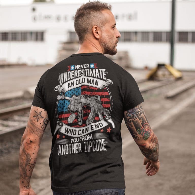 Let’s Shop Never Underestimate An Old Man Who Can End You From Another Zipcode Funny Gun Print On Back T-Shirt Only!