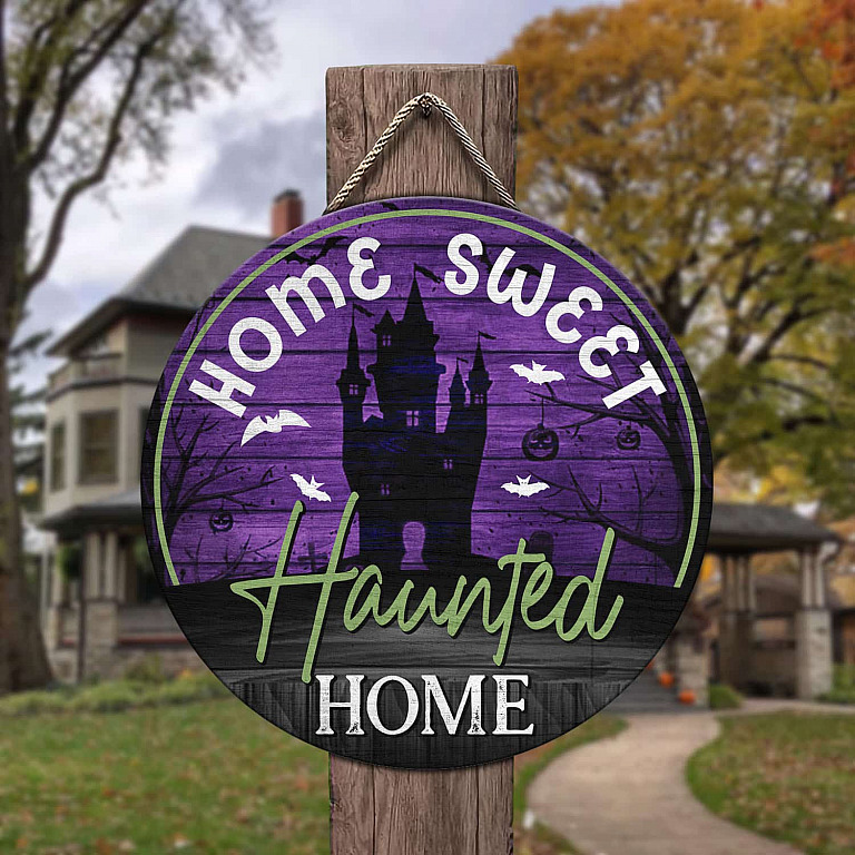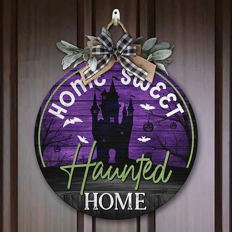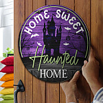 Let’s Shop Home Sweet Haunted Home Halloween Welcome Sign Decorative Circle Wooden Door Sign – Front Porch Sign Indoor Outdoor Decor!