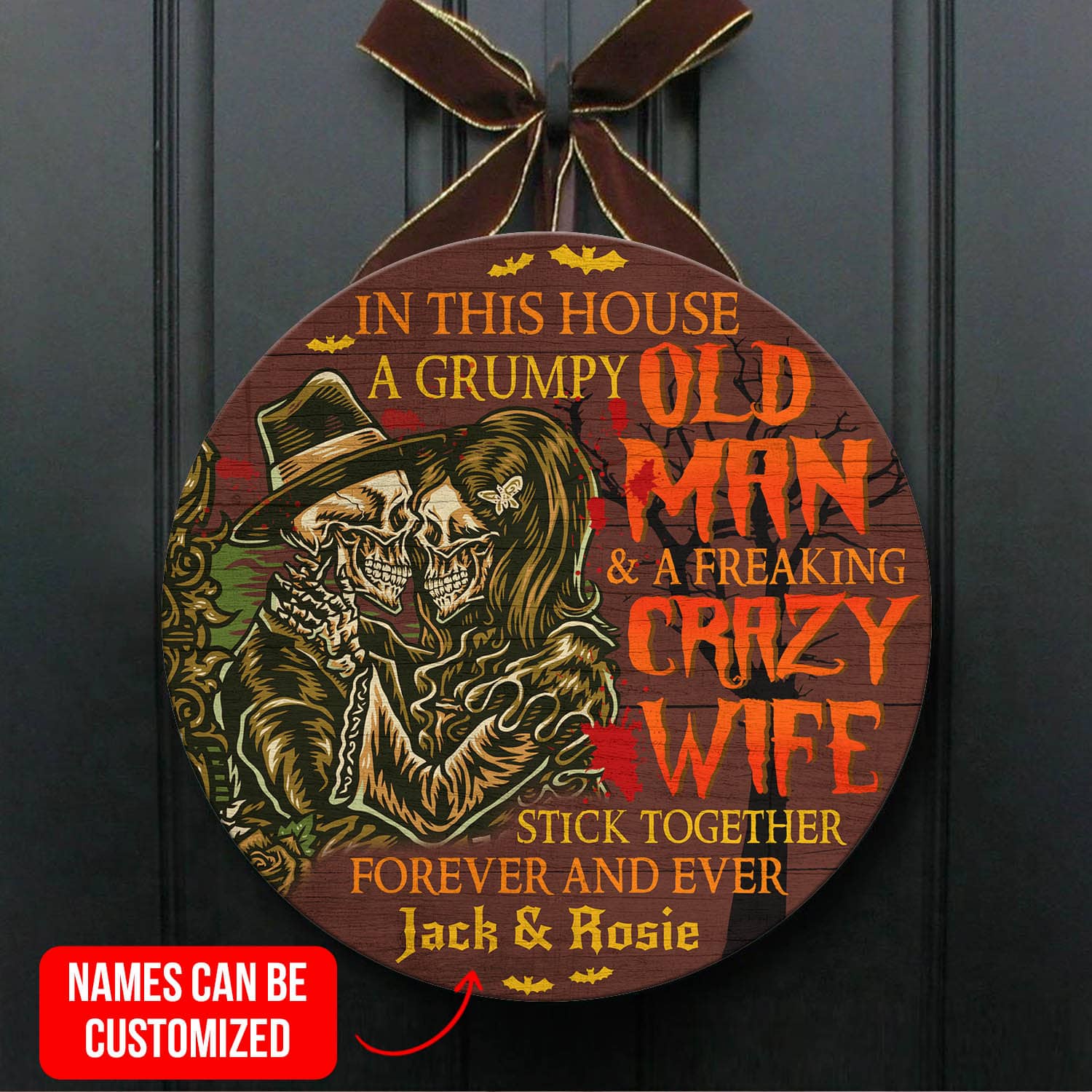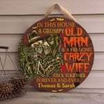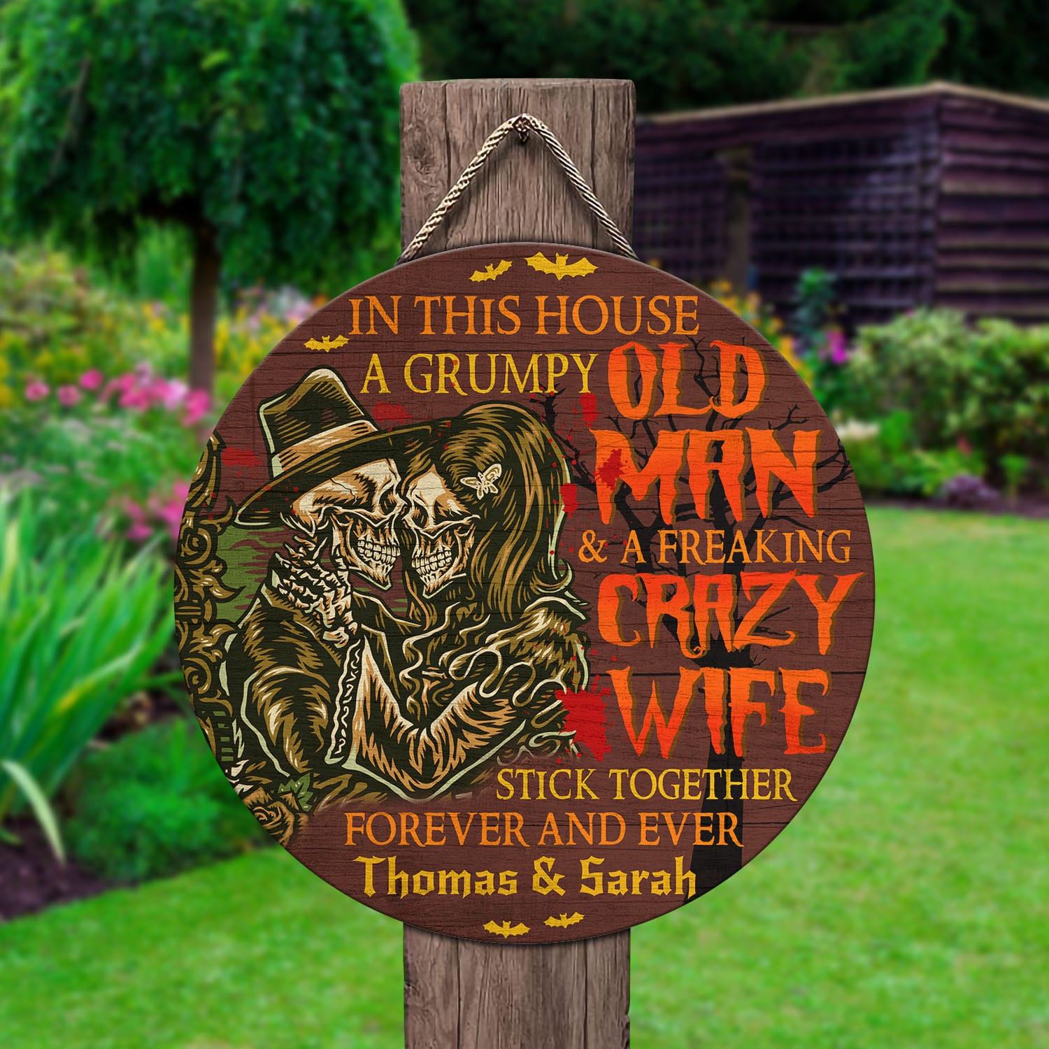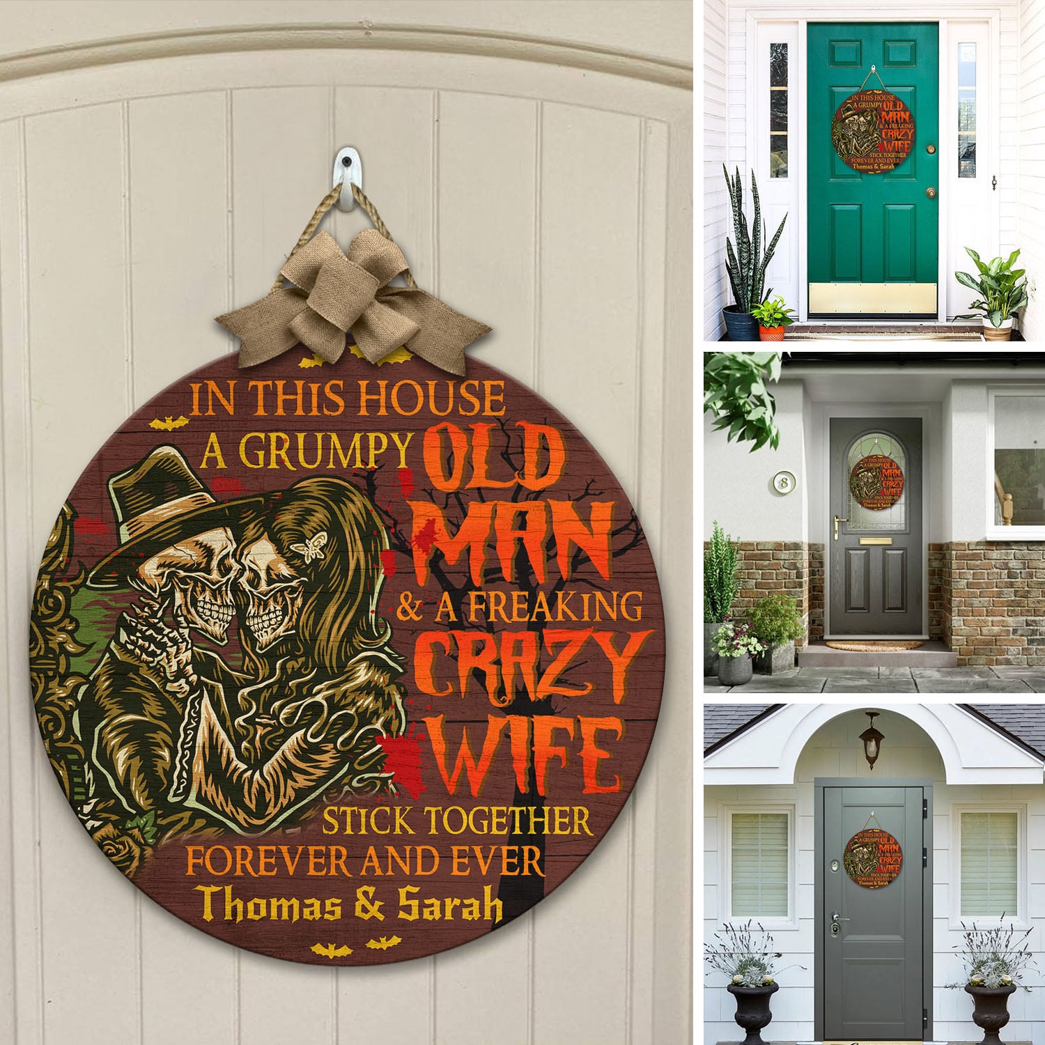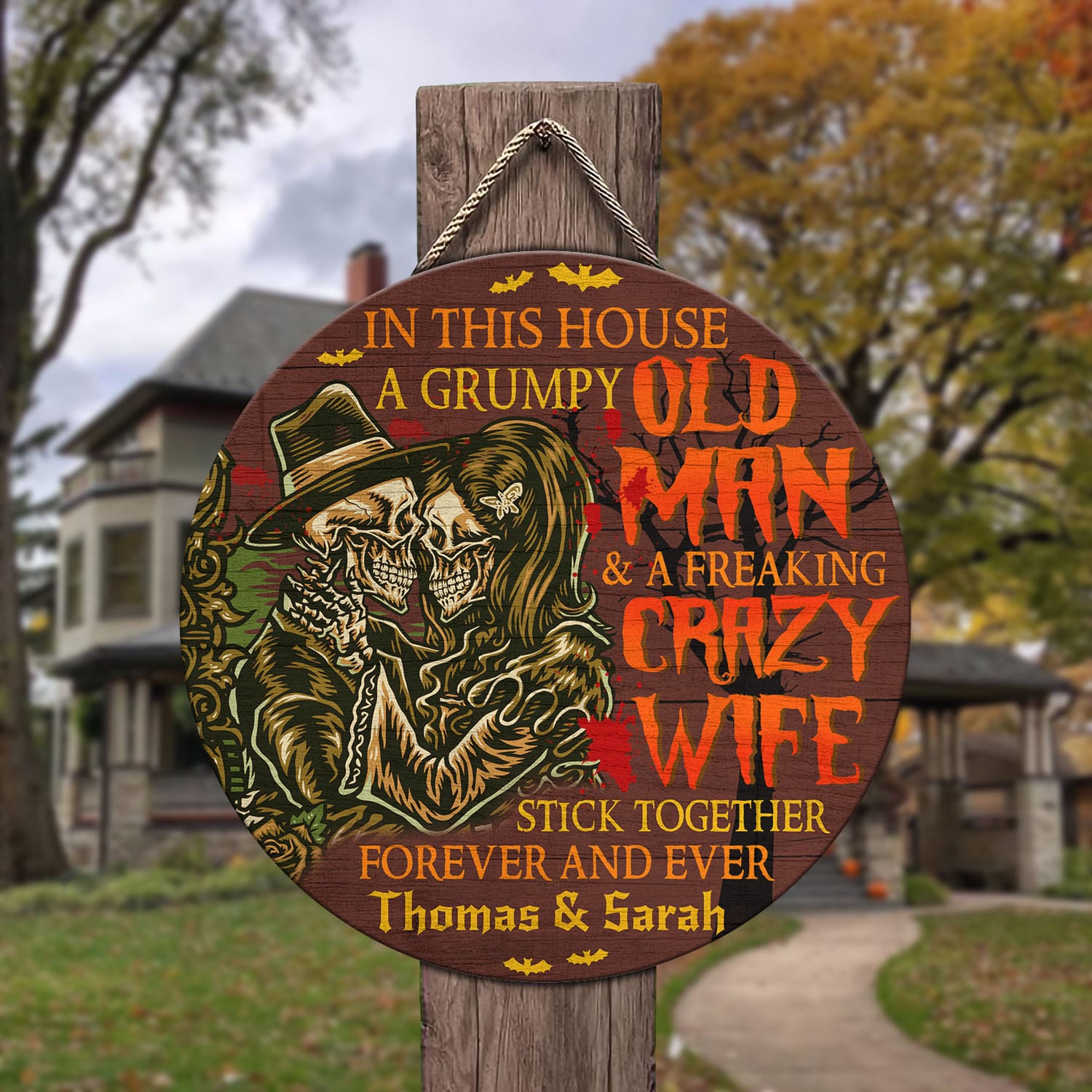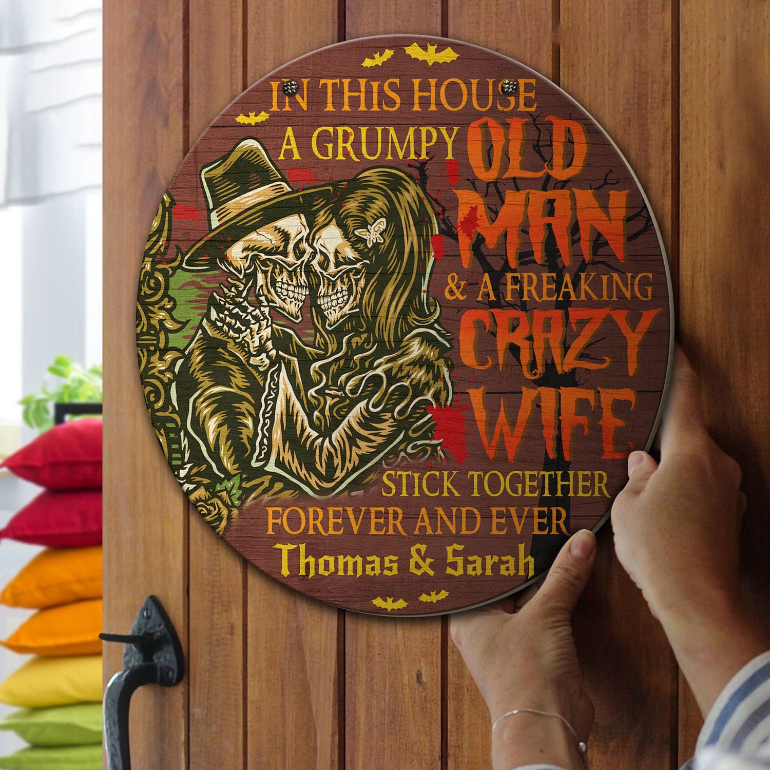 Let’s Shop Custom Halloween Door Sign In This House a Grumpy Old Man a Freaking Crazy Wife Circle Wooden Door Sign – Front Porch Sign!