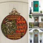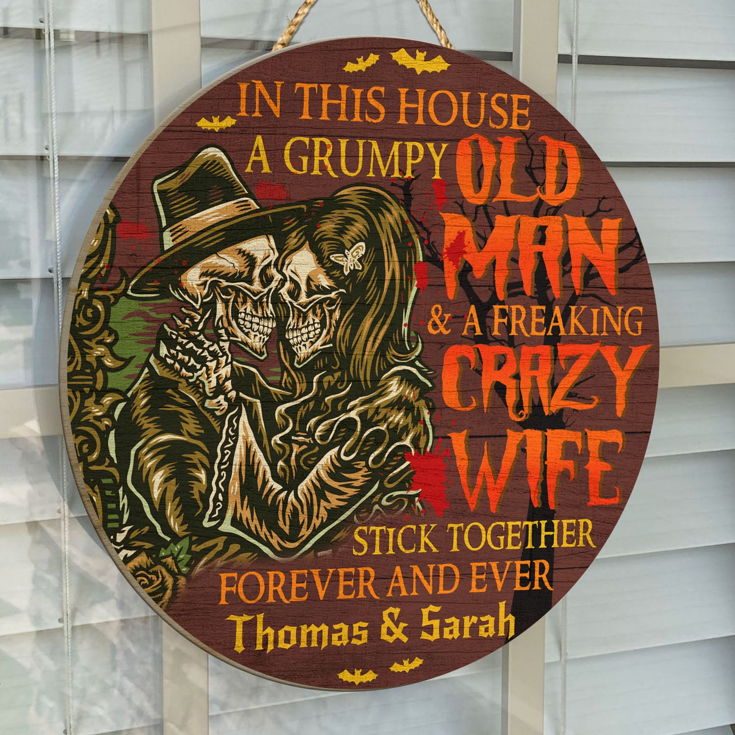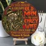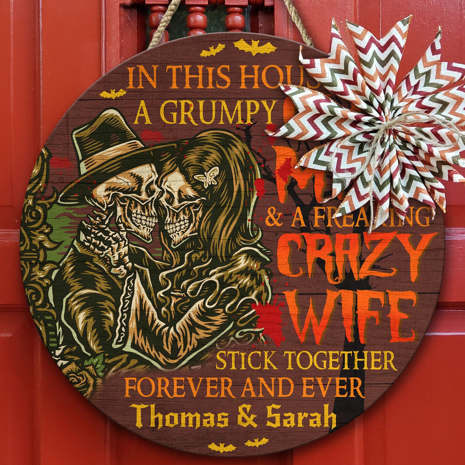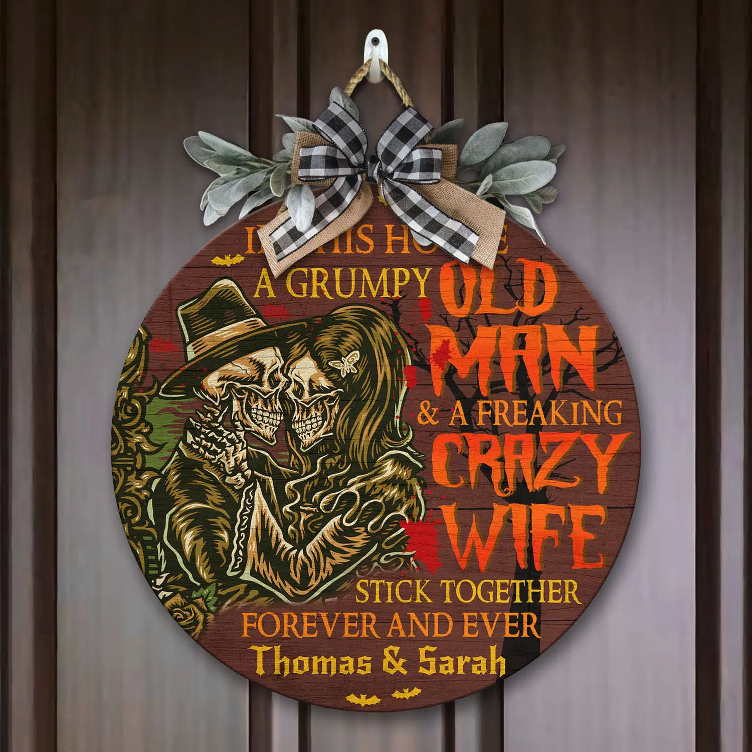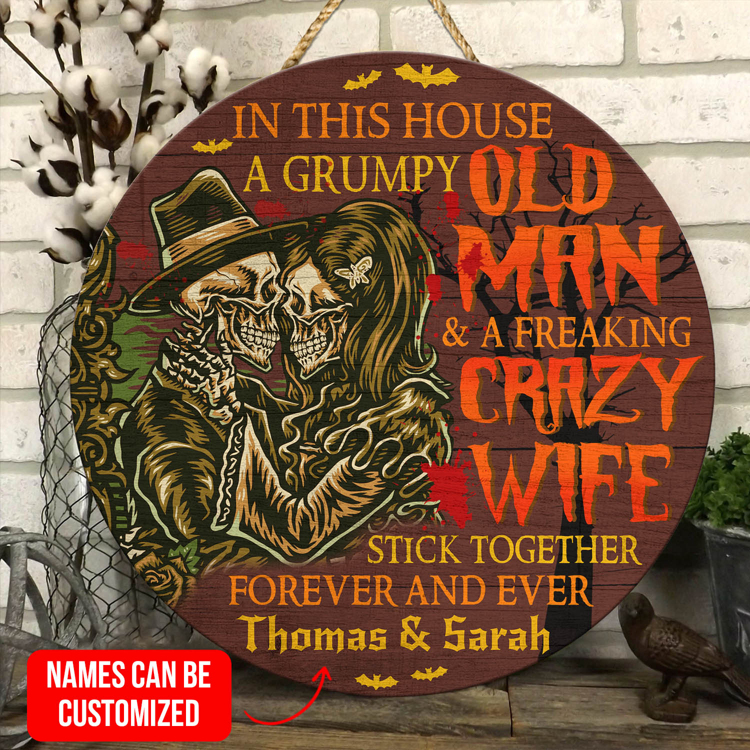 Let’s Shop Custom Halloween Door Sign In This House a Grumpy Old Man a Freaking Crazy Wife Circle Wooden Door Sign – Front Porch Sign!