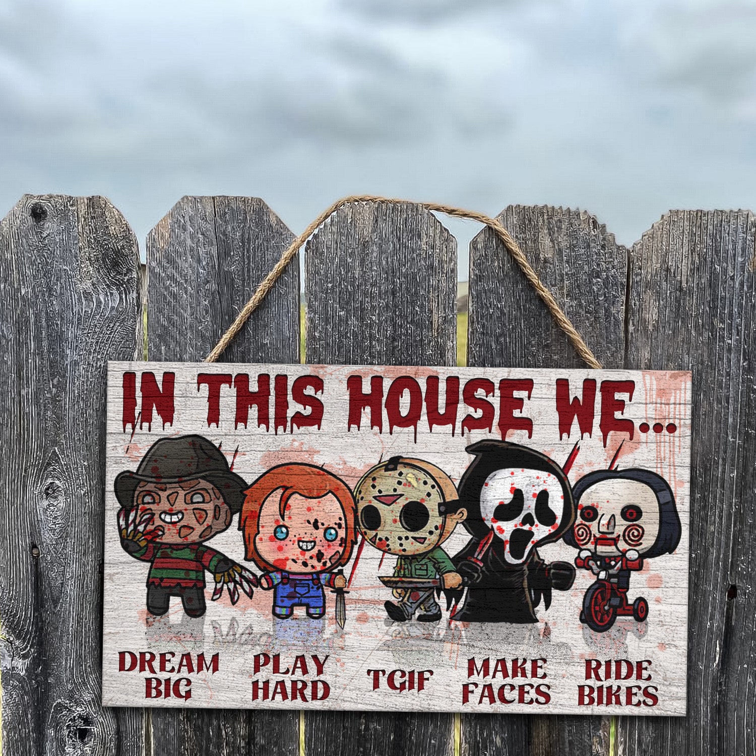 Let’s Shop In This House We Love Family Dream Big Like Scary Movies Halloween Characters Wooden Door Sign – Front Porch Sign Indoor Outdoor Decor!