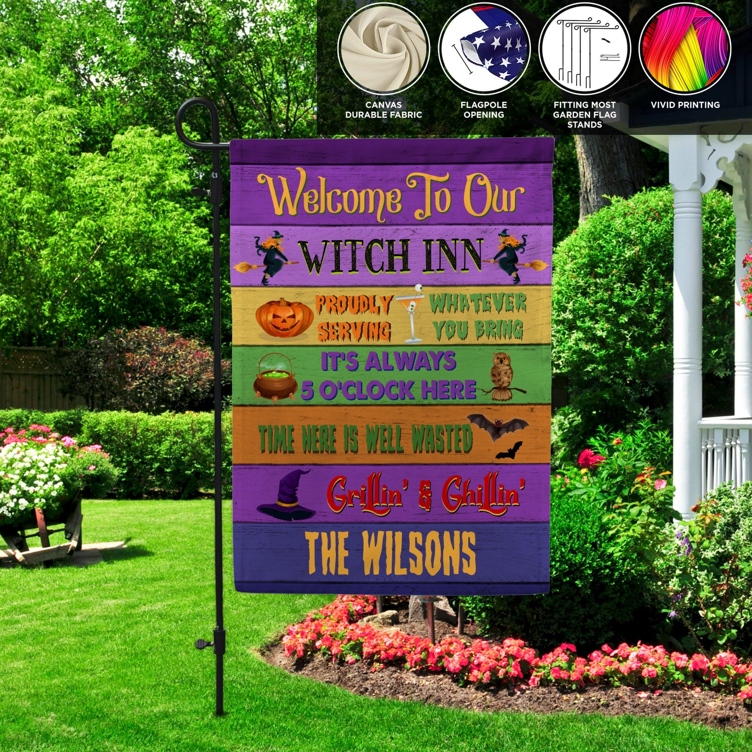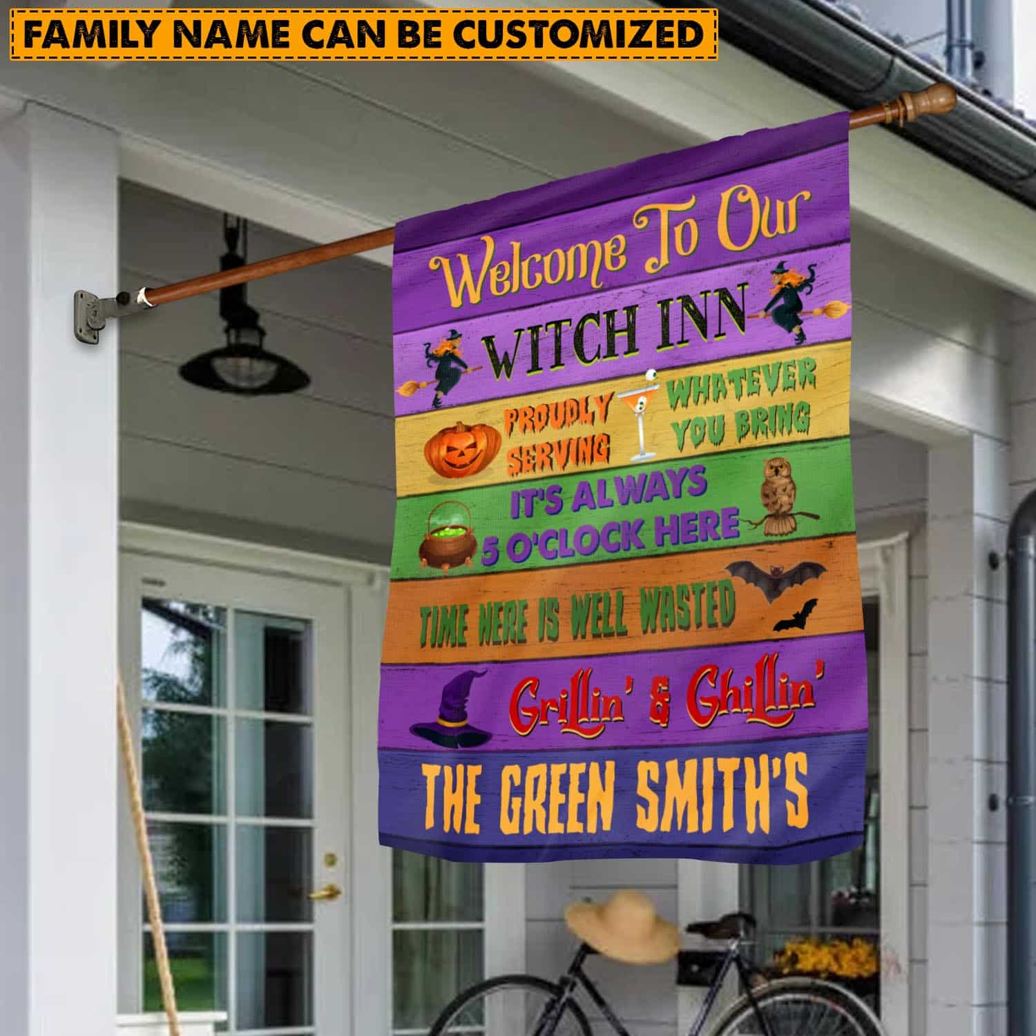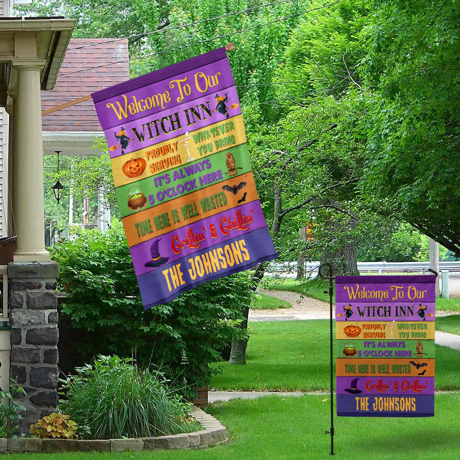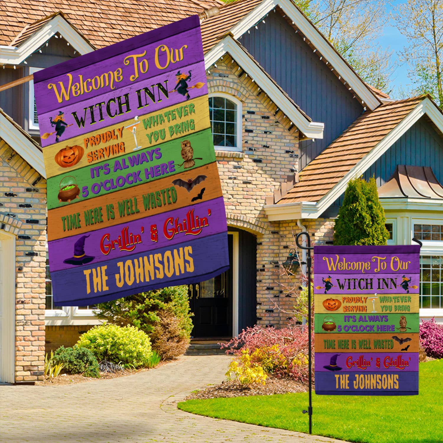 Let’s Shop Personalized Welcome To Our Witch Inn Proudly Serving Outdoor House Flag – Witch Halloween Home Garden Flag!