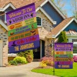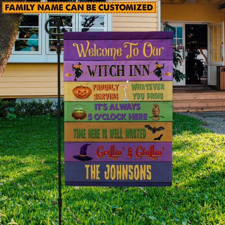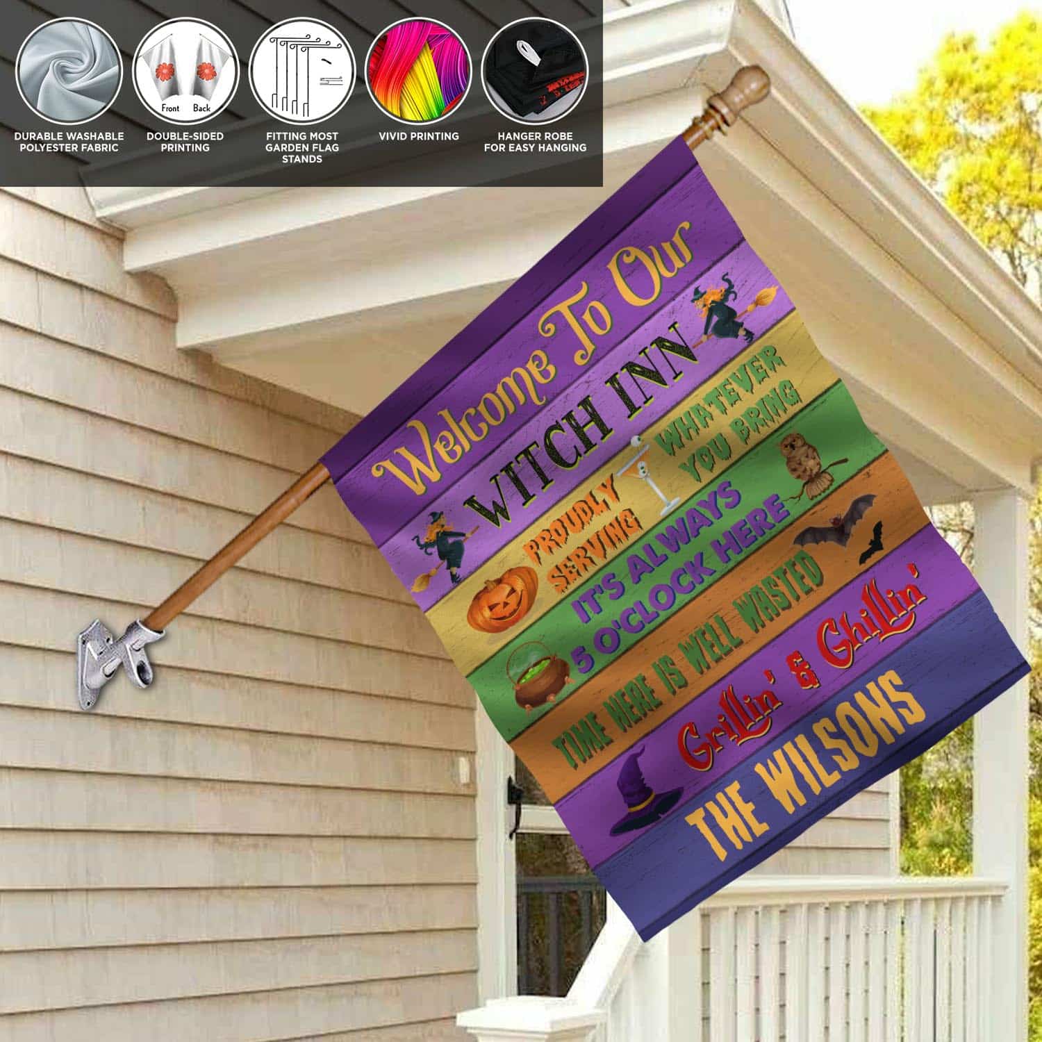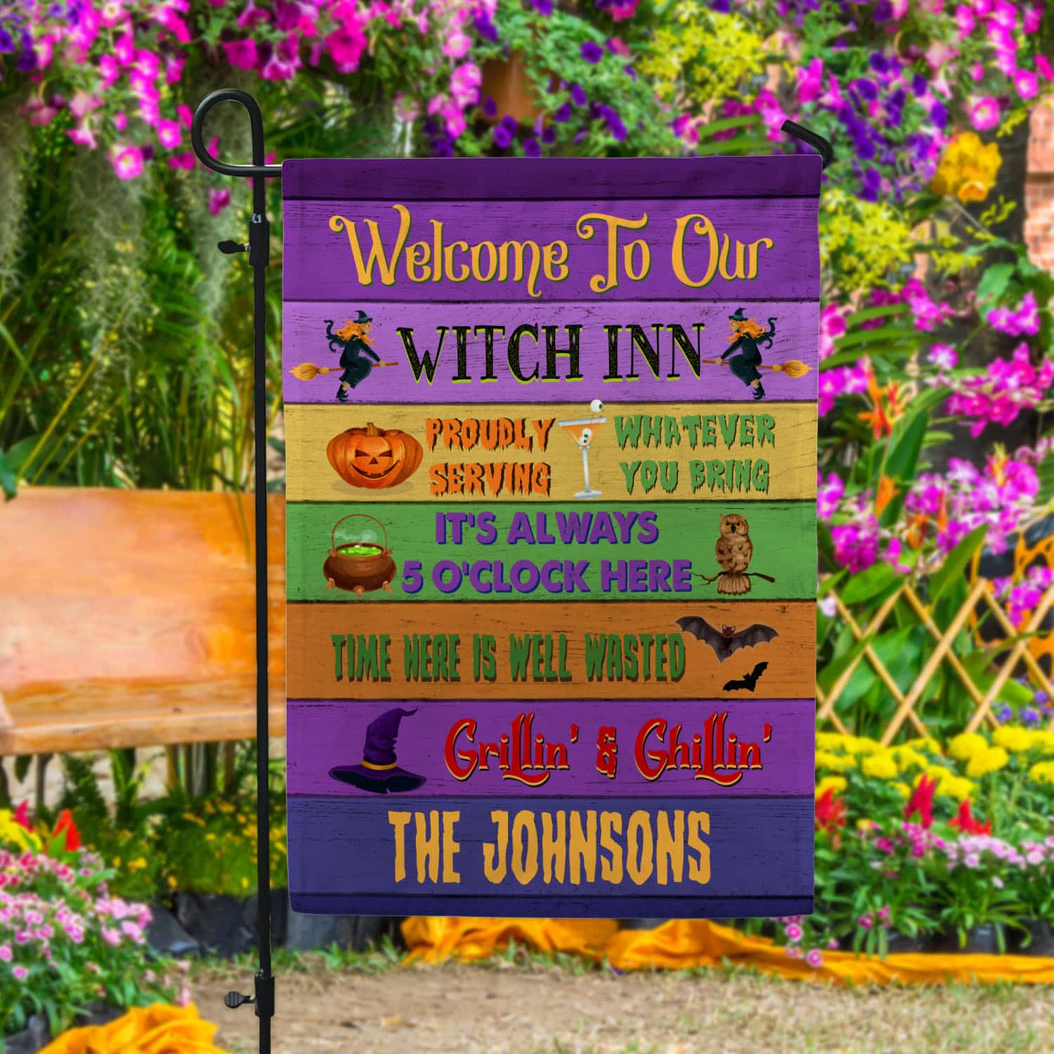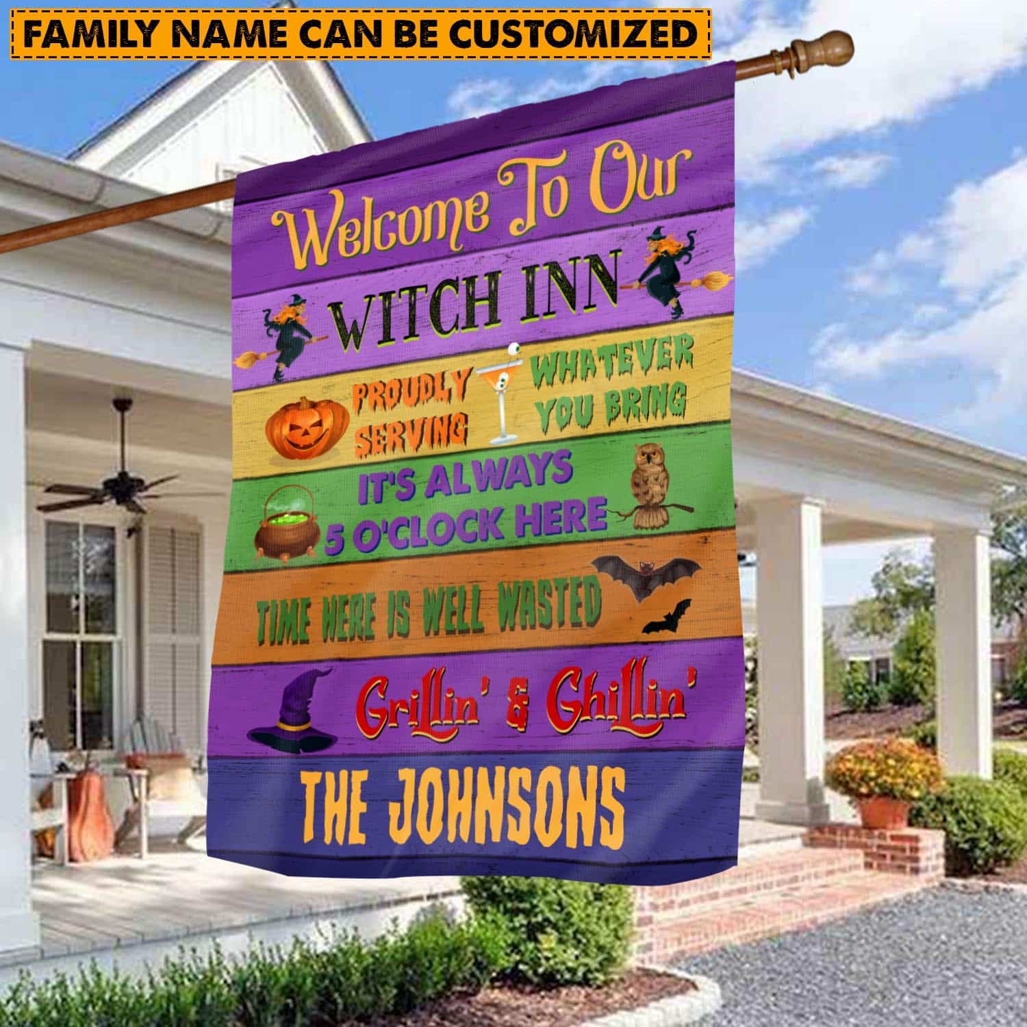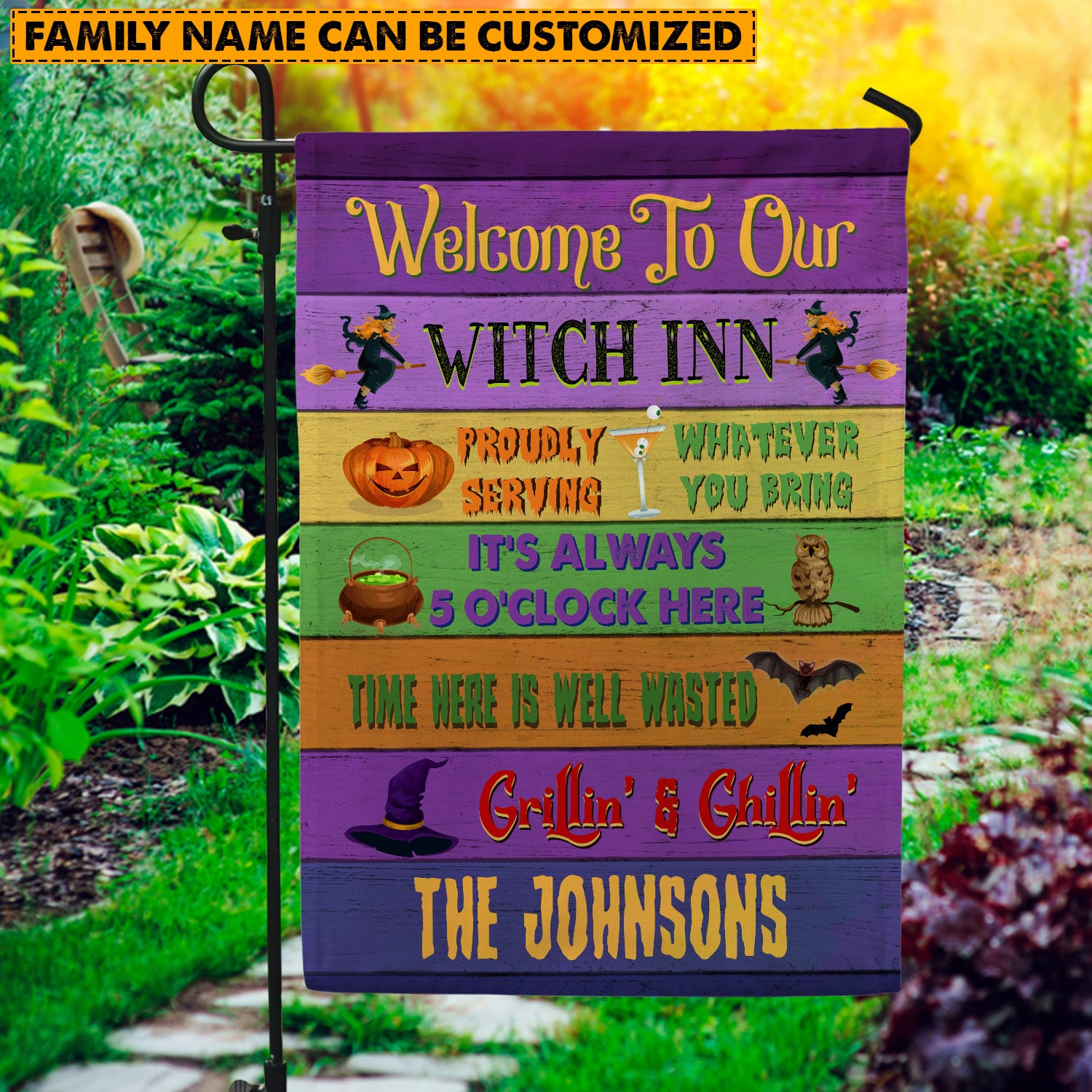 Let’s Shop Personalized Welcome To Our Witch Inn Proudly Serving Outdoor House Flag – Witch Halloween Home Garden Flag!