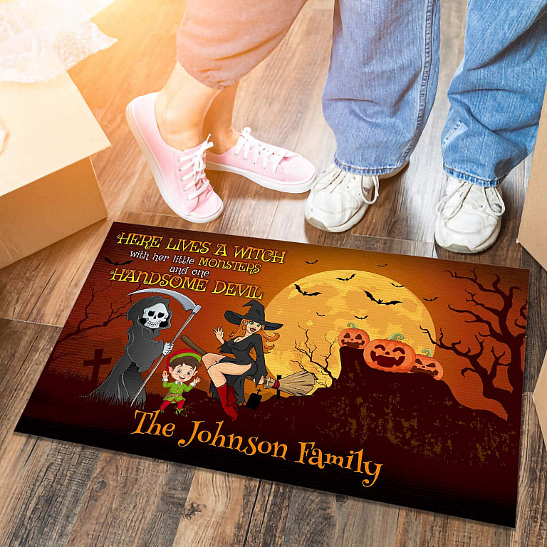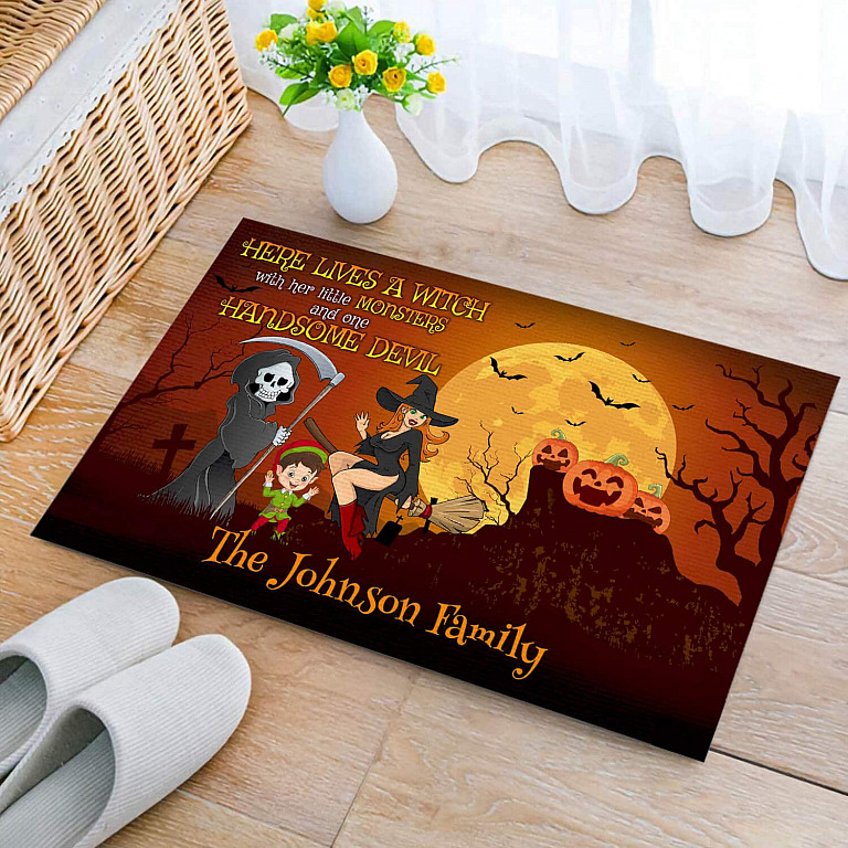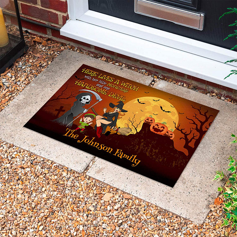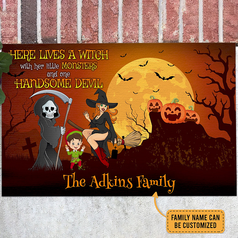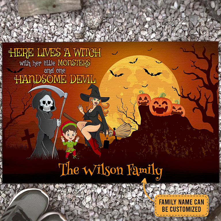 Let’s Shop Personalized Here Lives A Witch With Her Little Monsters And One Handsome Devil Doormat – Halloween Welcome Mat!