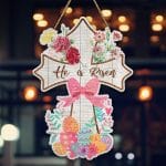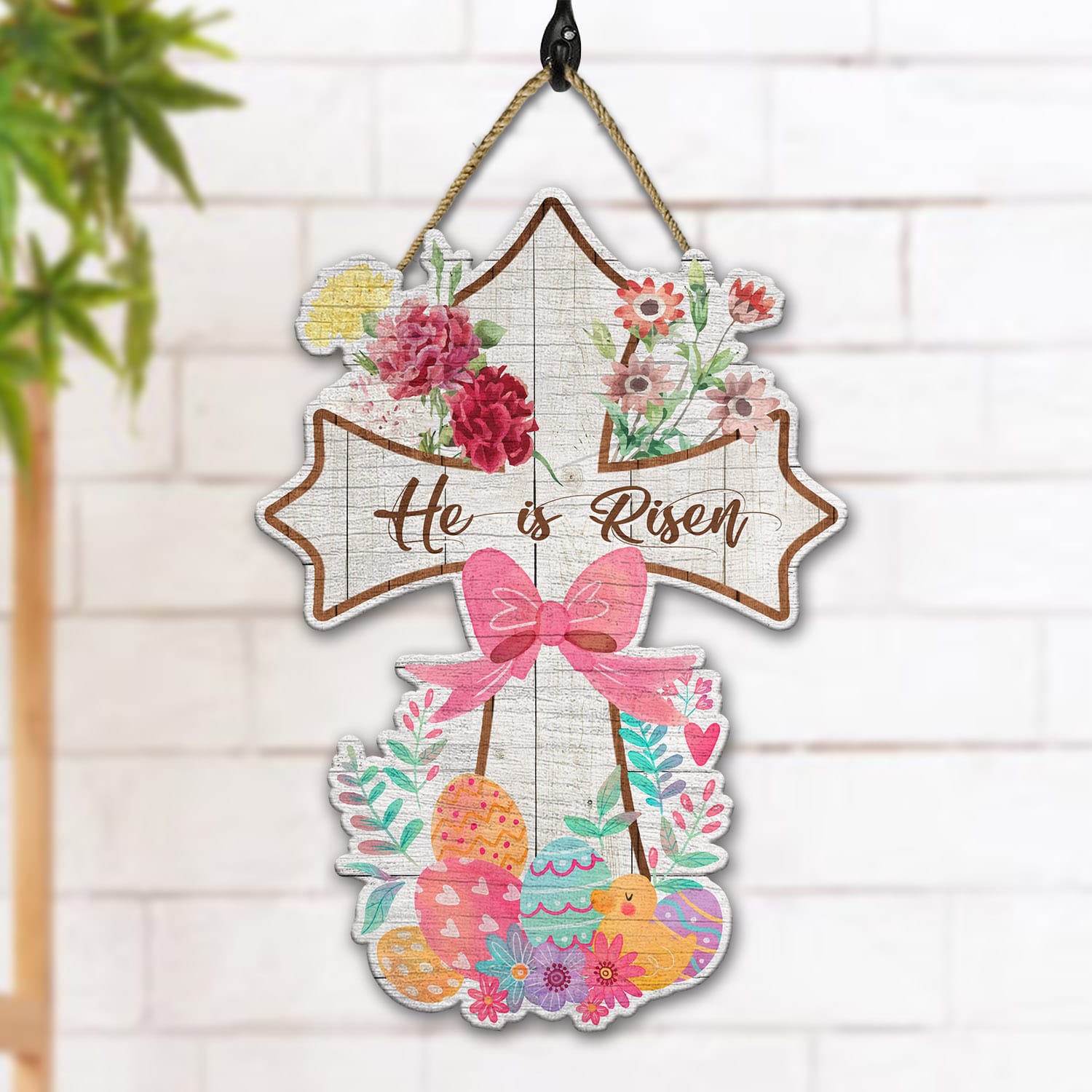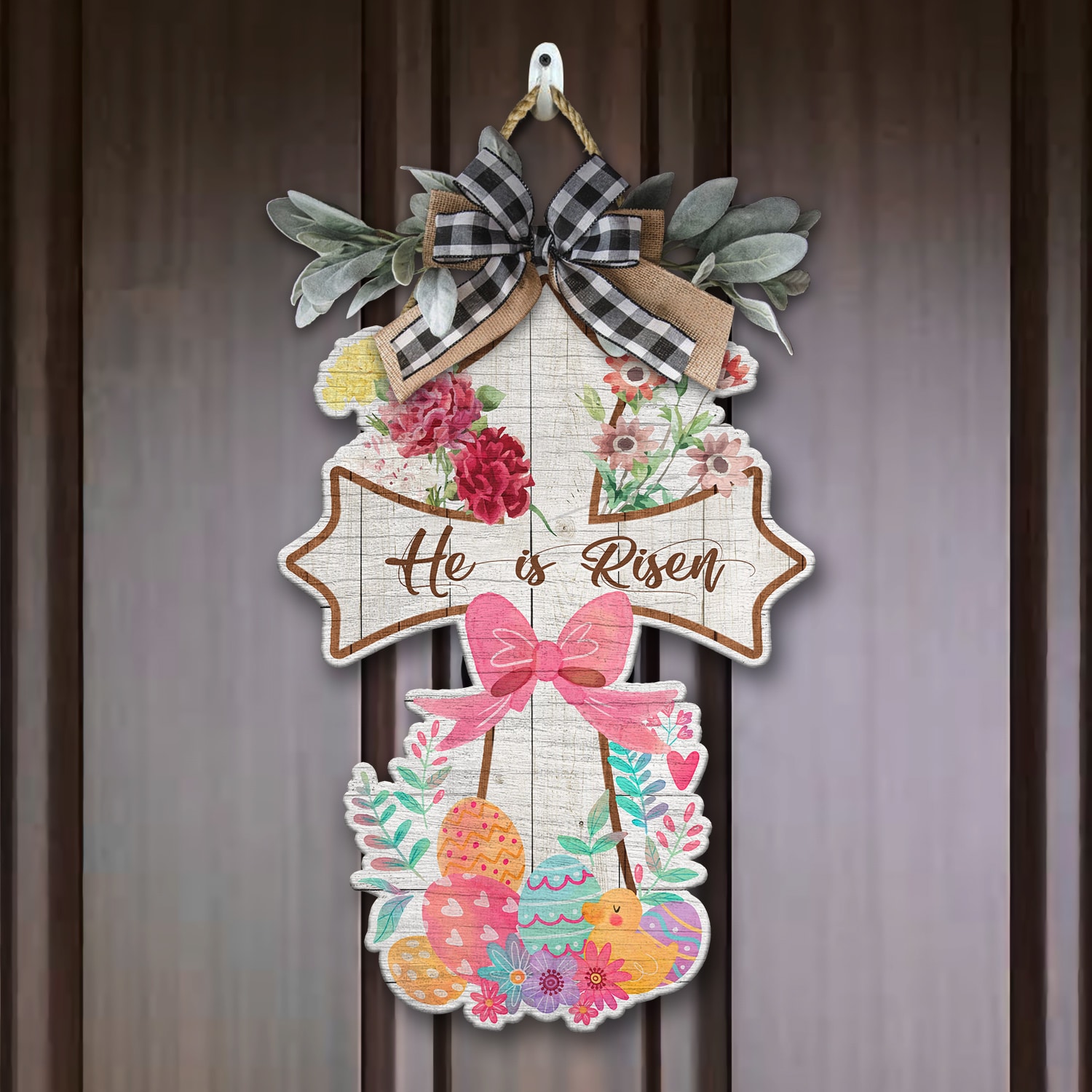 Let’s Shop He Is Risen Easter Eggs Decorative Circle Wooden Door Sign – Christian Cross Front Porch Sign!