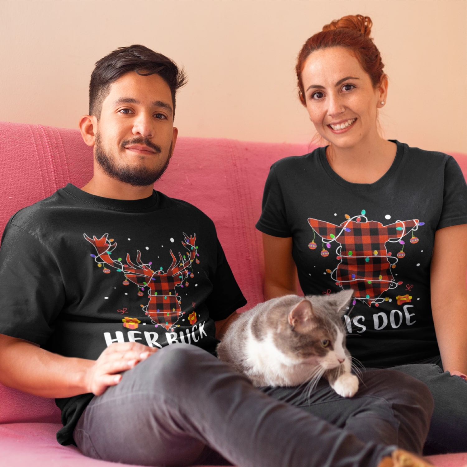 Her Buck Reindeer Red Plaid Funny Couples Matching T-Shirt – Hoodie – Sweatshirt – Long Sleeve