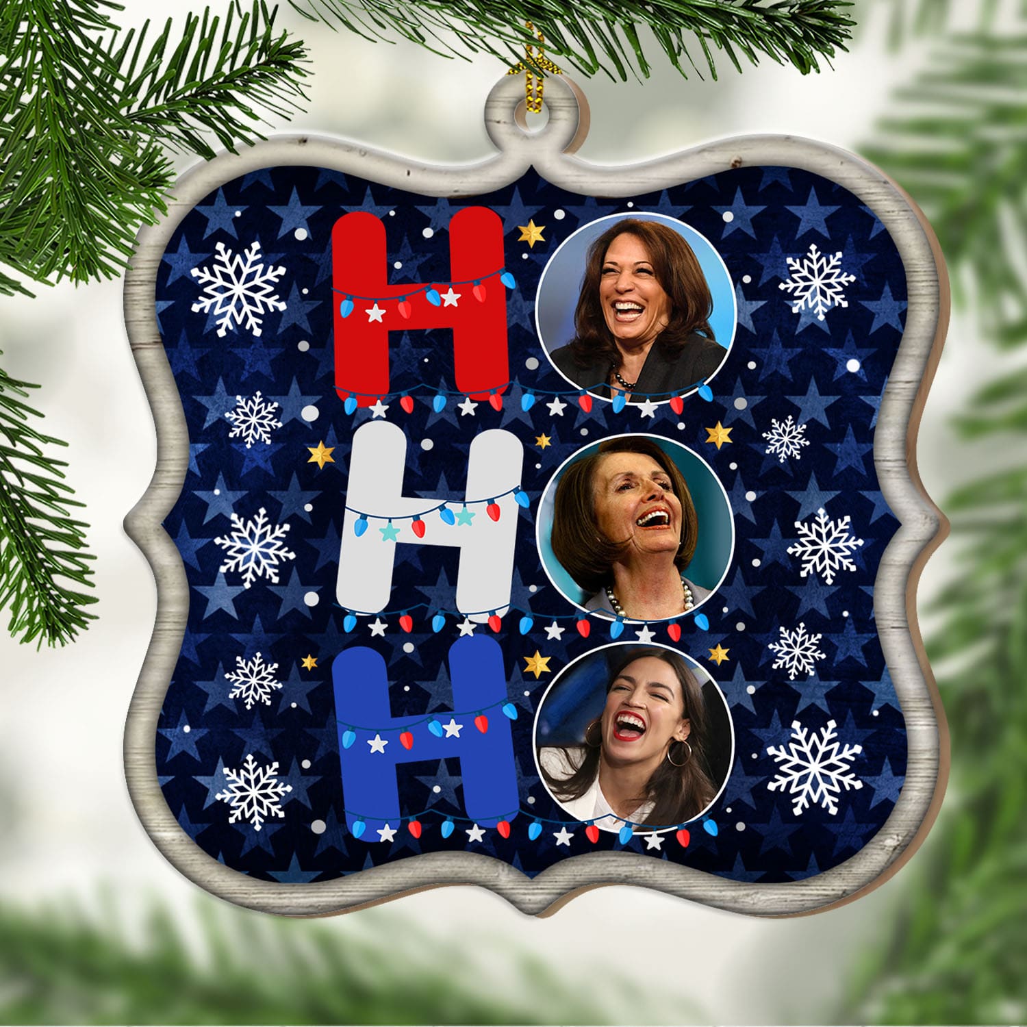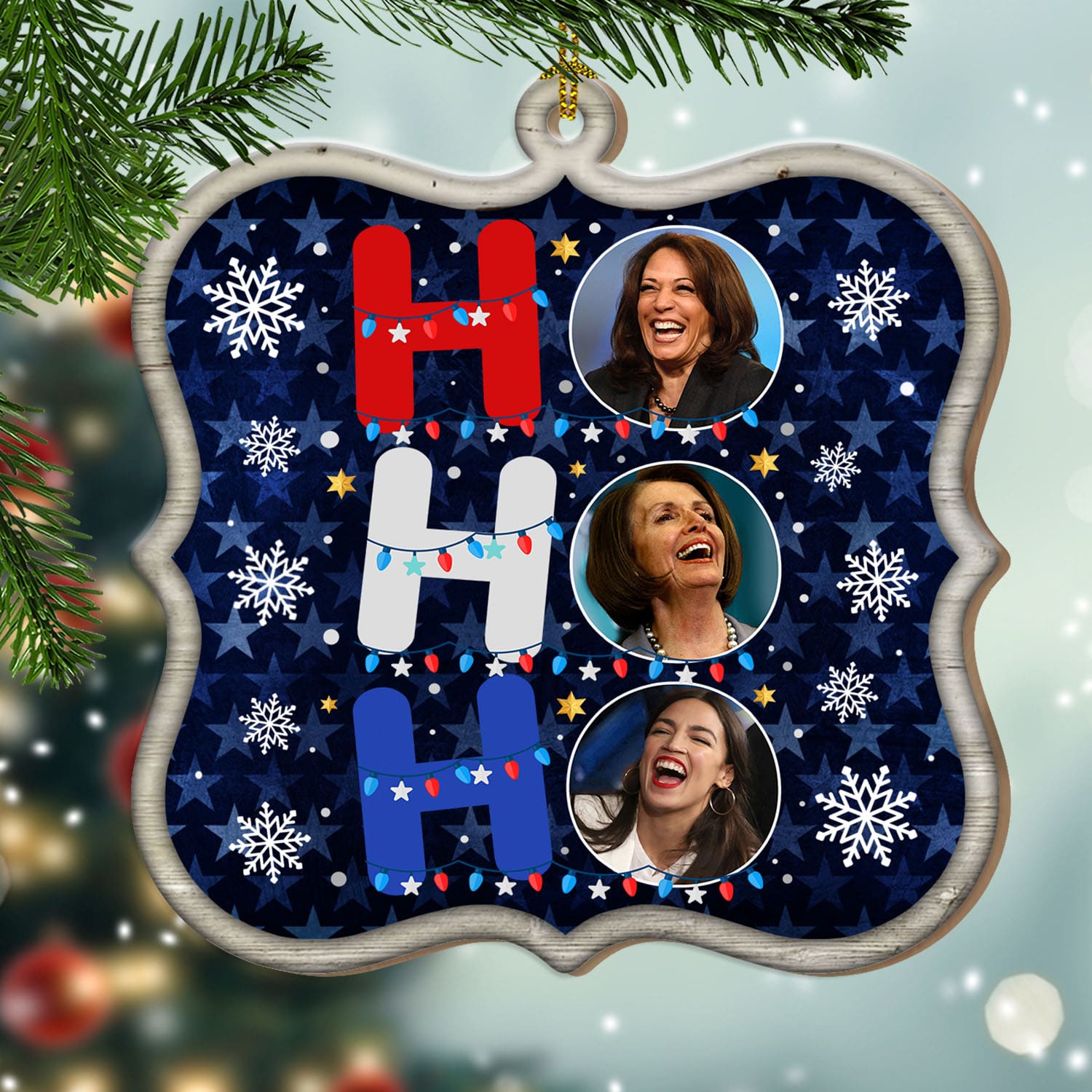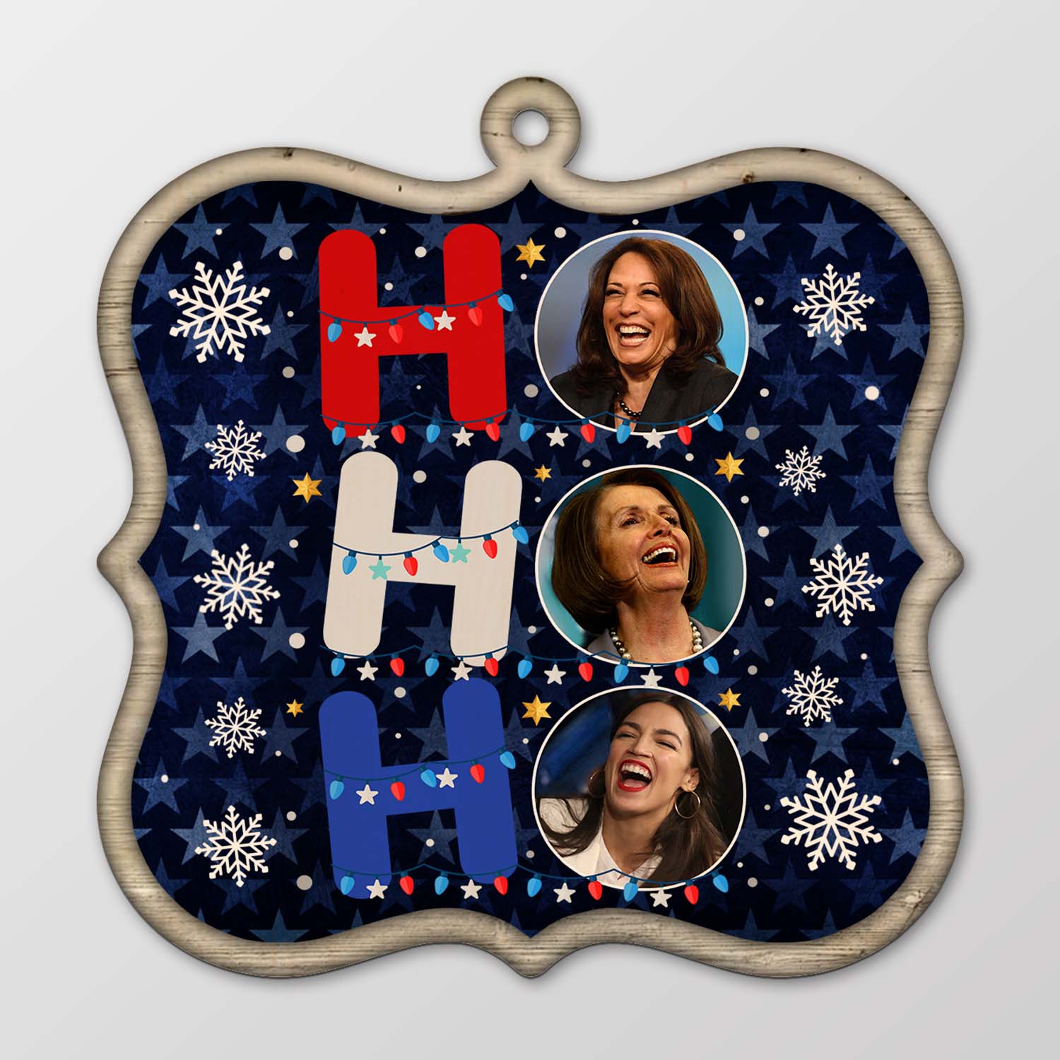 Let’s Shop Ho Ho Ho Pelosi Kamala Harris Alexandria Ocasio Funny Political Custom Shaped Wooden Christmas Ornament!
