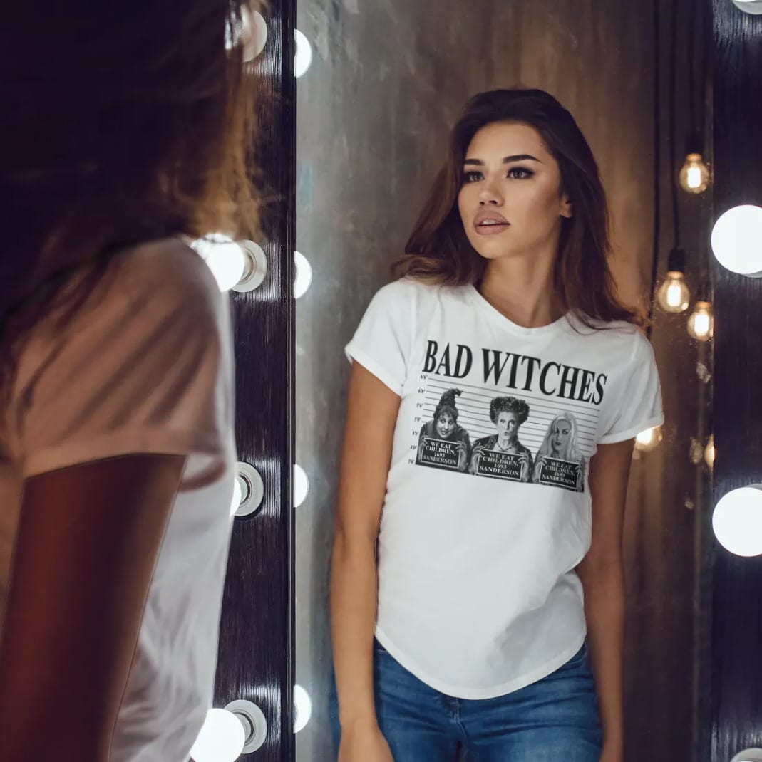 Bad Witches Sanderson Sisters Light T-shirt - V-neck - Funny Hocus Pocus Witches Halloween Shirt, White, V-Neck T-Shirt