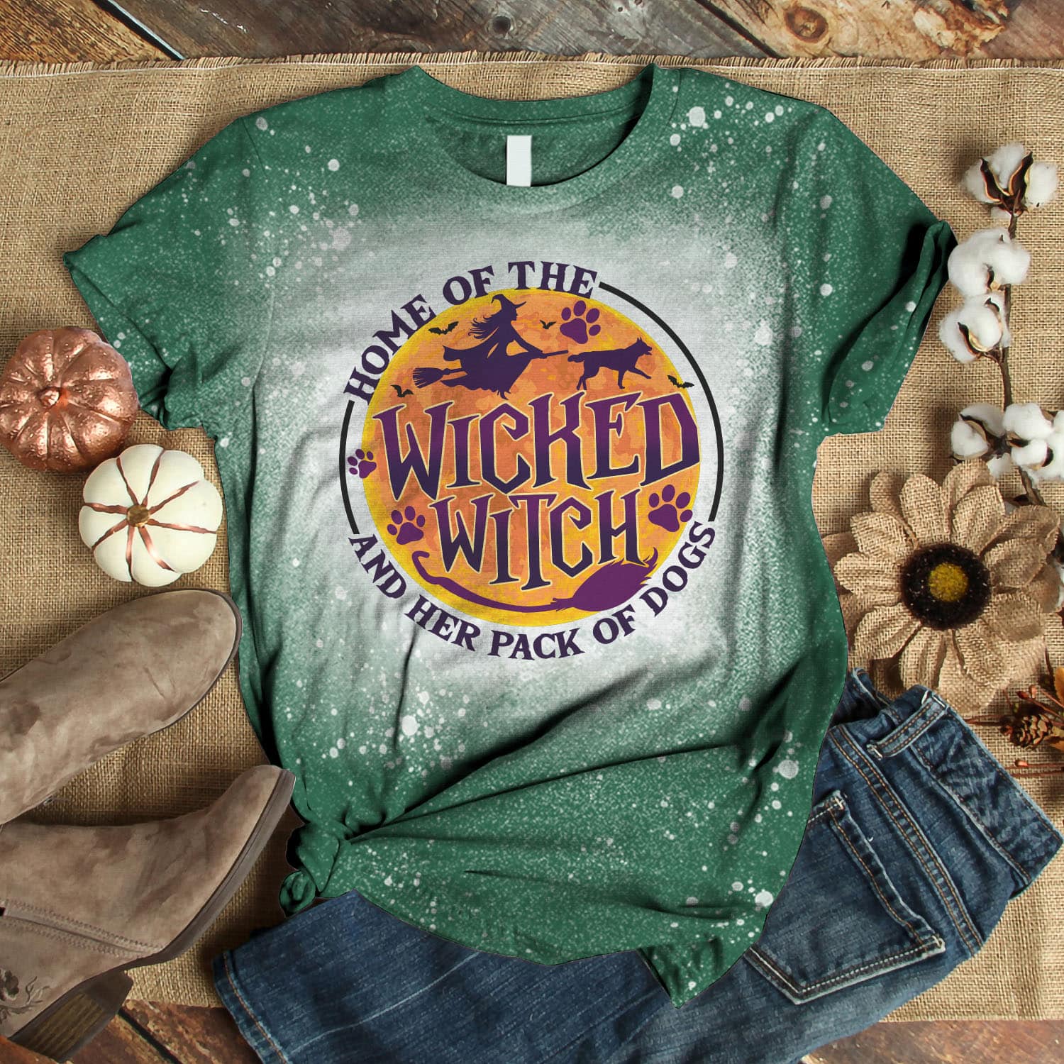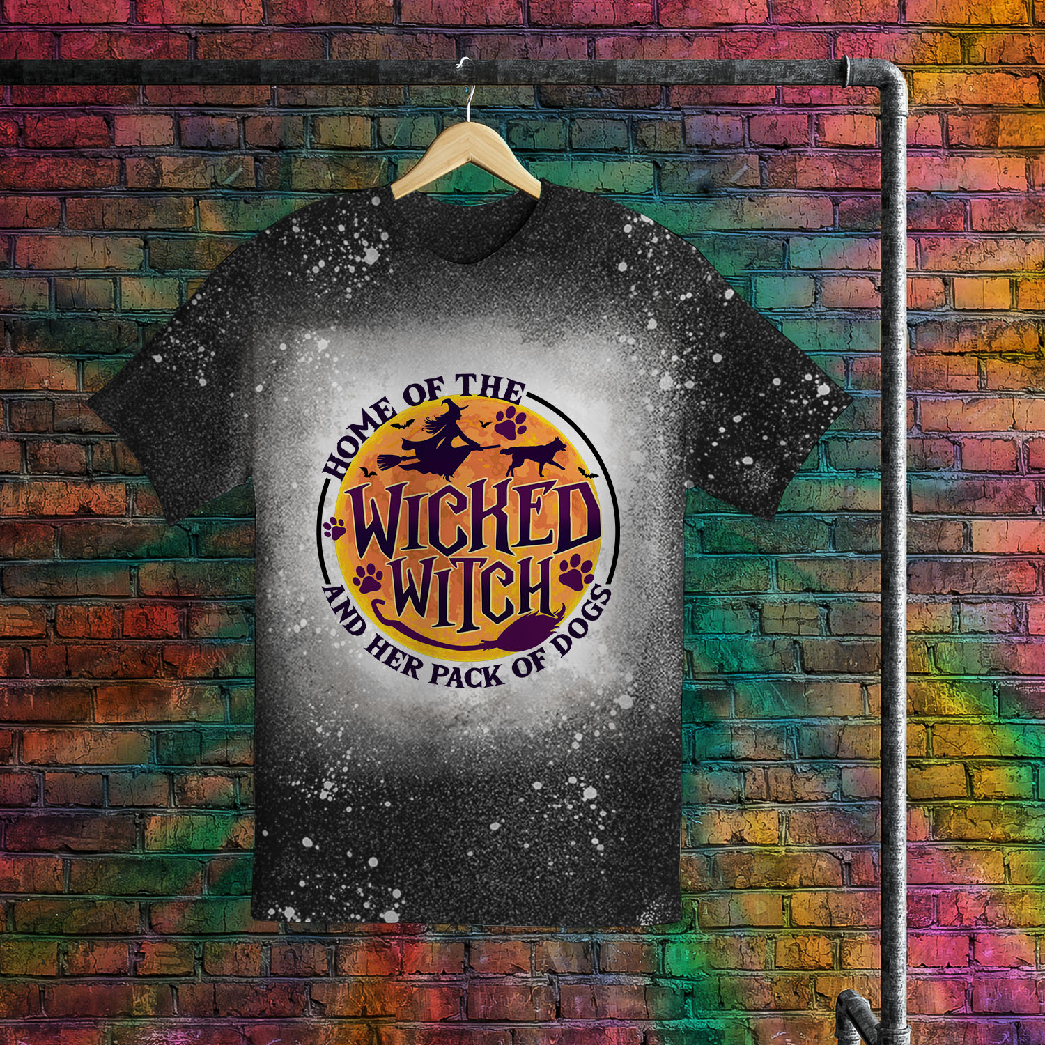 Home Of The Wicked Witch And Her Pack Of Dogs Funny Witch Halloween Bleached T-Shirt – Halloween Dog Lover Shirt