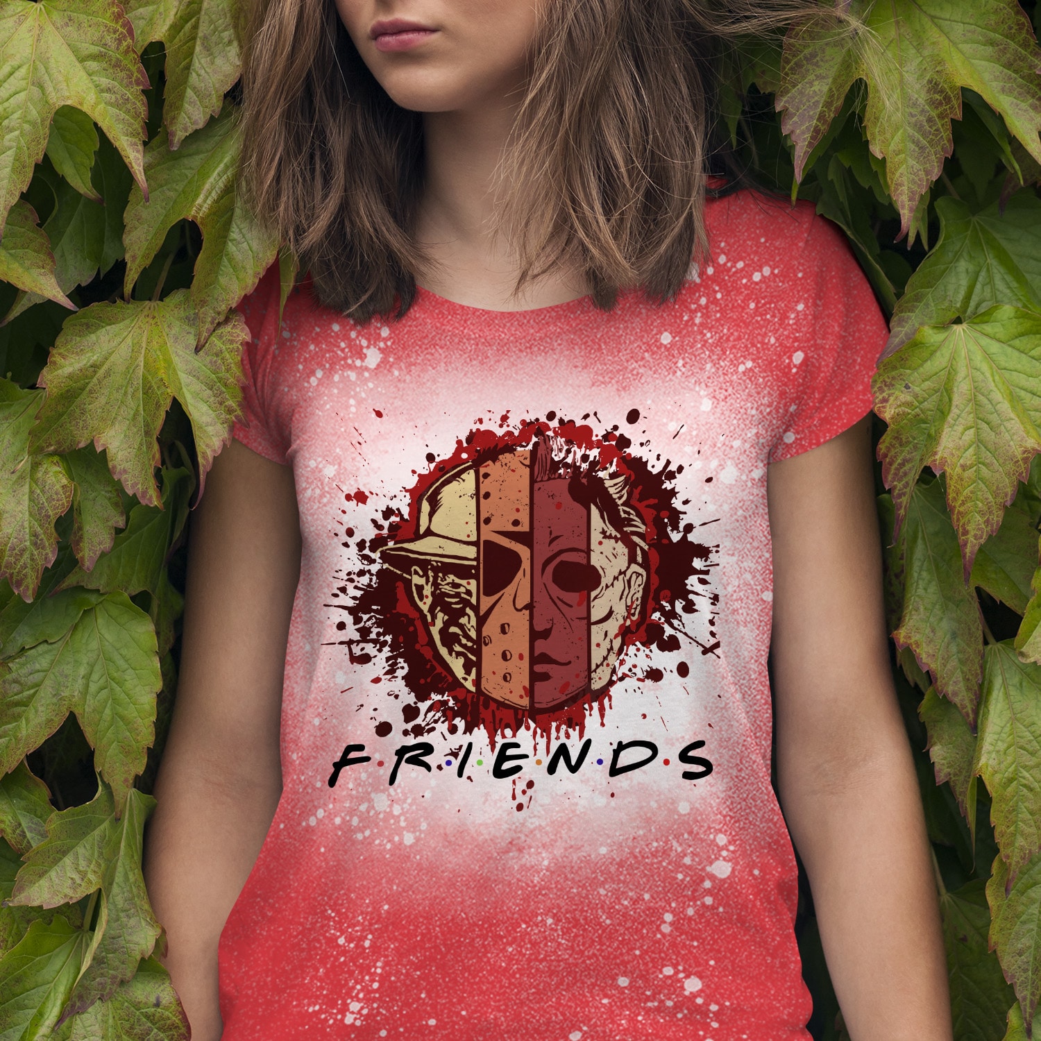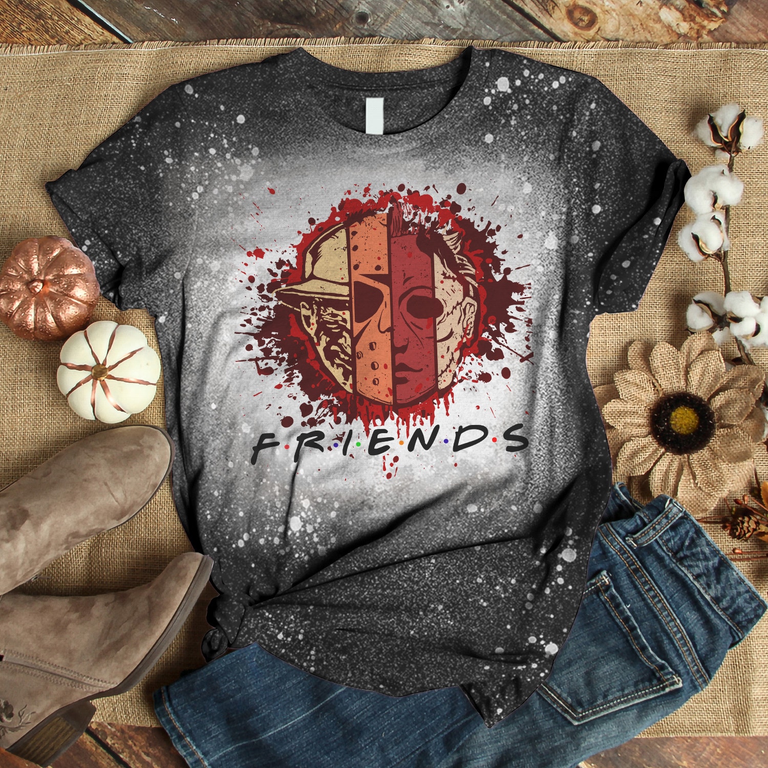 Scary Movie Characters Horror Halloween Sublimation Bleached T-Shirt – Horror Faces Friends Bleached Shirt