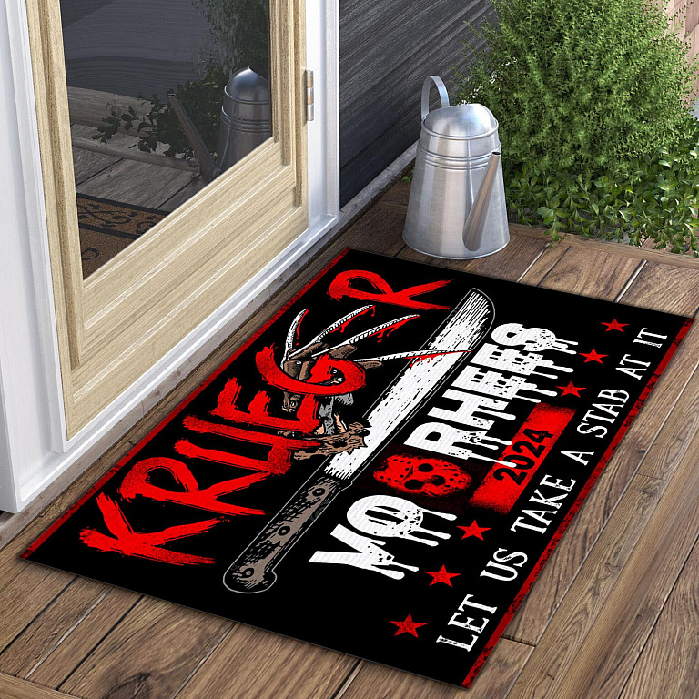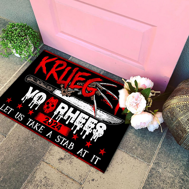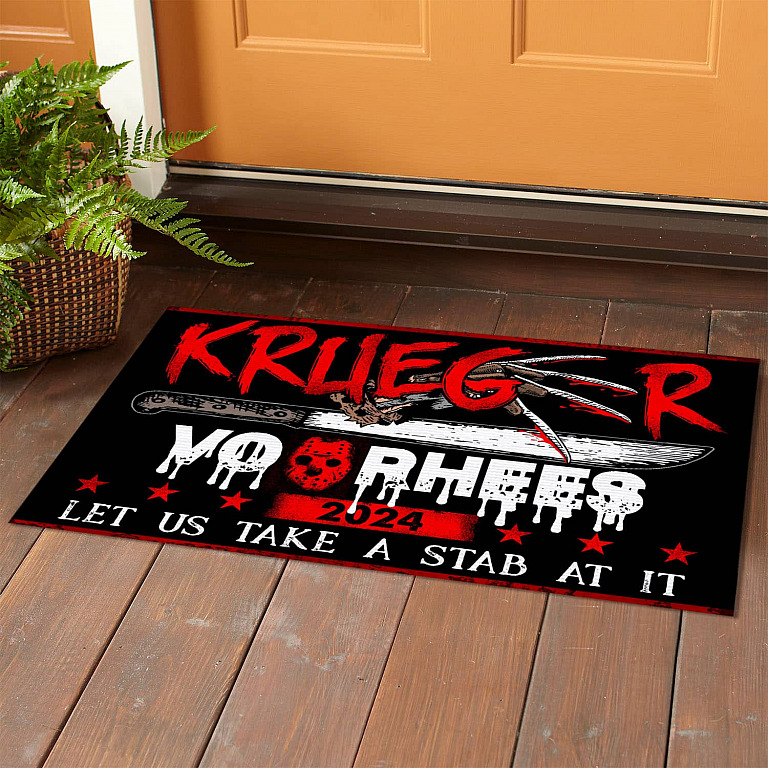 Let’s Shop Krueger Voorhees 2024 Let Us Take A Stab At It House Doormat – Funny Halloween Outdoor Indoor Doormat!