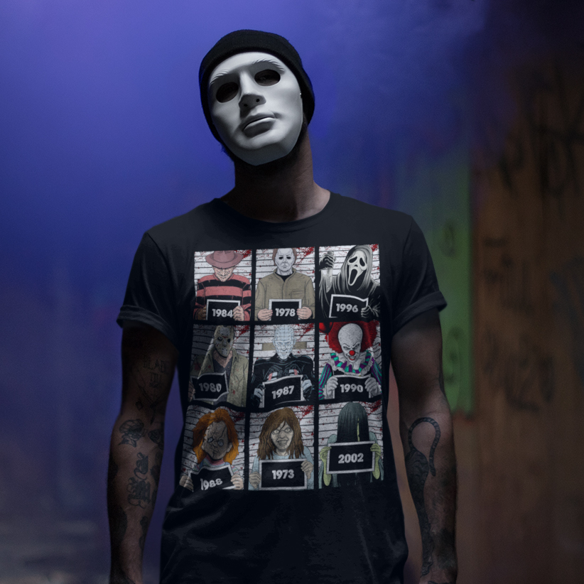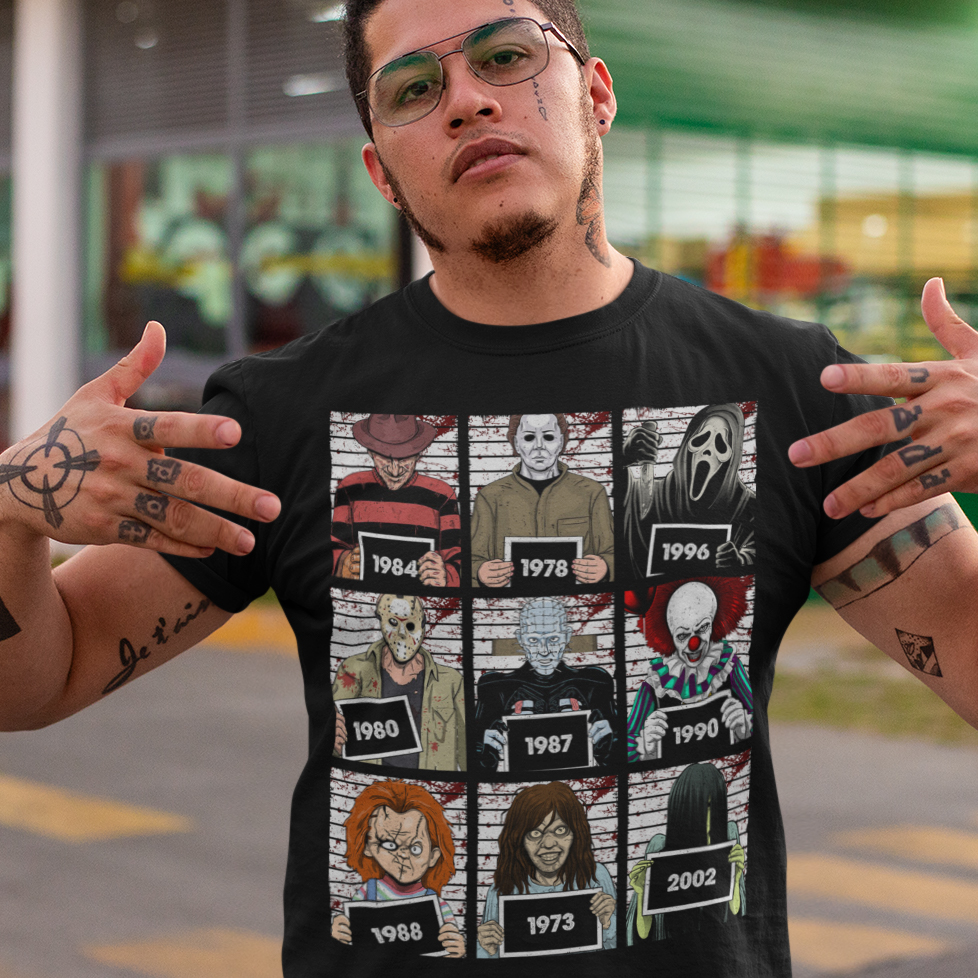 Horror Movie Characters Suspects Friends T-shirt - Horror Prison Squad Halloween Mugshot Style Shirt, Black, Unisex T-Shirt