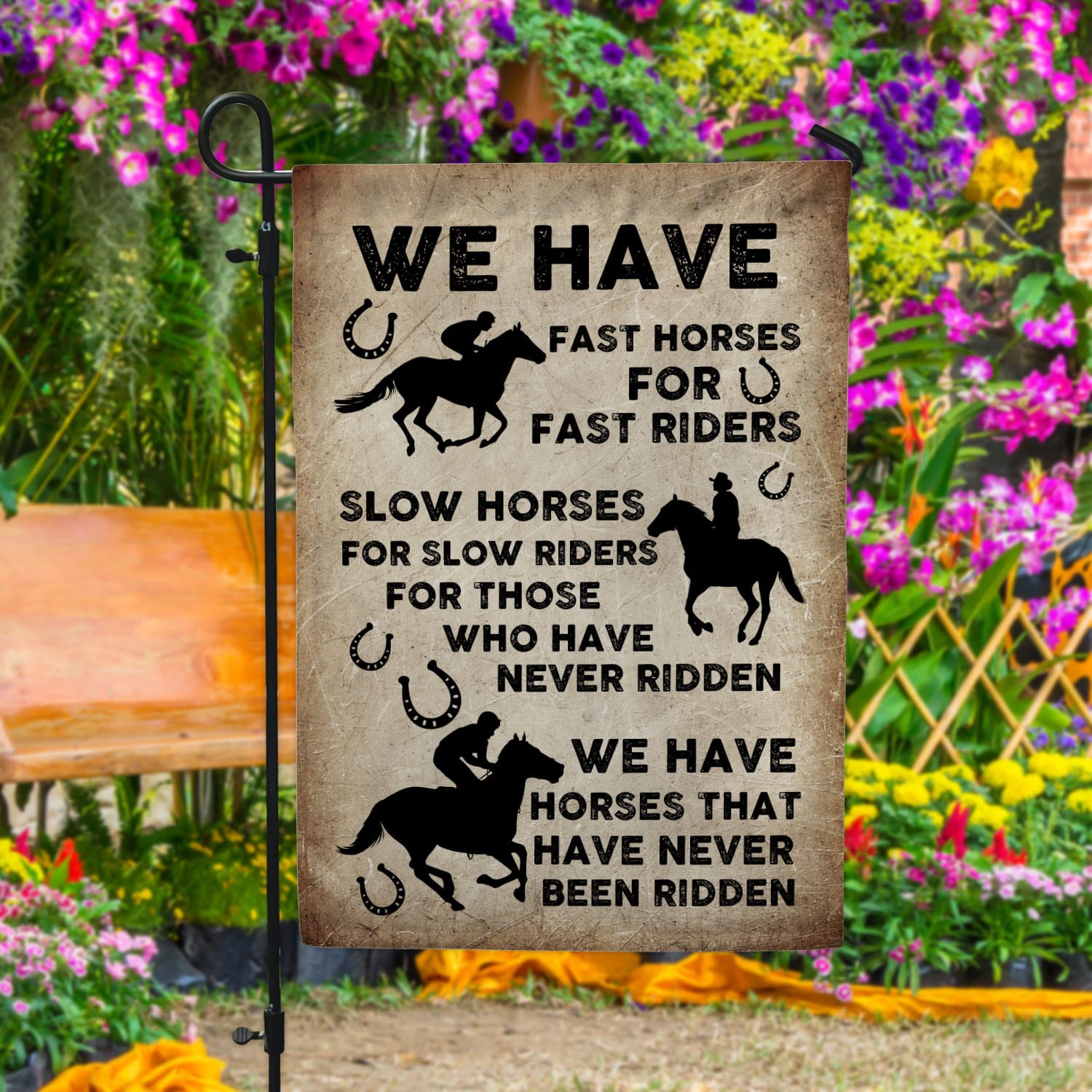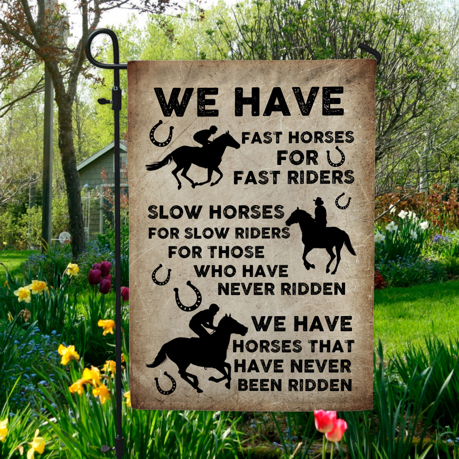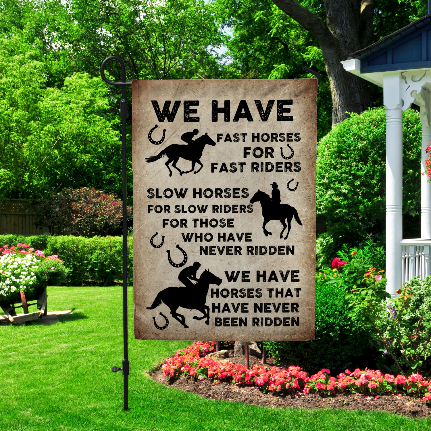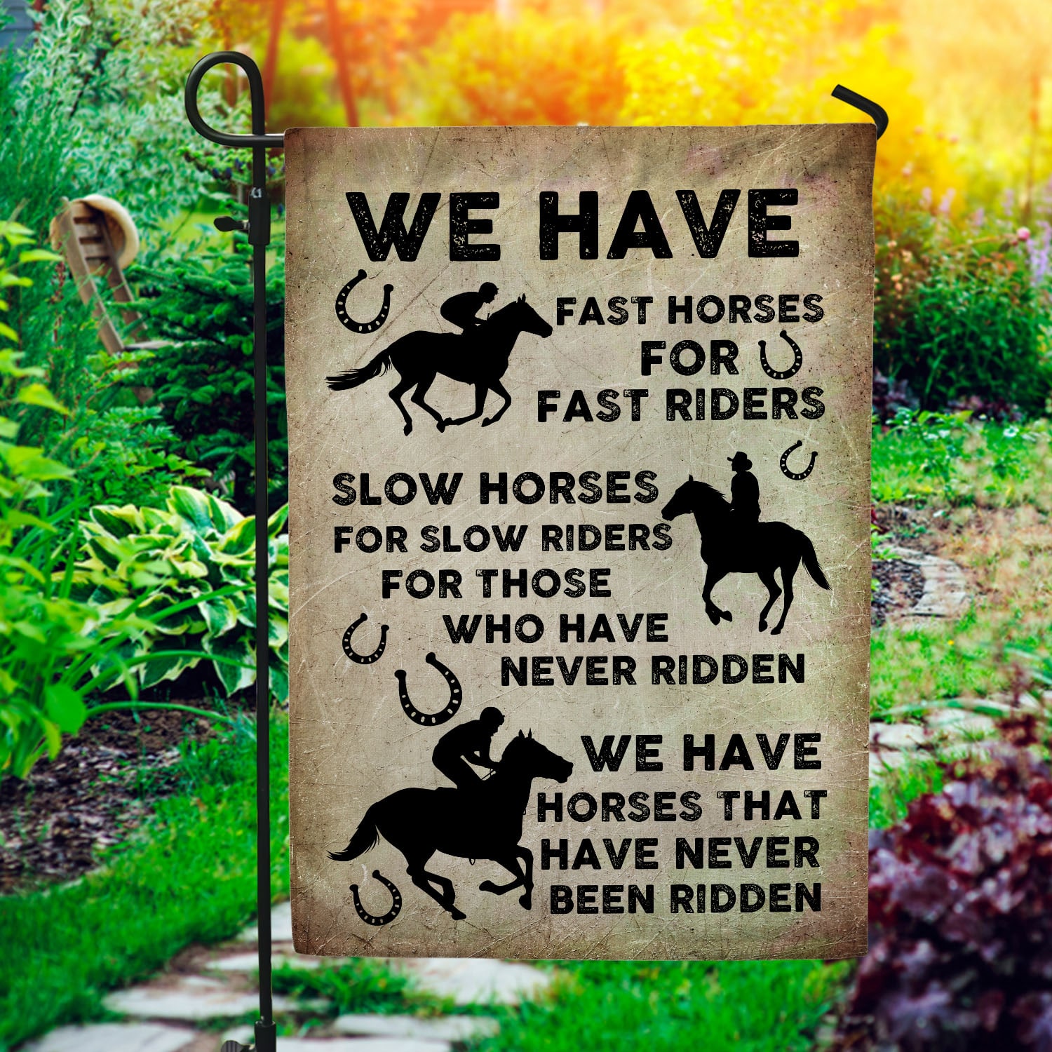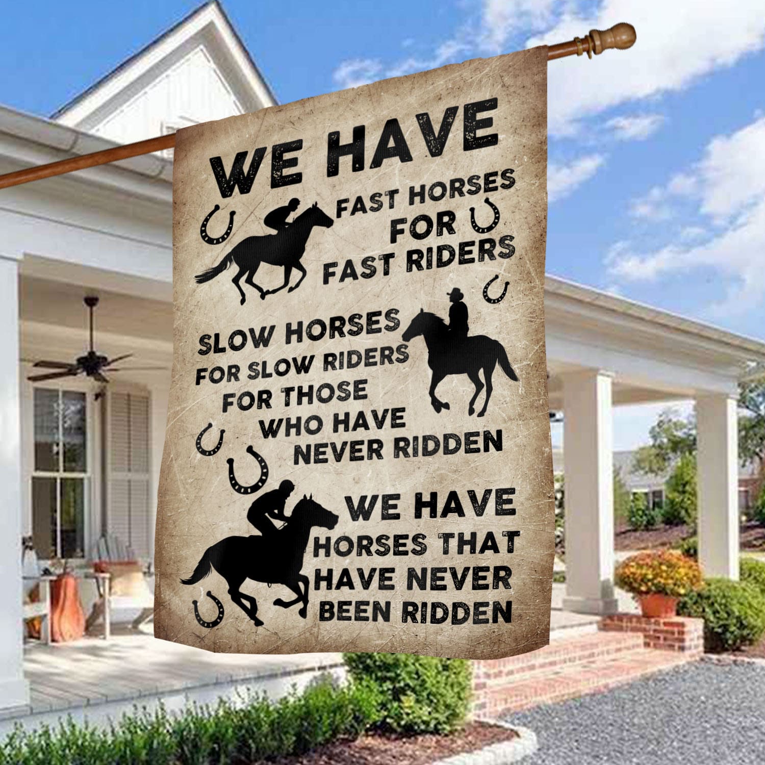 Let’s Shop We Have Fast Horses For Fast Riders Slow Horses For Slow Riders Outdoor House Flag – Home Garden Flag!