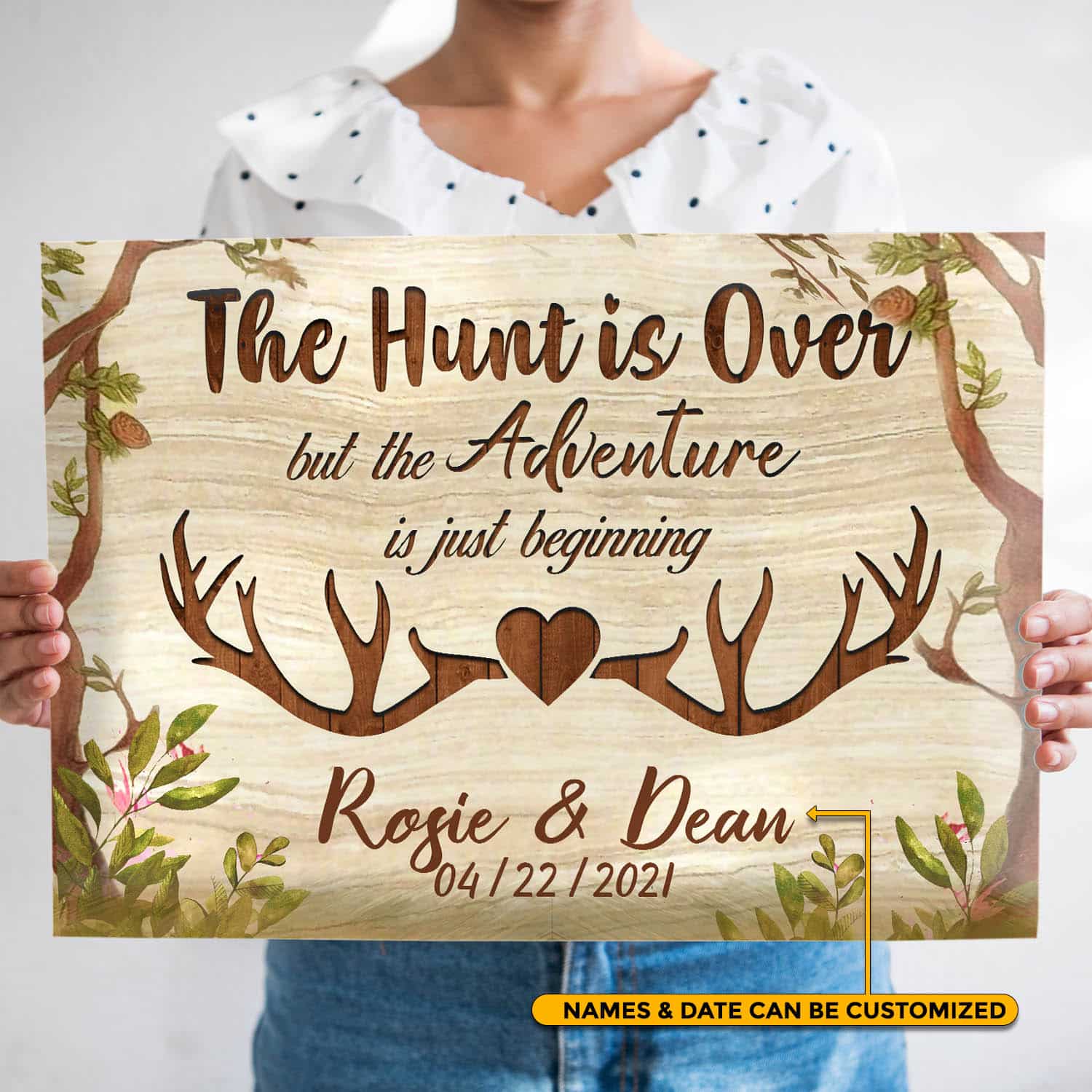 Let’s Shop The Hunt Is Over But The Adventure Is Just Beginning Personalized Name Framed Canvas – Hunting Wedding Unframed Poster!