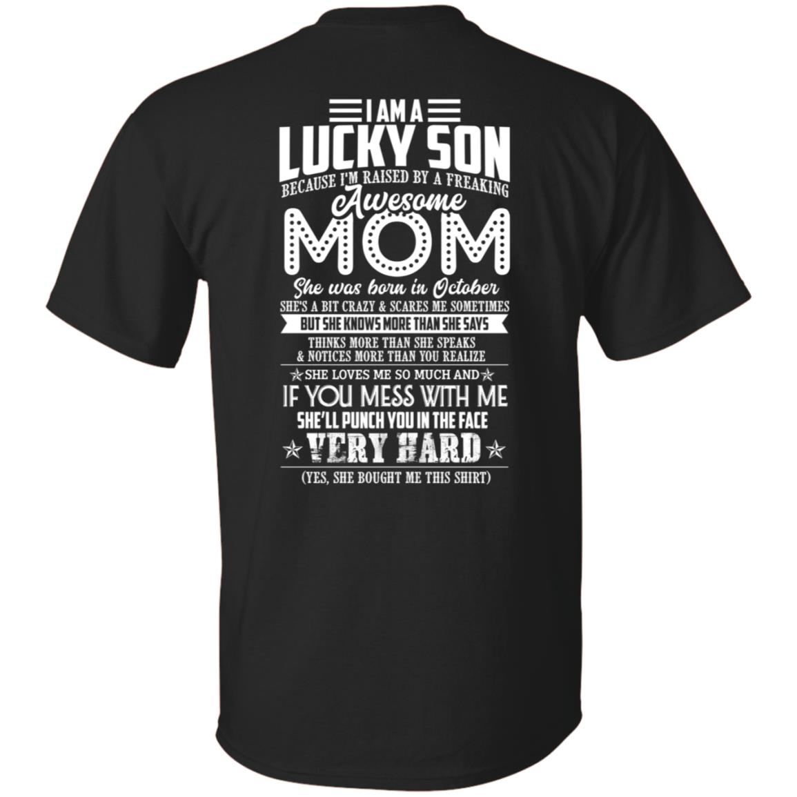 I Am Lucky Son I Am Raised By A Freakin Awesome October Mom She’s a Bit Crazy Print on Back T-Shirt- V-Neck