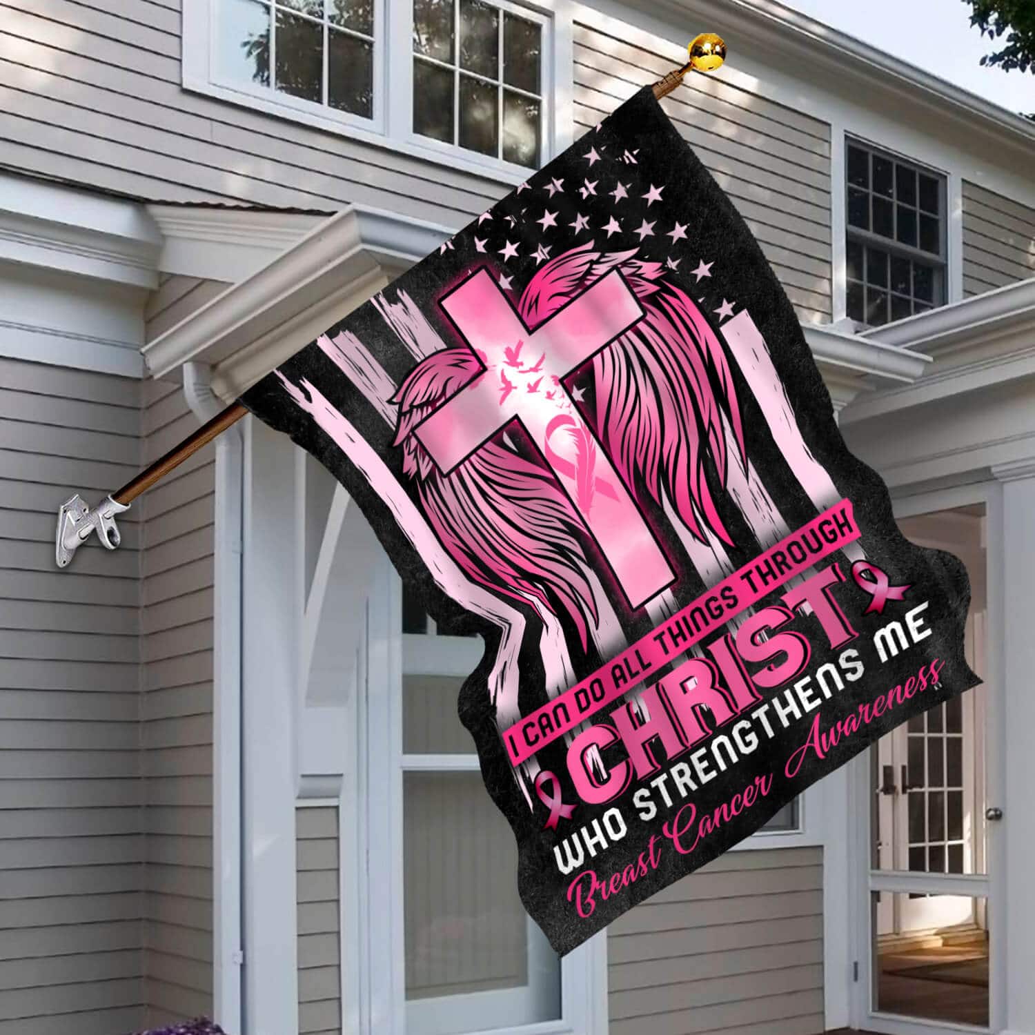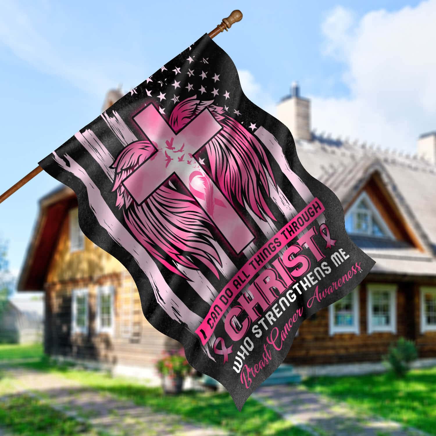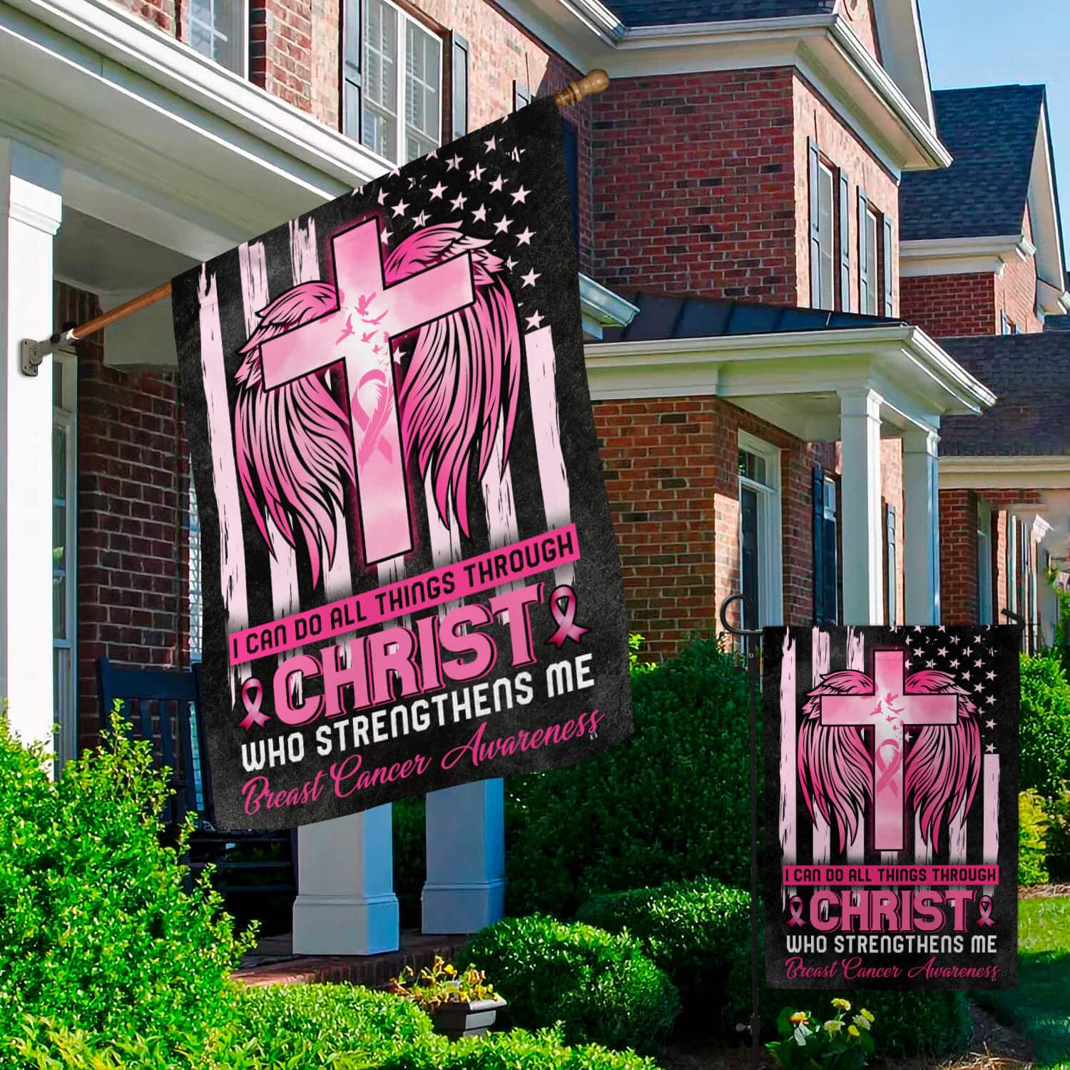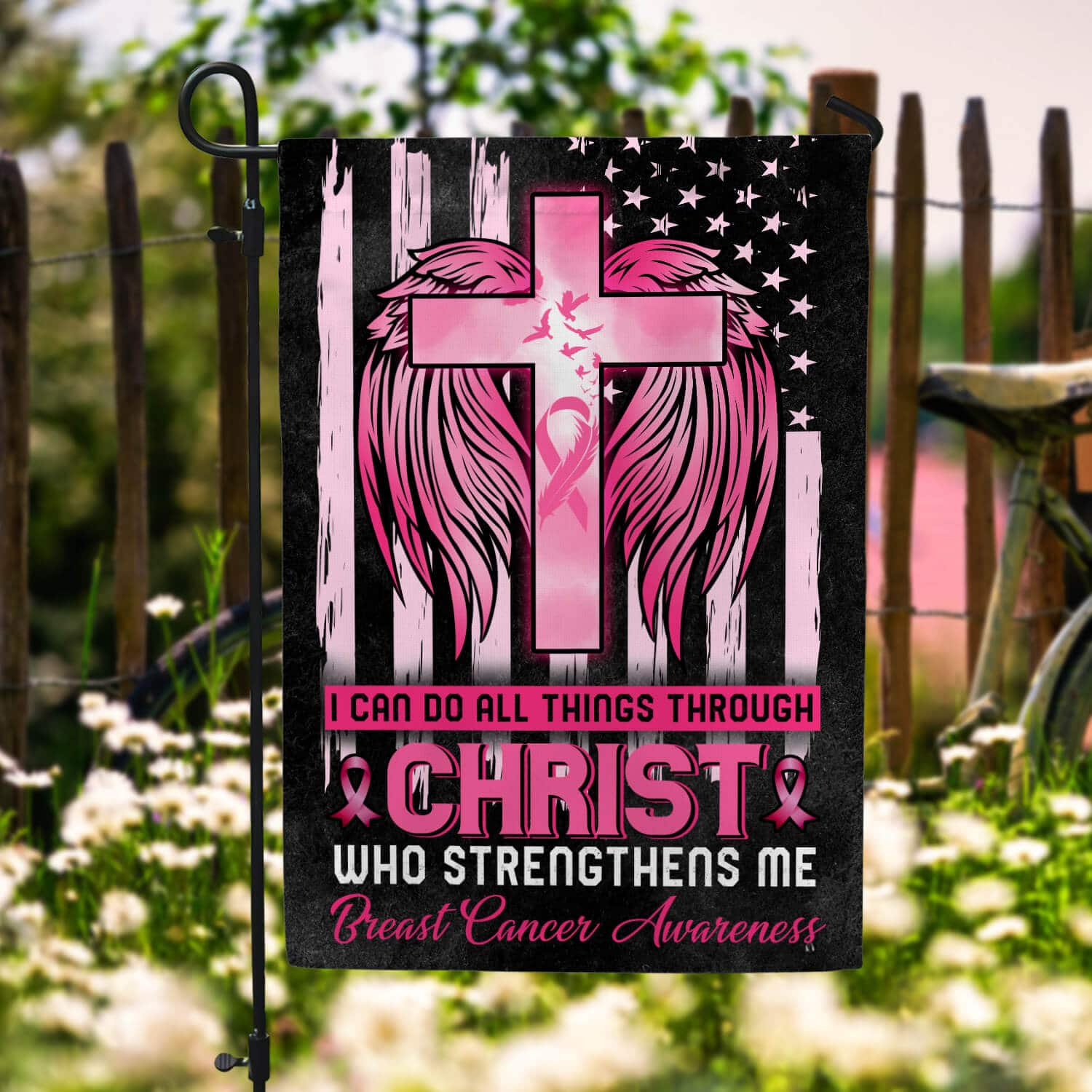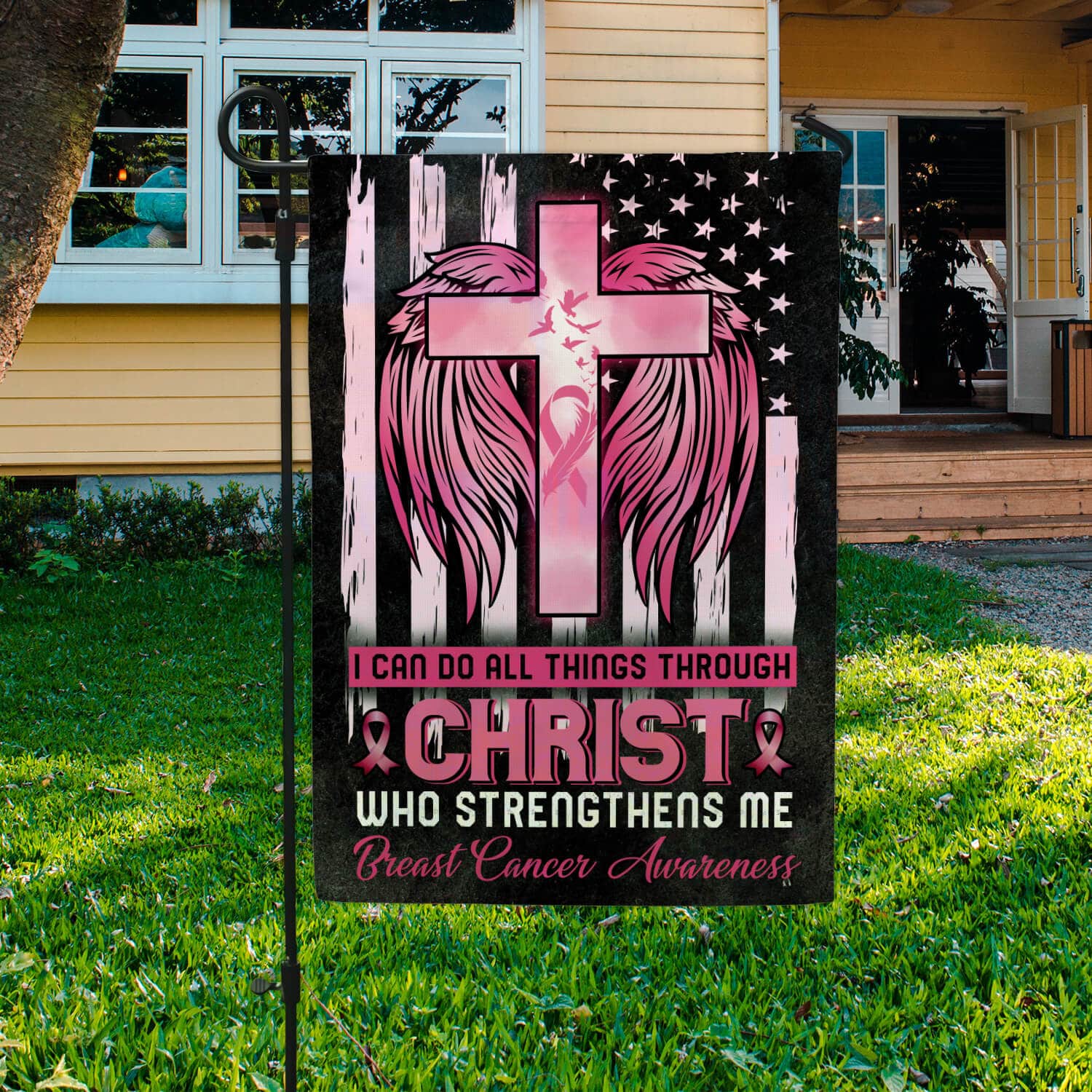Let’s Shop I Can Do All Things Through Christ Who Strengthens Me Garden Flag – Breast Cancer Awareness House Flag!