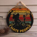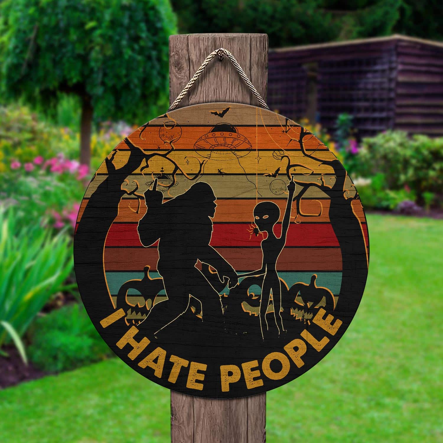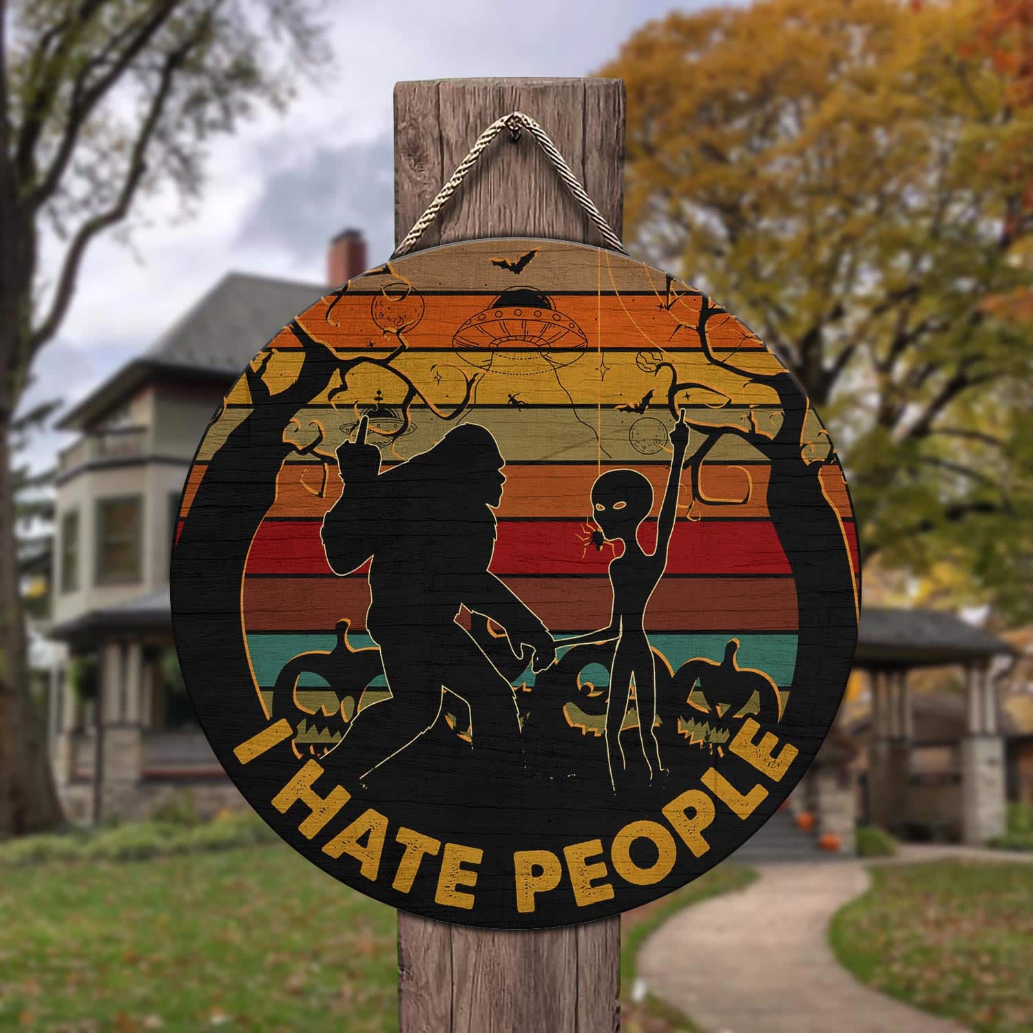 Let’s Shop I Hate People Funny Bigfoot Alien Pumpkin Halloween Circle Wooden Door Sign – Front Porch Sign!