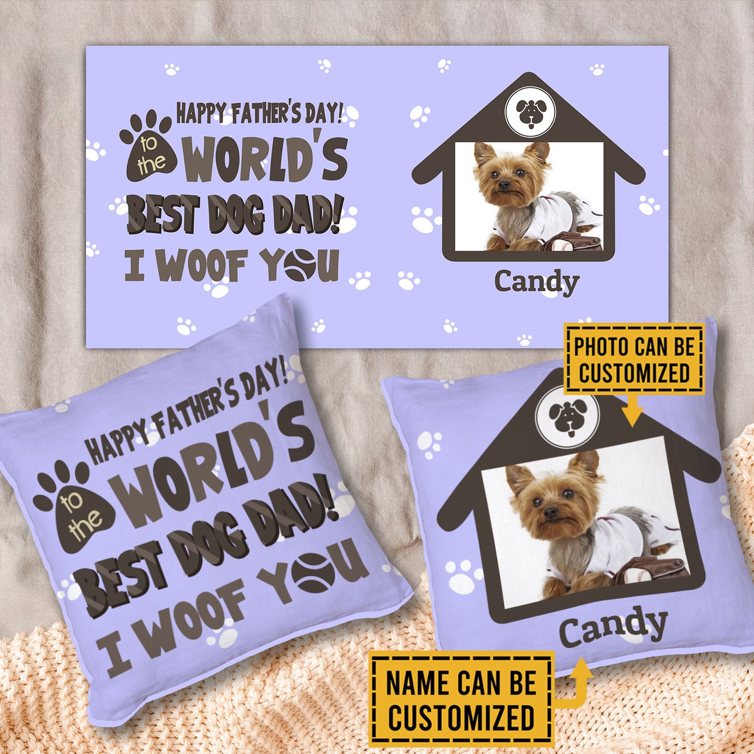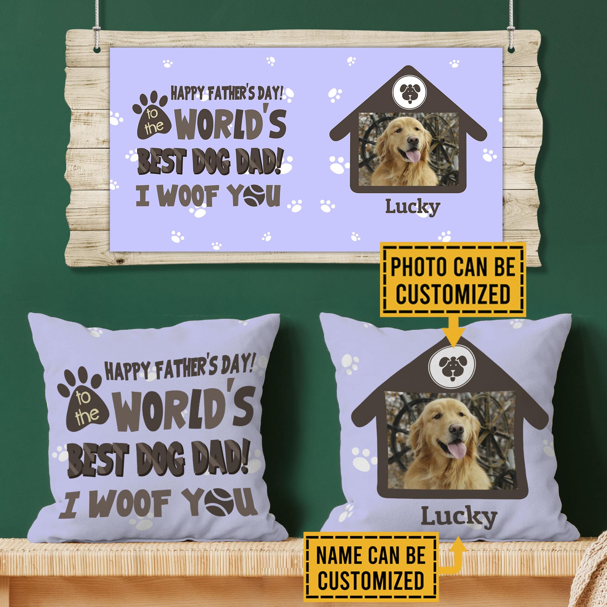 Are you spending too much time to find creative merchandise for you or suitable & special gifts for your mommy, your daddy, your son, your daughter, your children, your friends or someone you love? The struggle is over because we have various I Woof You Pillow, Throw Pillows Woof, Woof Dog Pillow, Woof Dog Bed Pillow, Dog Dad Pillow, Worlds Best Dog Dad Throw Pillow which will make perfect presents for your beloveds. In order to make your present stand out, we have created lots of unique and awesome customized photo gifts & personalized designs.