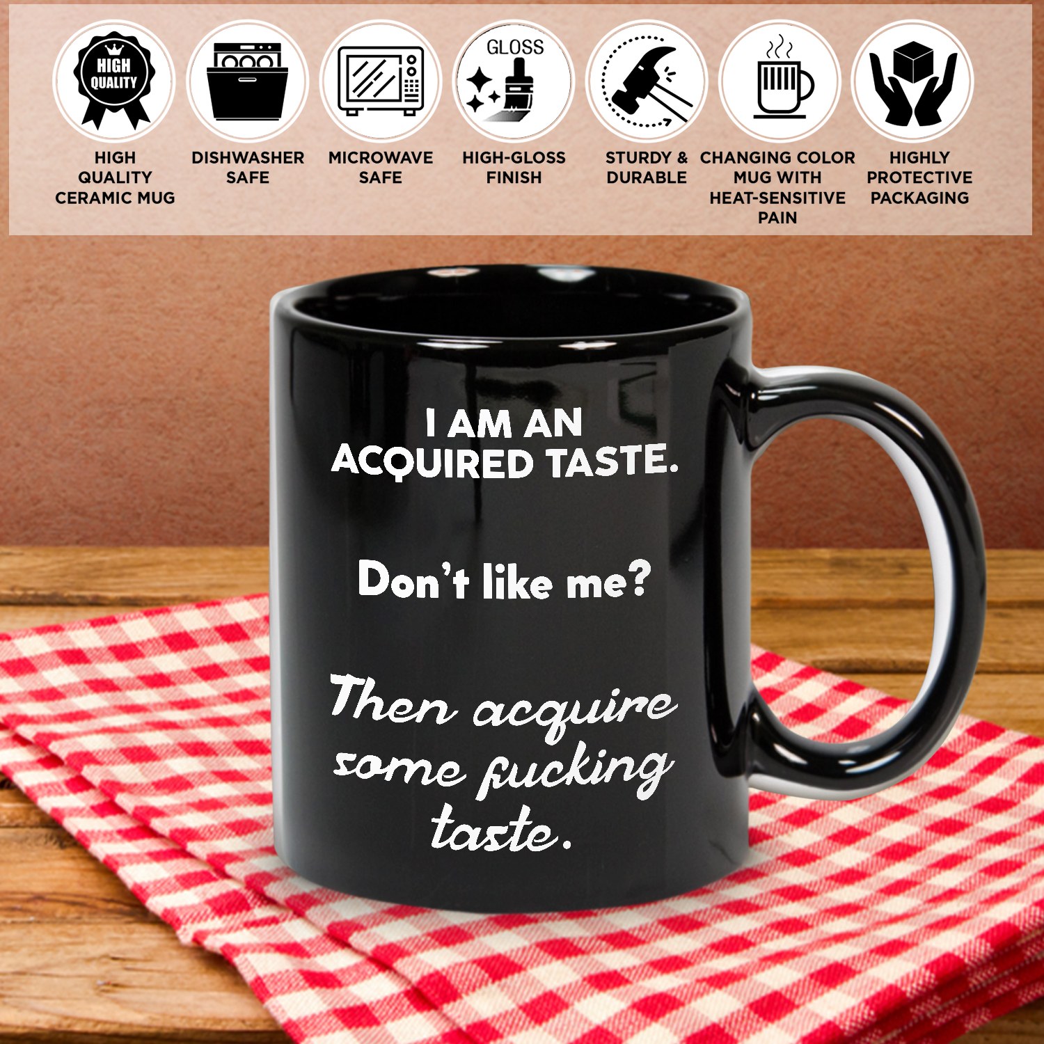 Are you spending too much time to find creative merchandise for you or suitable & special gifts for your mommy, your daddy, your son, your daughter, your children, your friends or someone you love? The struggle is over because we have various type of products such as Iam An Acquired Taste Like Me Mug, Acquired Taste Mug, Acquired Taste Coffee Cup, Iam An Acquired Taste Coffee Cup, Funny Mug, Funny Coffee Cup which will make perfect presents for your beloveds. In order to make your present stand out, we have created lots of unique and awesome customized photo gifts & personalized designs.