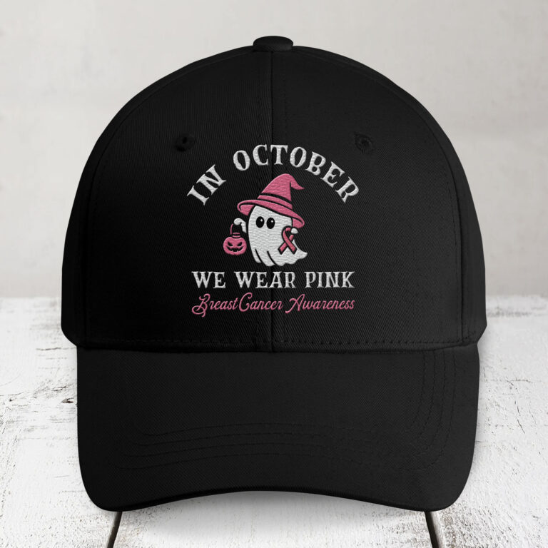 Let’s Shop In October We Wear Pink Cute Boo Ghost Halloween Breast Cancer Awareness Embroidered Twill Hat Adjustable Cap!