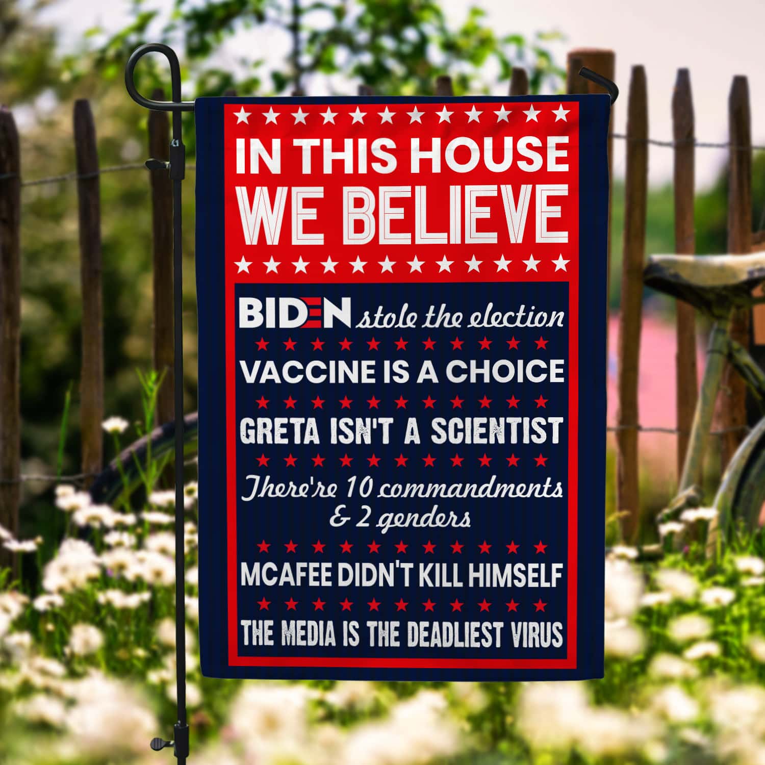 Are you spending too much time to find creative merchandise for you or suitable & special gifts for your mommy, your daddy, your son, your daughter, your children, your friends or someone you love? The struggle is over because we have various Biden Stole the Election Flag, in This House We Believe Biden Stole the Election Flag, Media Is the Deadliest Virus Flag, in This House We Believe Vaccine Is a Choice Flag which will make perfect presents for your beloveds. In order to make your present stand out, we have created lots of unique and awesome customized photo gifts & personalized designs.