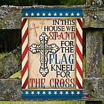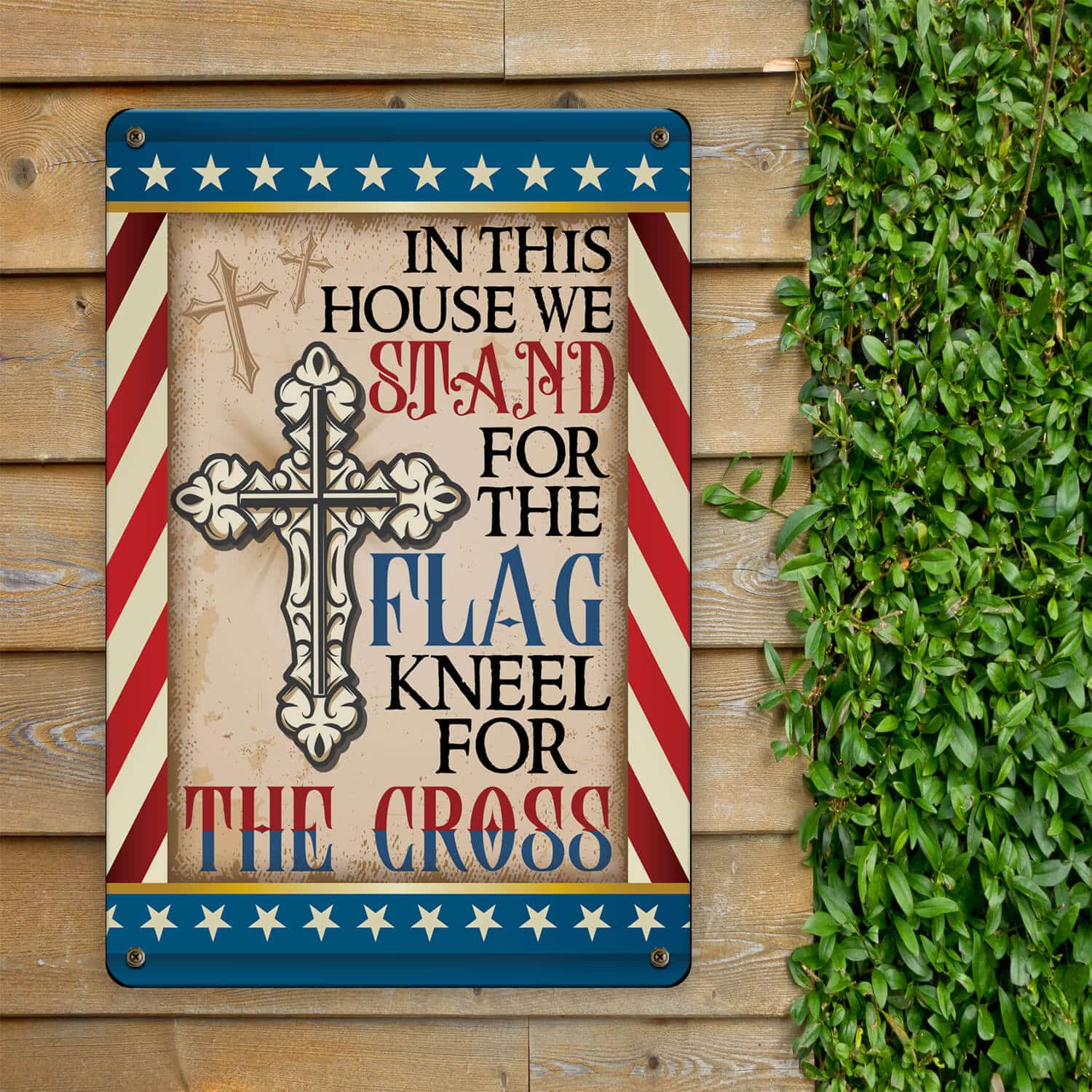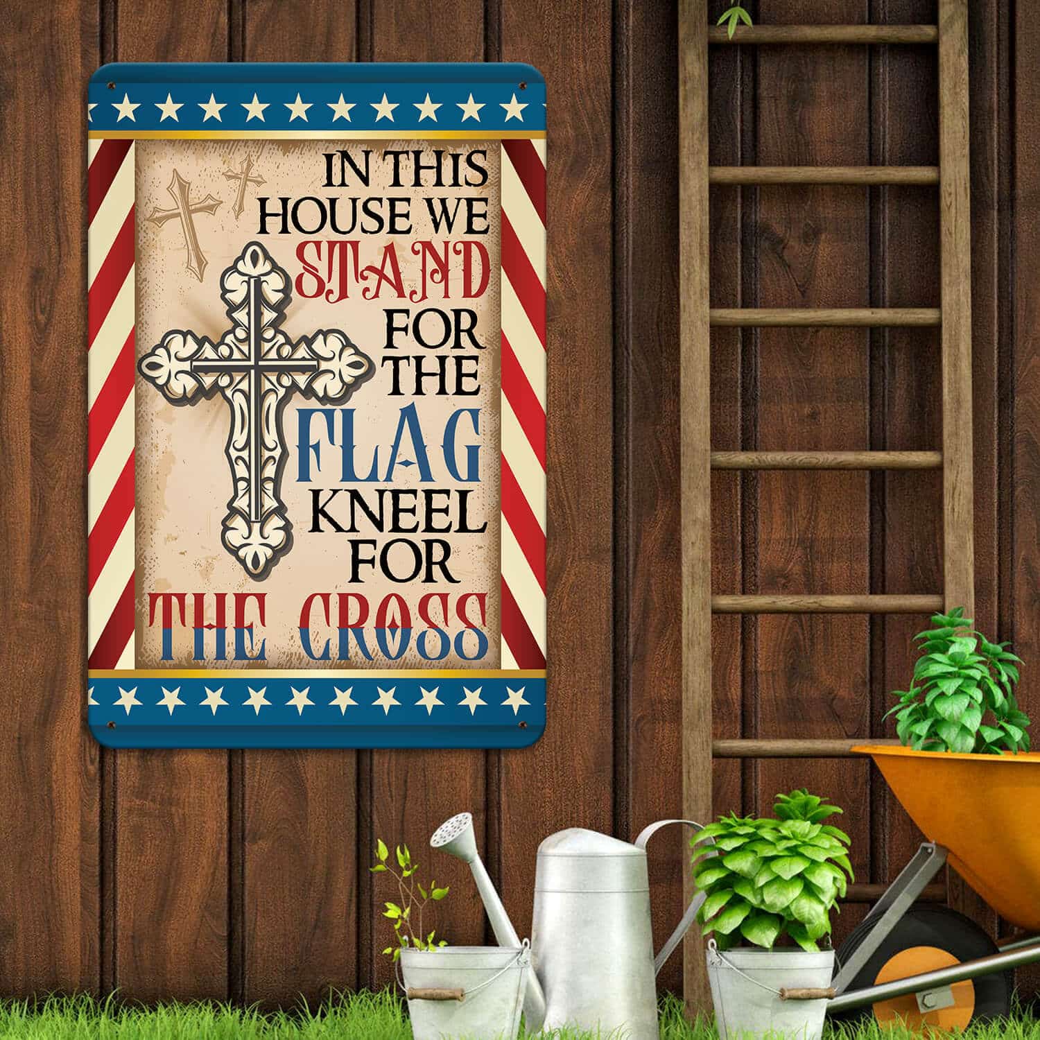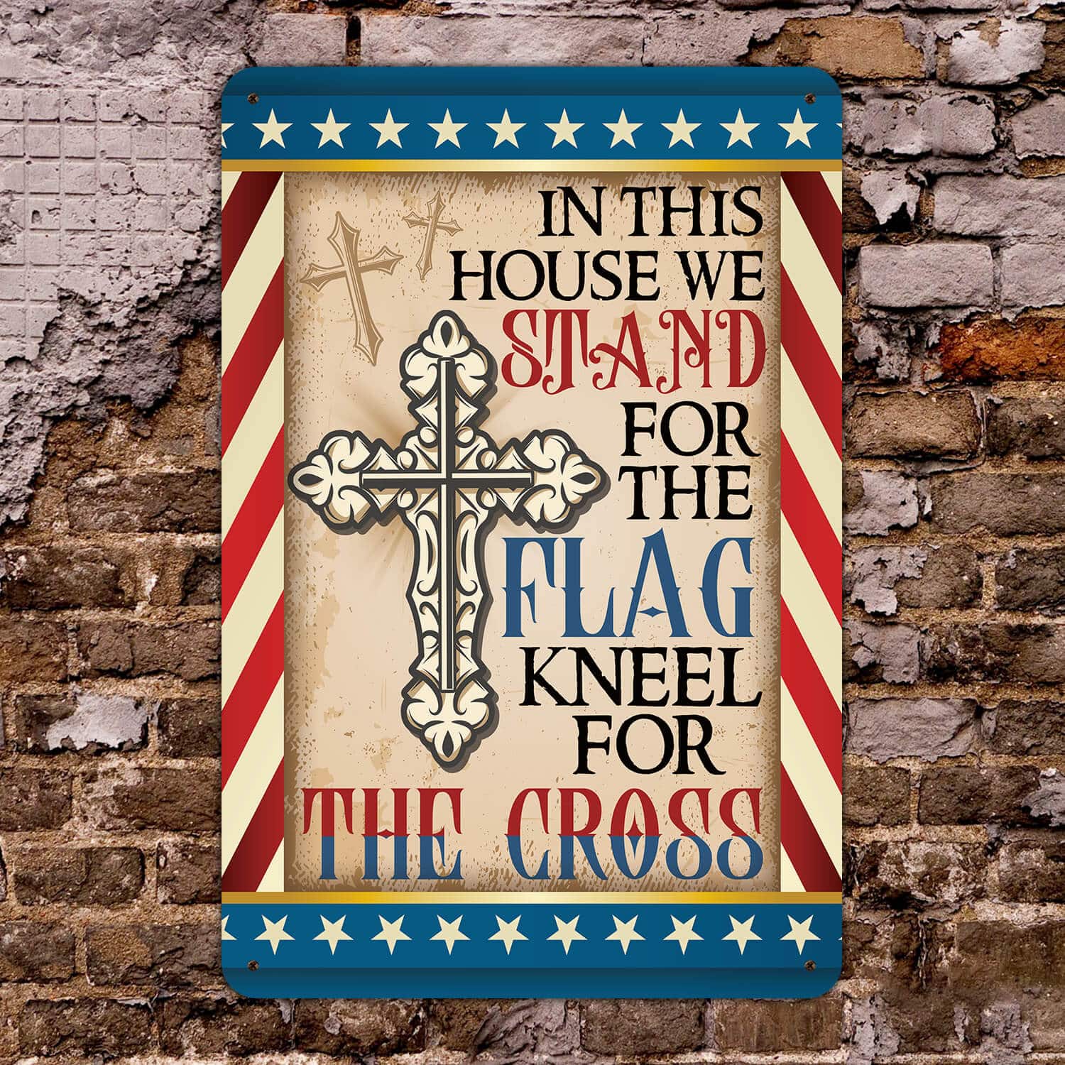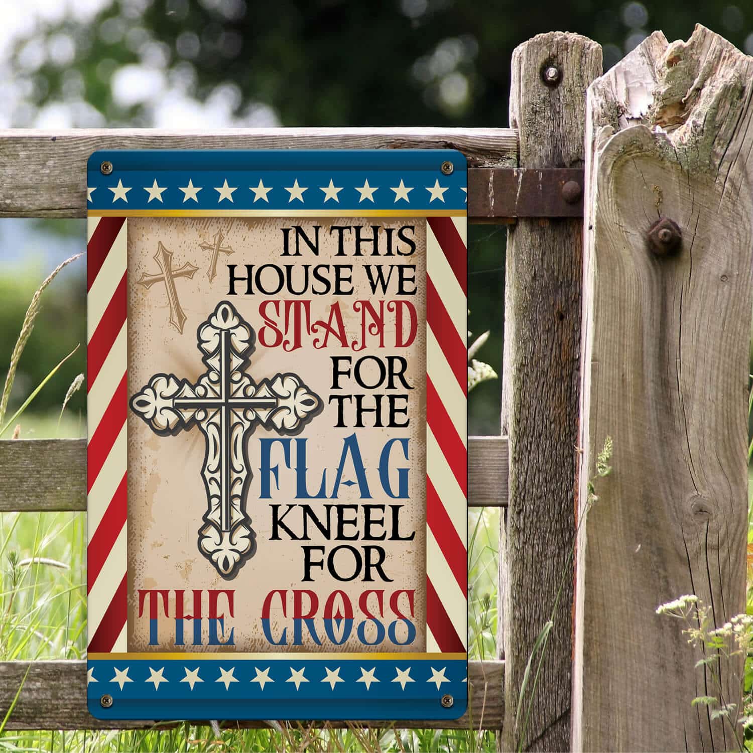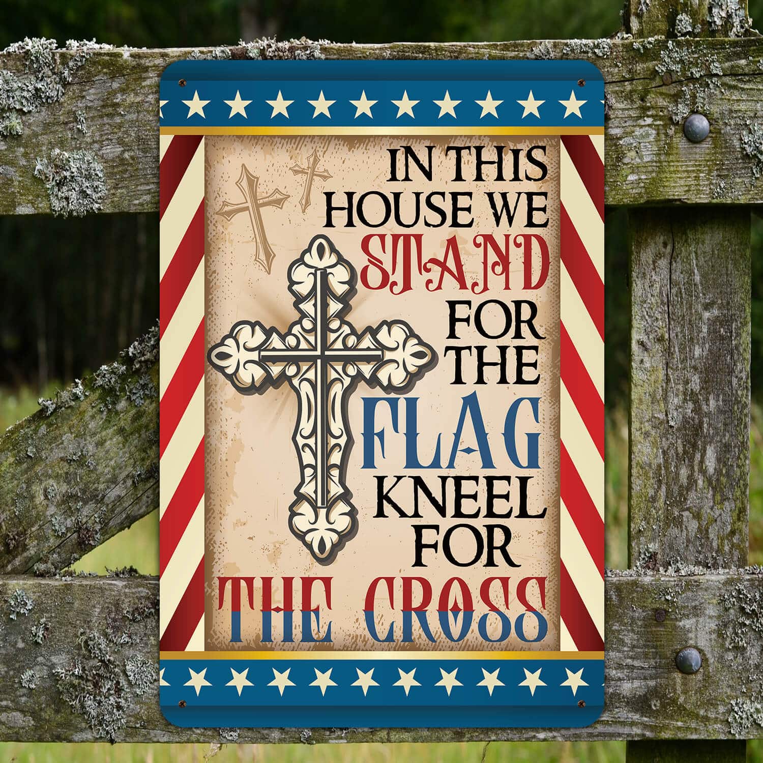 Let’s Shop In This House We Stand For The Flag And Kneel For The Cross Decorative Metal Sign – Decor Farmhouse!