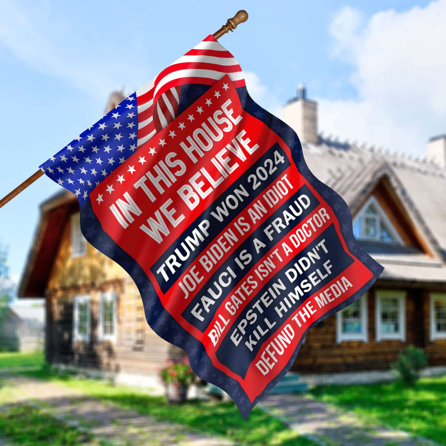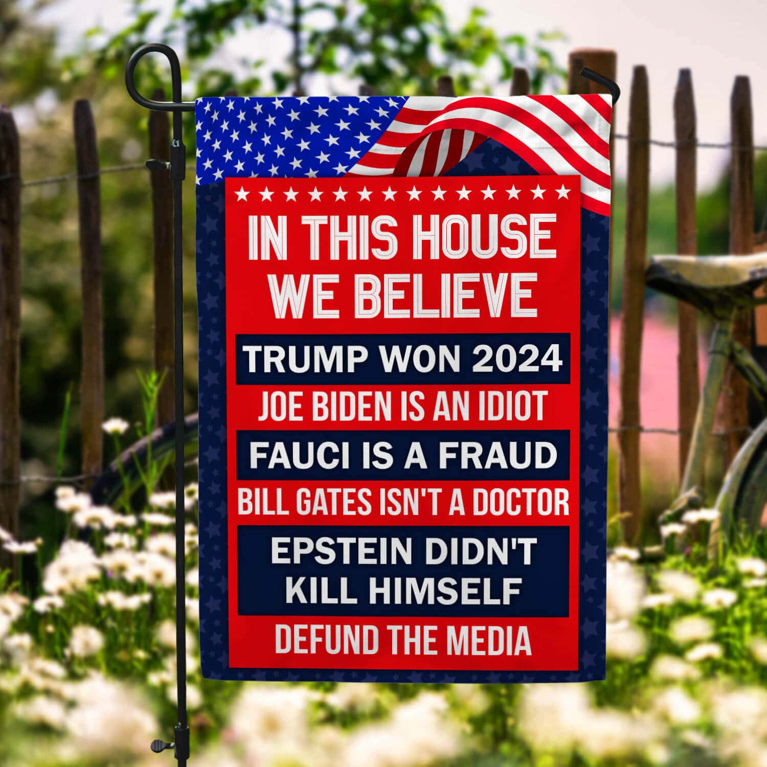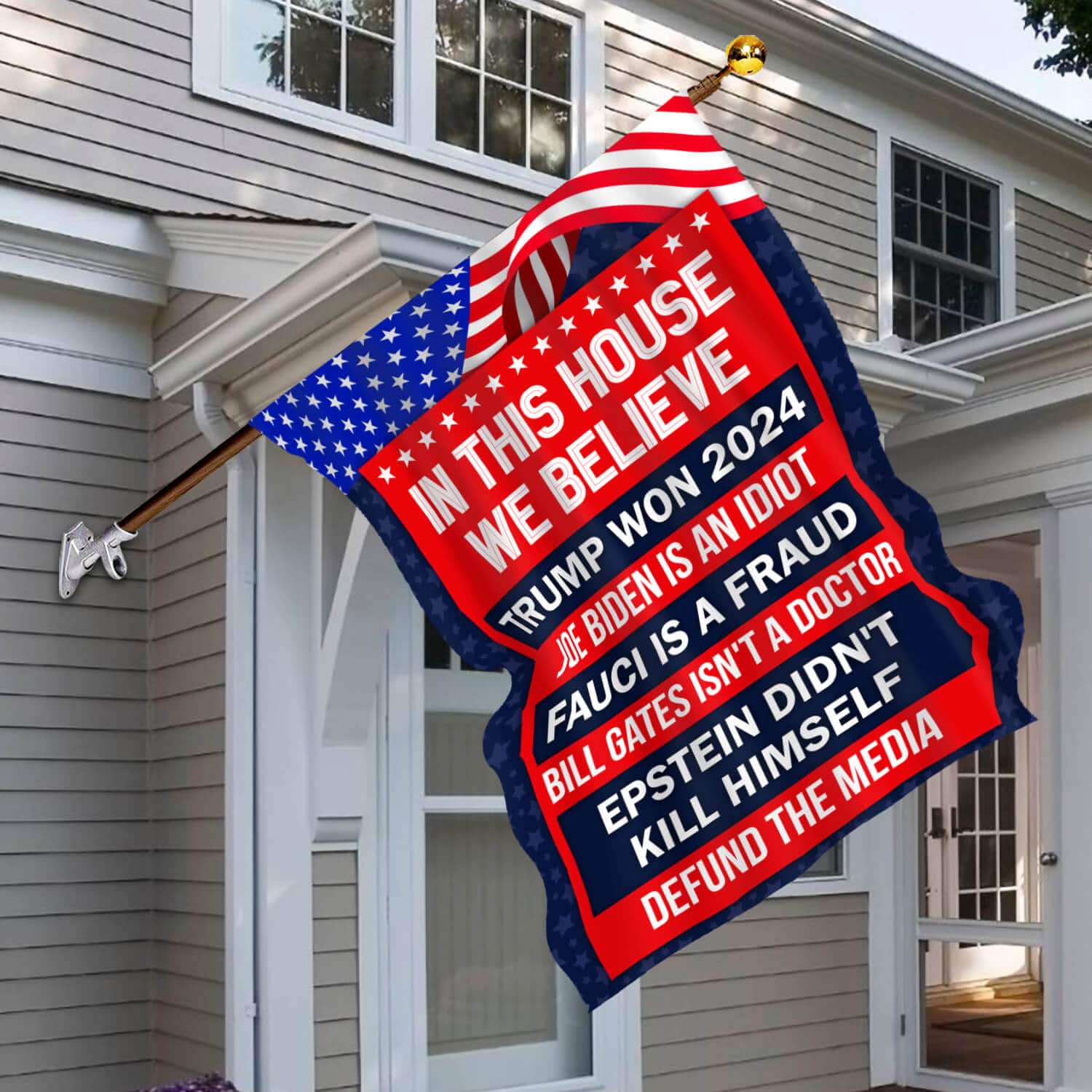 Are you spending too much time to find creative merchandise for you or suitable & special gifts for your mommy, your daddy, your son, your daughter, your children, your friends or someone you love? The struggle is over because we have various In This House We Believe Trump Won, In This House We Believe Trump Won Flag, Joe Biden Is An Idiot Flag, Fauci Is A Fraud, Bill Gate Isn’t A Doctor, Epstein Didn’t Kill Himself, Defund the Media, Pro Trump Flag, Trump Won 2024 Flag, Anti Biden Flag which will make perfect presents for your beloveds. In order to make your present stand out, we have created lots of unique and awesome customized photo gifts & personalized designs.